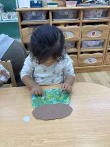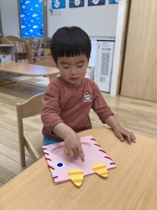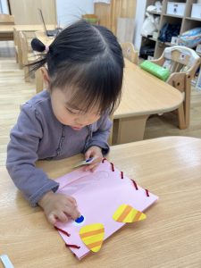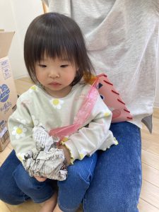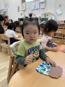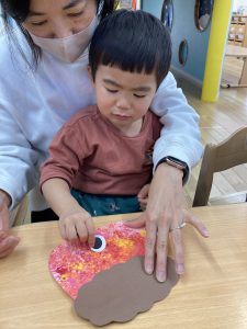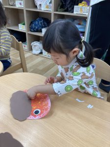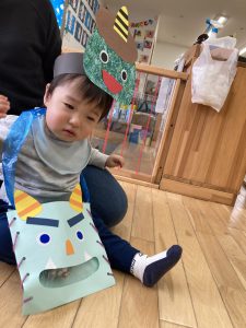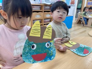 お面は新聞紙に絵の具をつけて色を付けました♪