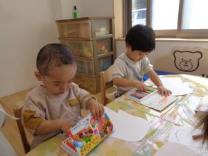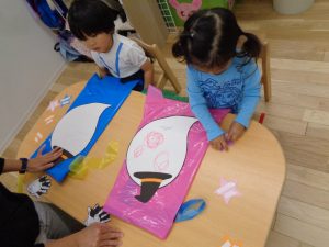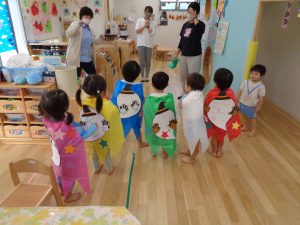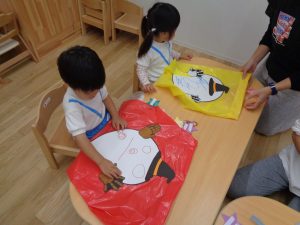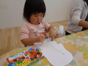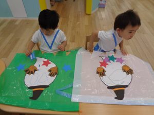 こぐま組さんはハロウィンで着るマント作りです。
