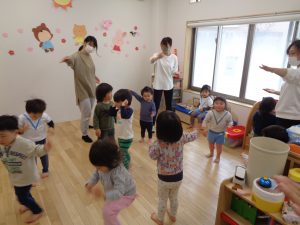 まずは、朝の体操から。今日もみんな元気いっぱいです。