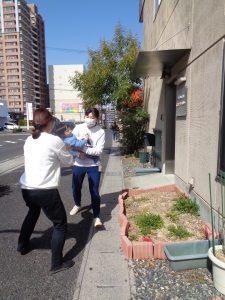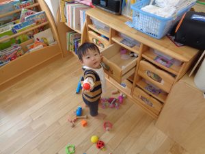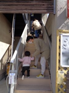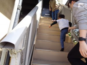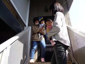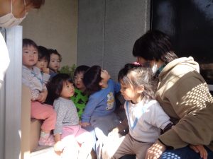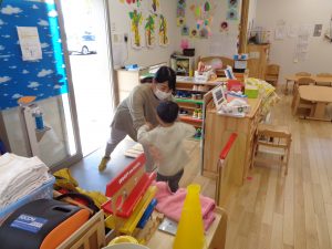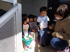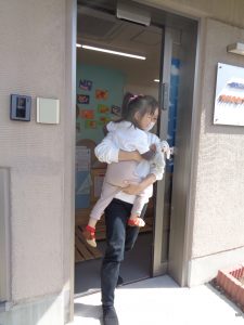 ひよこぐみさんは先生に抱っこしてもらって避難します