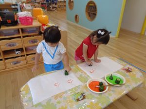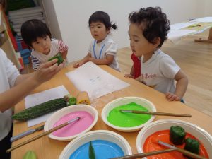 ゴーヤやレンコン、ピーマンなど「どんな匂いがするのかな?」「どんな形?」と興味津々の子ども達。