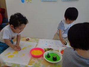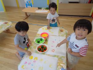 レンコンやゴーヤ、自分の好きな野菜を選んでスタンプします。
