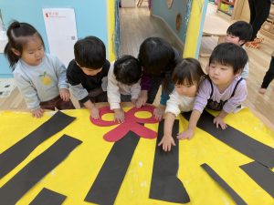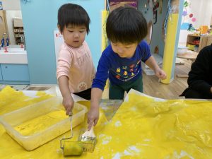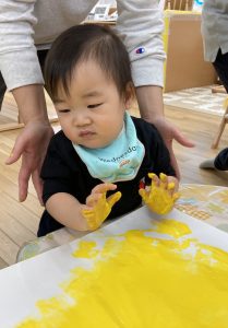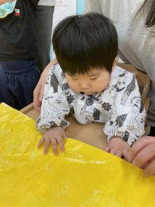 まずは大きな紙に黄色い絵の具を