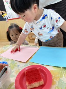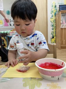 今年度はじめての制作2022年4月14日(木) 今日は初めて絵の具で制作をしました! 手に絵の具をぬって手型をとりました。 プチプチでスタンプもしました。 これから何が出来るかお楽しみに!! « 4月のお誕生日会 楽しいね! »