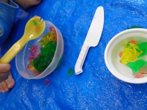 ゼリーをすくって遊んだり、まぜまぜしたり