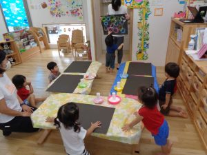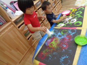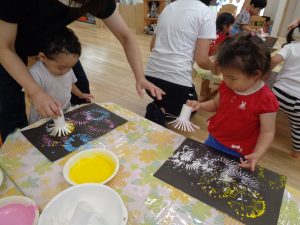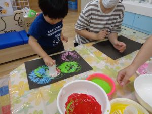 今日は画用紙に絵の具で花火を描きます