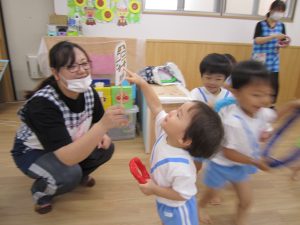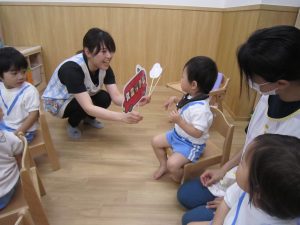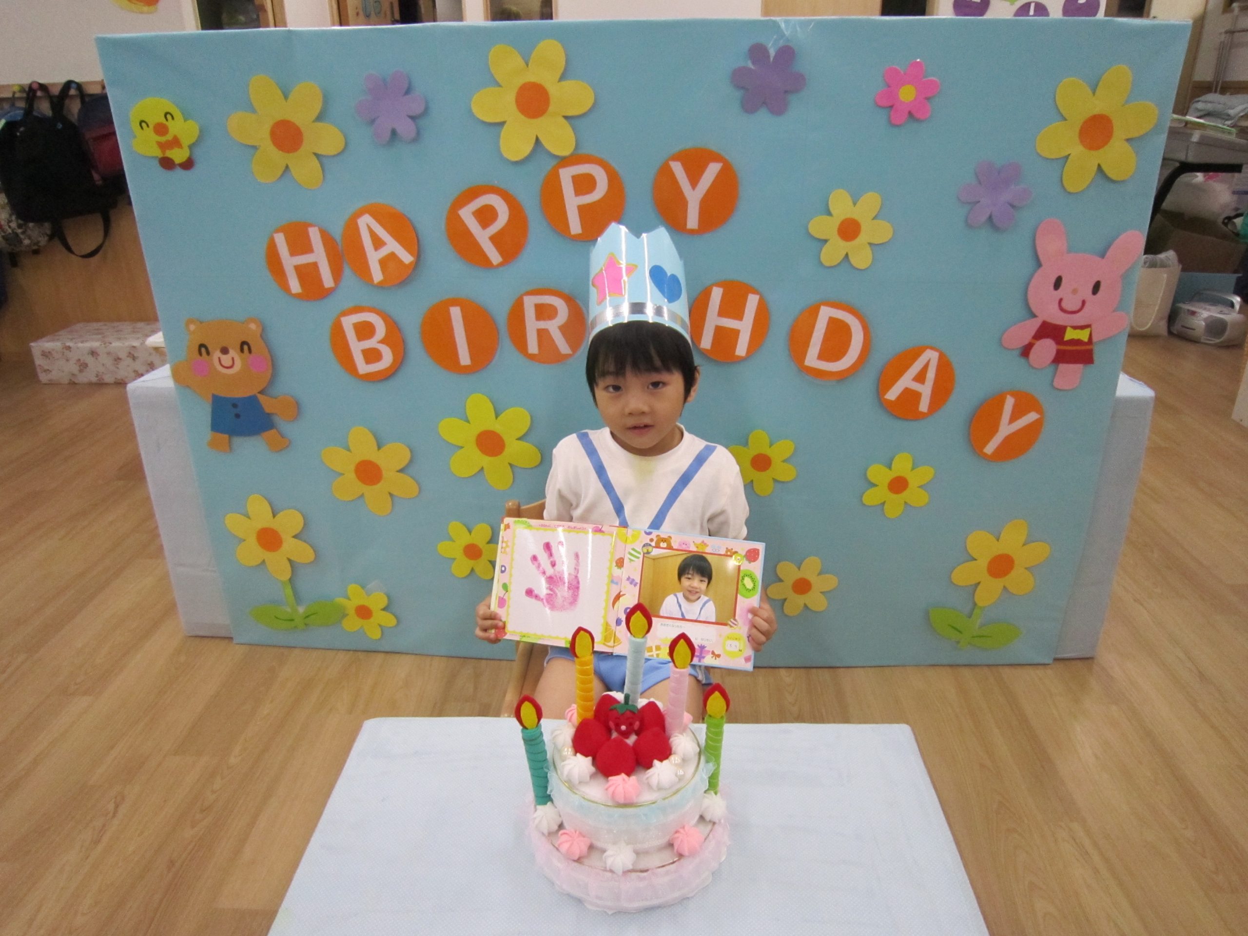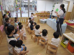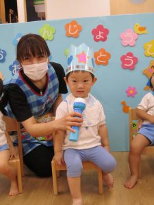 4月、5月はコロナウイルス感染拡大防止の為、家庭保育協力をお願いしていたこともあり登園人数も少なかったので、誕生会はみんな一緒に友達のお祝いをしたいこともあり、6月に4月、5月生まれの誕生会をしました。