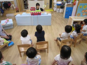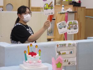 8月の誕生日会では子ども達のだいすきな“はたらくくるま”のペープサートをみました。