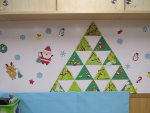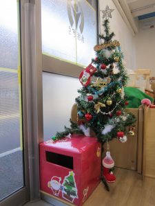 大型壁面(12月6日)もツリーの飾りつけ(12月9日)も完成しました🎵