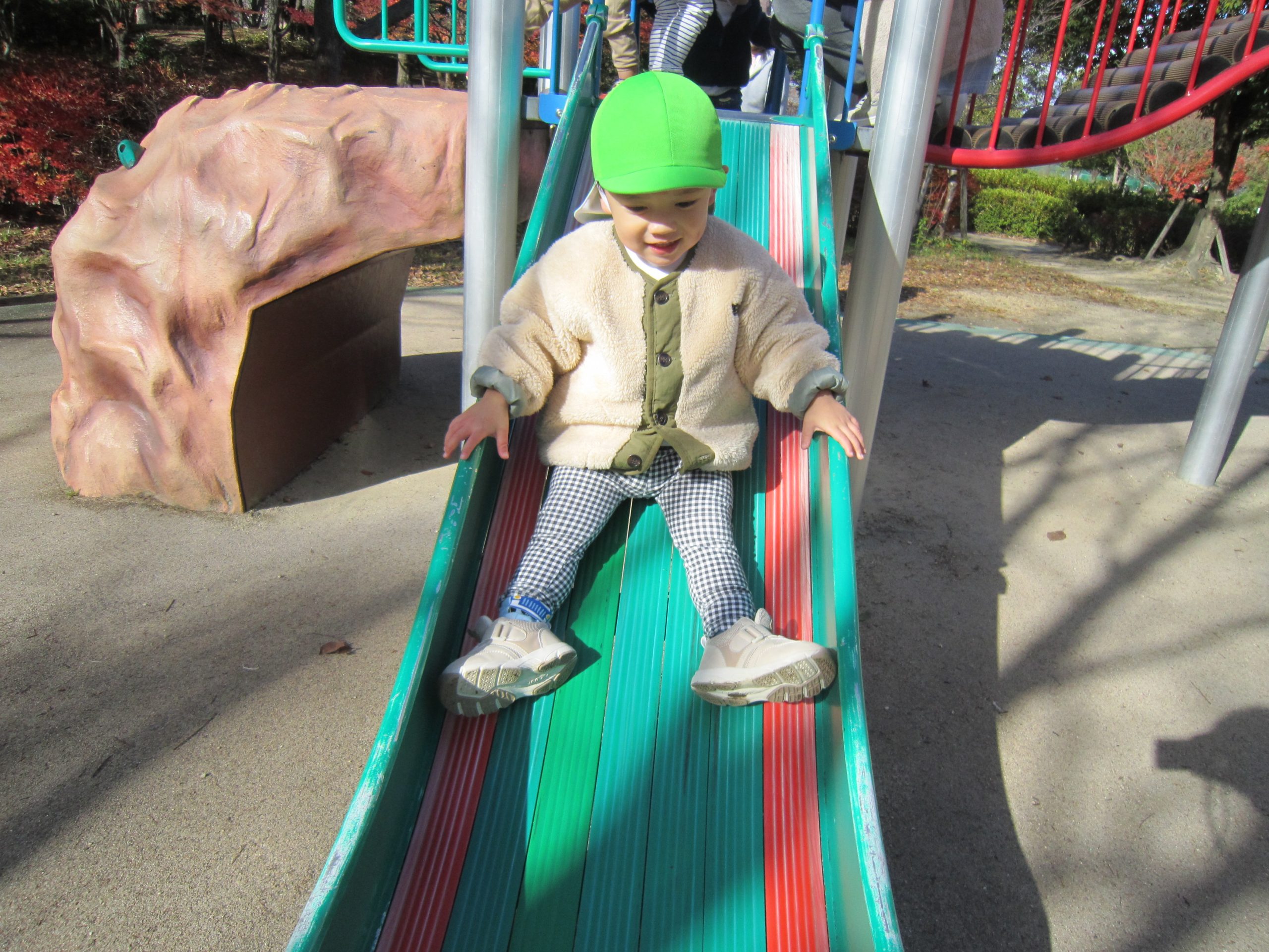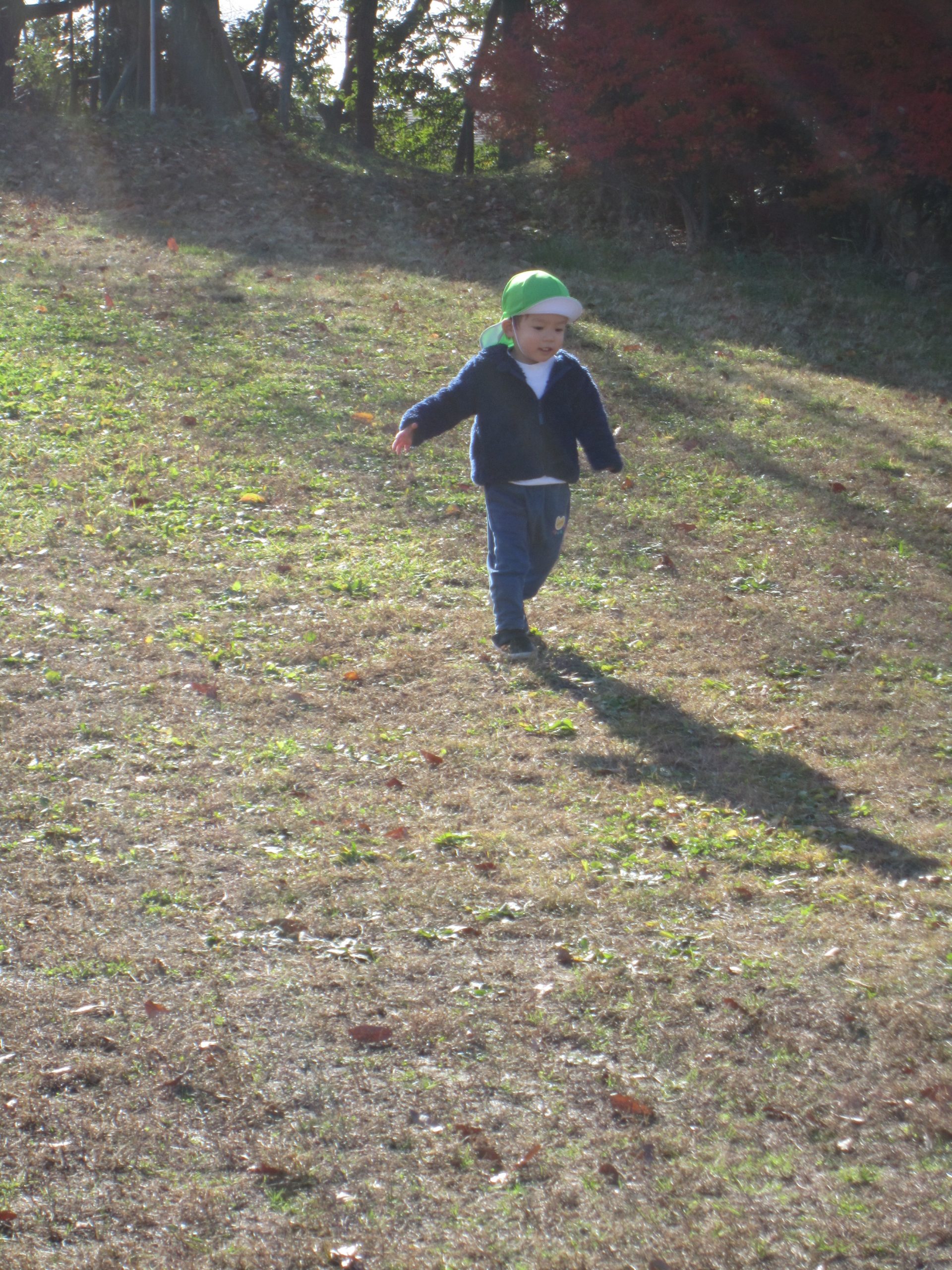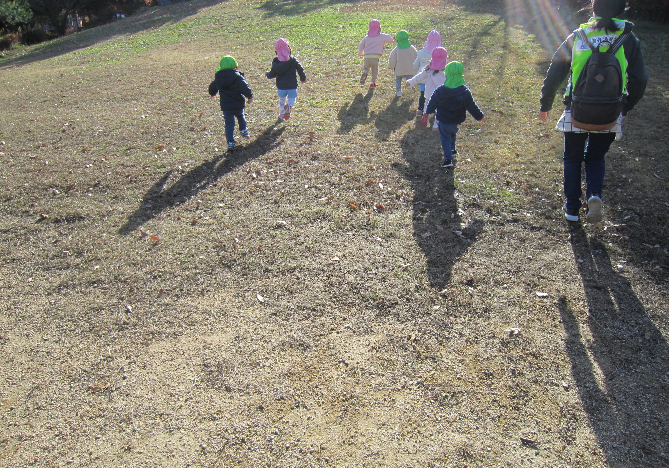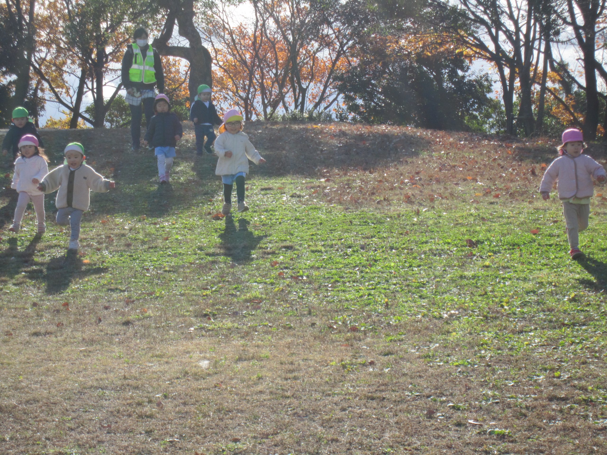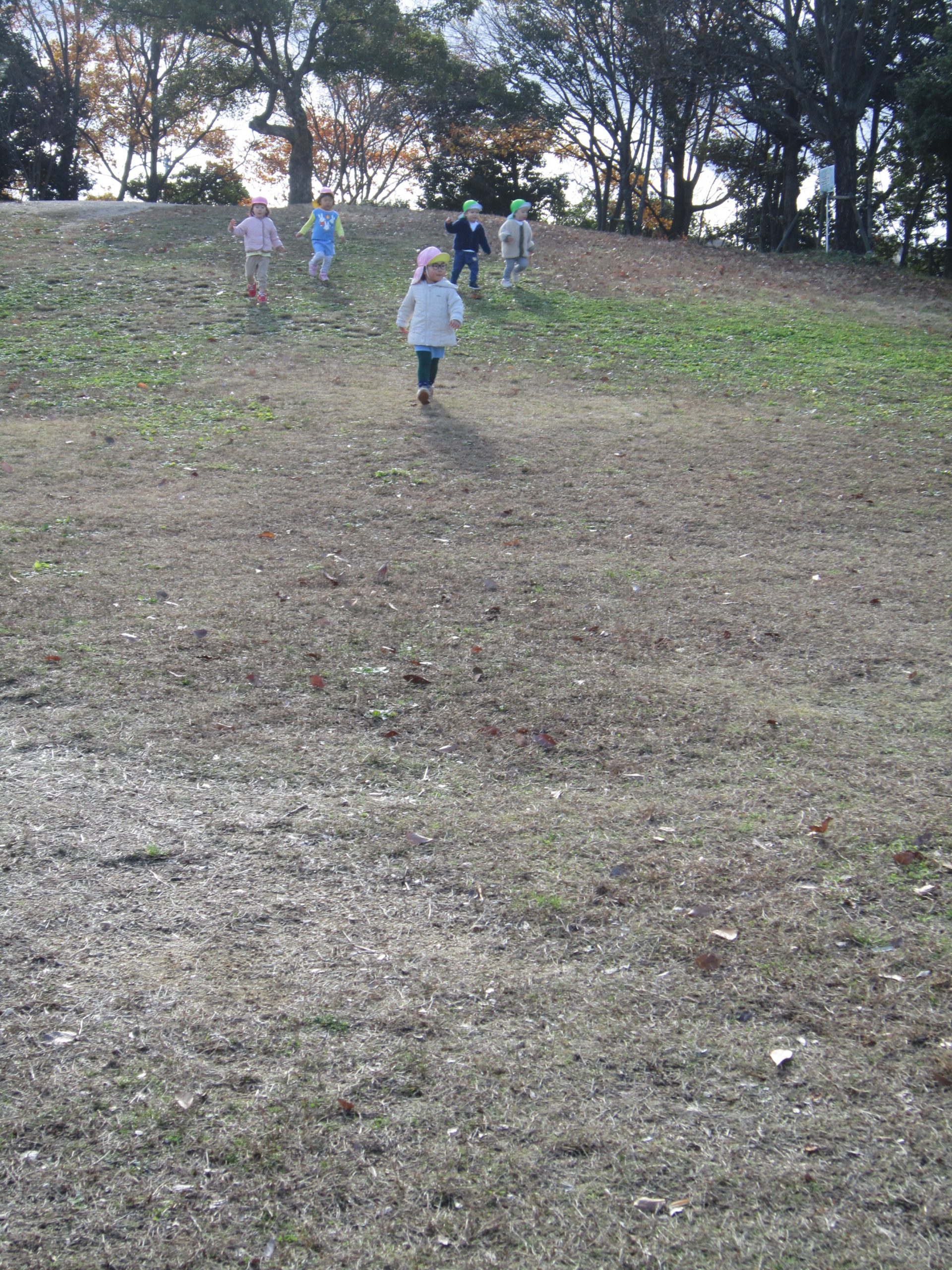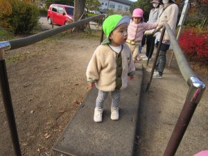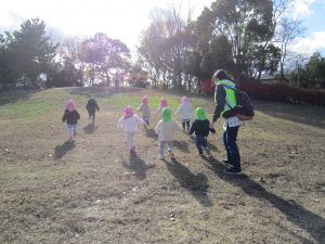 ふれあい公園 うさぎ組 こぐま組 2022年12月14日(水) 今日は、ふれあい公園へ行きました♪ 久しぶりにふれあい公園へ行くので子ども達は「どんぐり落ちてるかな・・?」と言って思い思いにお話を楽しみながら公園へ向かいました🎵 公園に着くと早速芝山を走りました🎶 走り終わった後は、公園の周りを歩きました❕ すると、歩ける所を見つけ・・・1人ずつ歩いてみました❕ その後、滑り台で遊んでから帰ってきました🎵 楽しかったね🎶 また行こうね🎵 « 12月のお誕生日会🎶 クリスマスの準備🎶 »