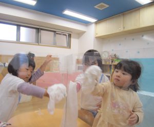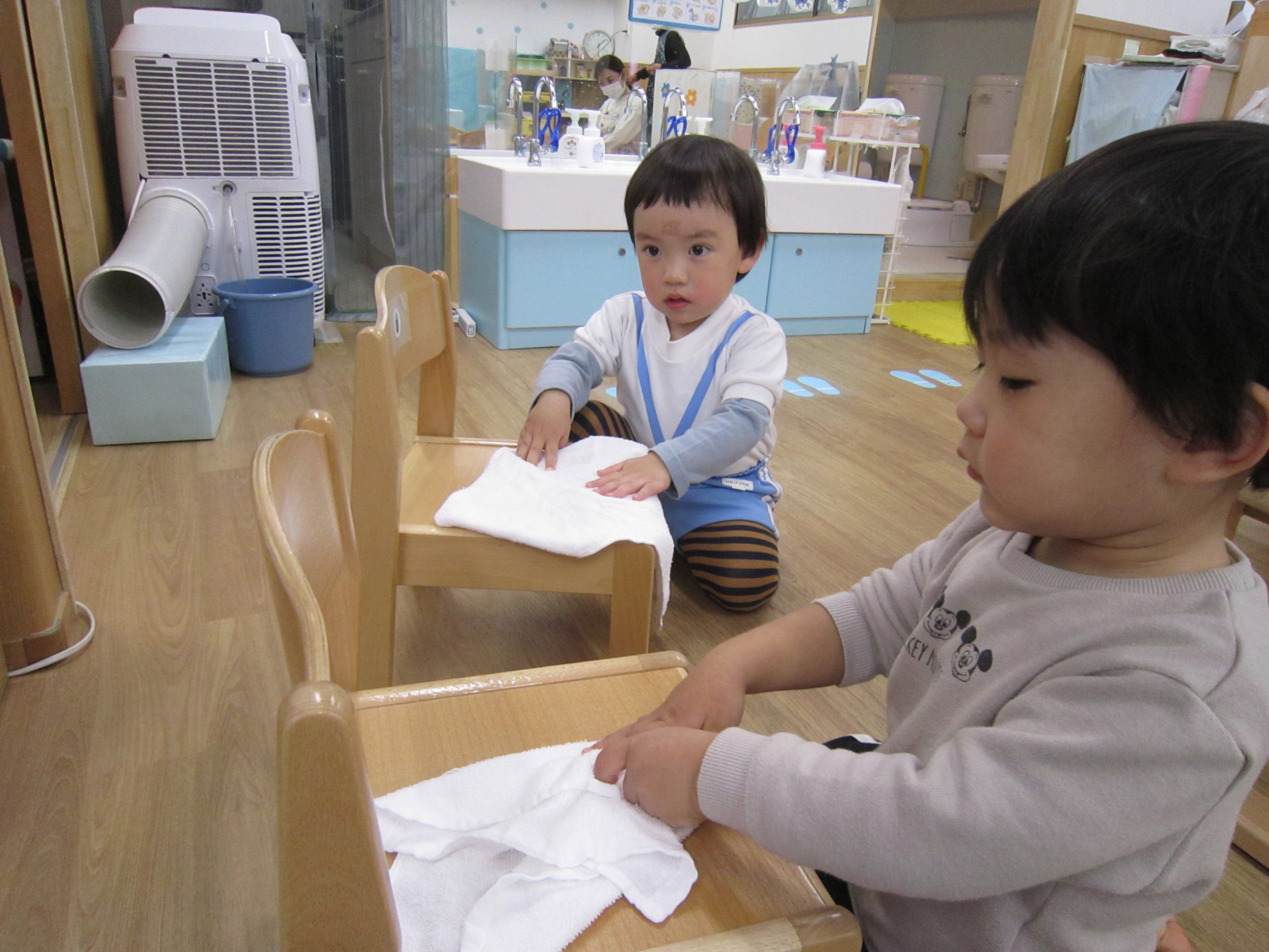 色々なところを拭いていくと子ども達の方から「ここも拭くの?」「ここは?」と言って、どんどん拭いて奇麗にしてくれました🎶