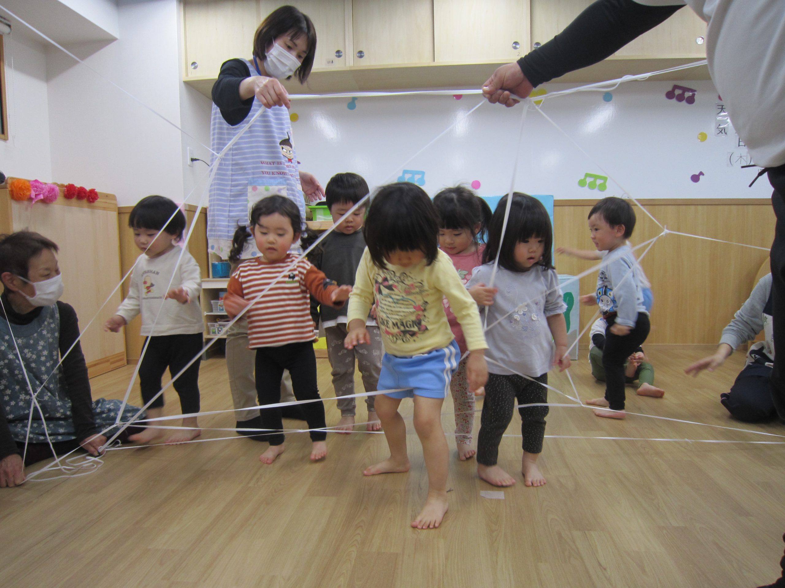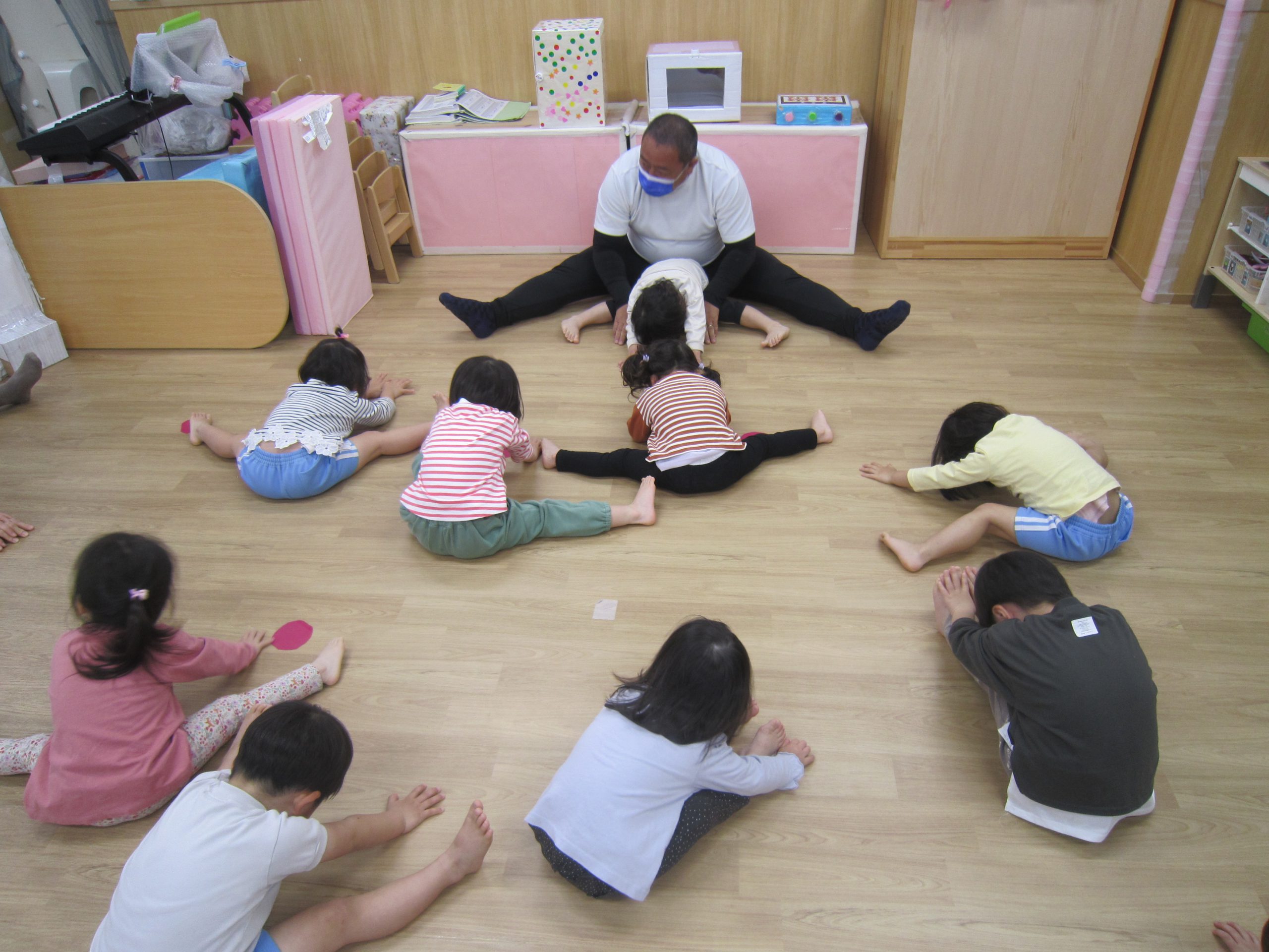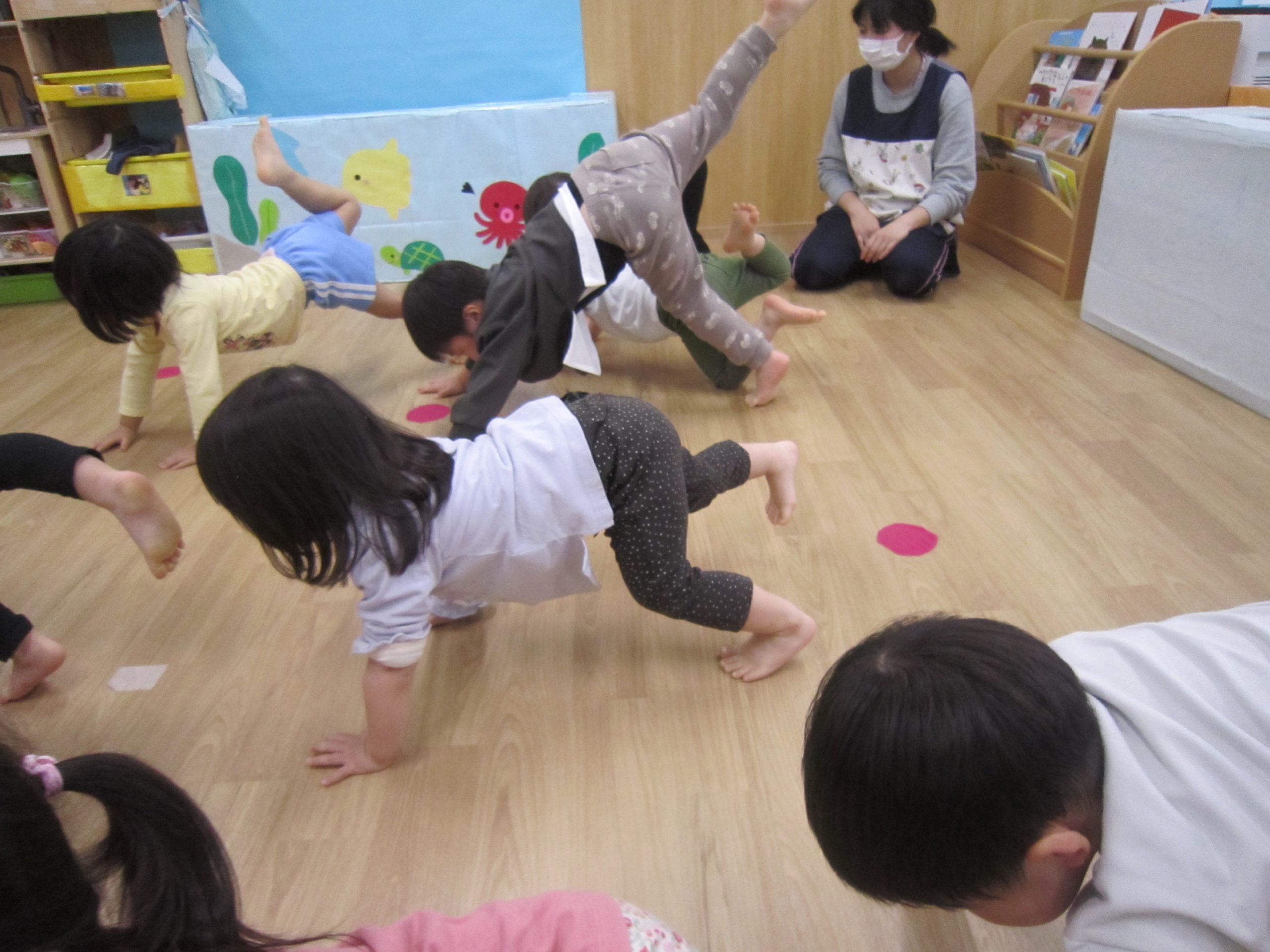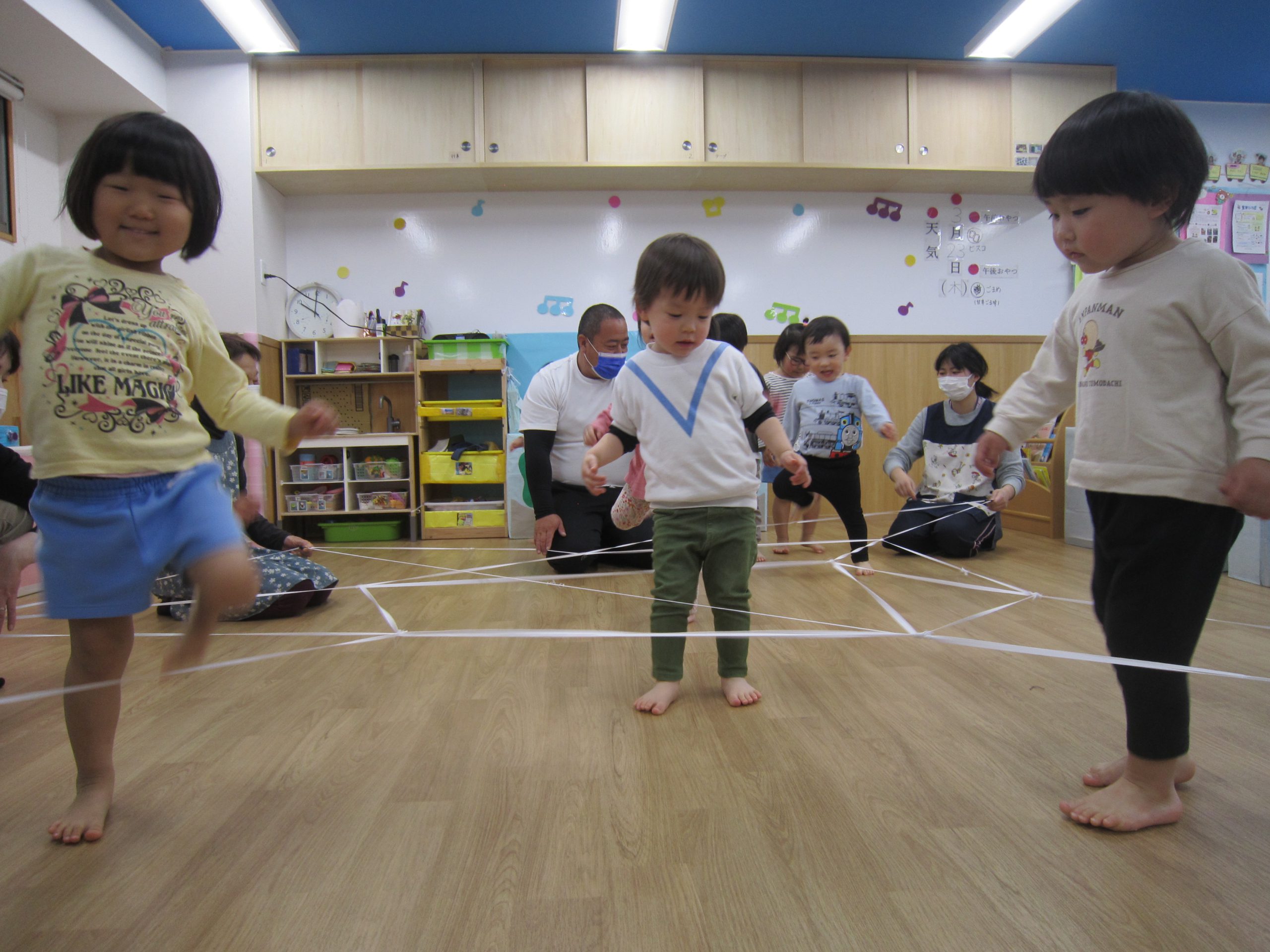 今年度最後の体操教室🎶2023年3月23日(木) 今年度最後の体操教室です♪ まずは、ご挨拶から始まります🎵 その後は、準備体操です🎶 さぁ始まるよ❕ 走るよ~ ゴムで作った、クモの巣です🎵 ボール遊び🎶 バルーン♬ 最後にこぐま組さんから梶谷先生へ感謝の気持ちを込めて・・ 汗もいっぱいかいたね 「あ~楽しかった🎶」と、子ども達の声が聞こえてきそうです🎵 « お別れ会♪ 電車に乗ったよ🚉 »