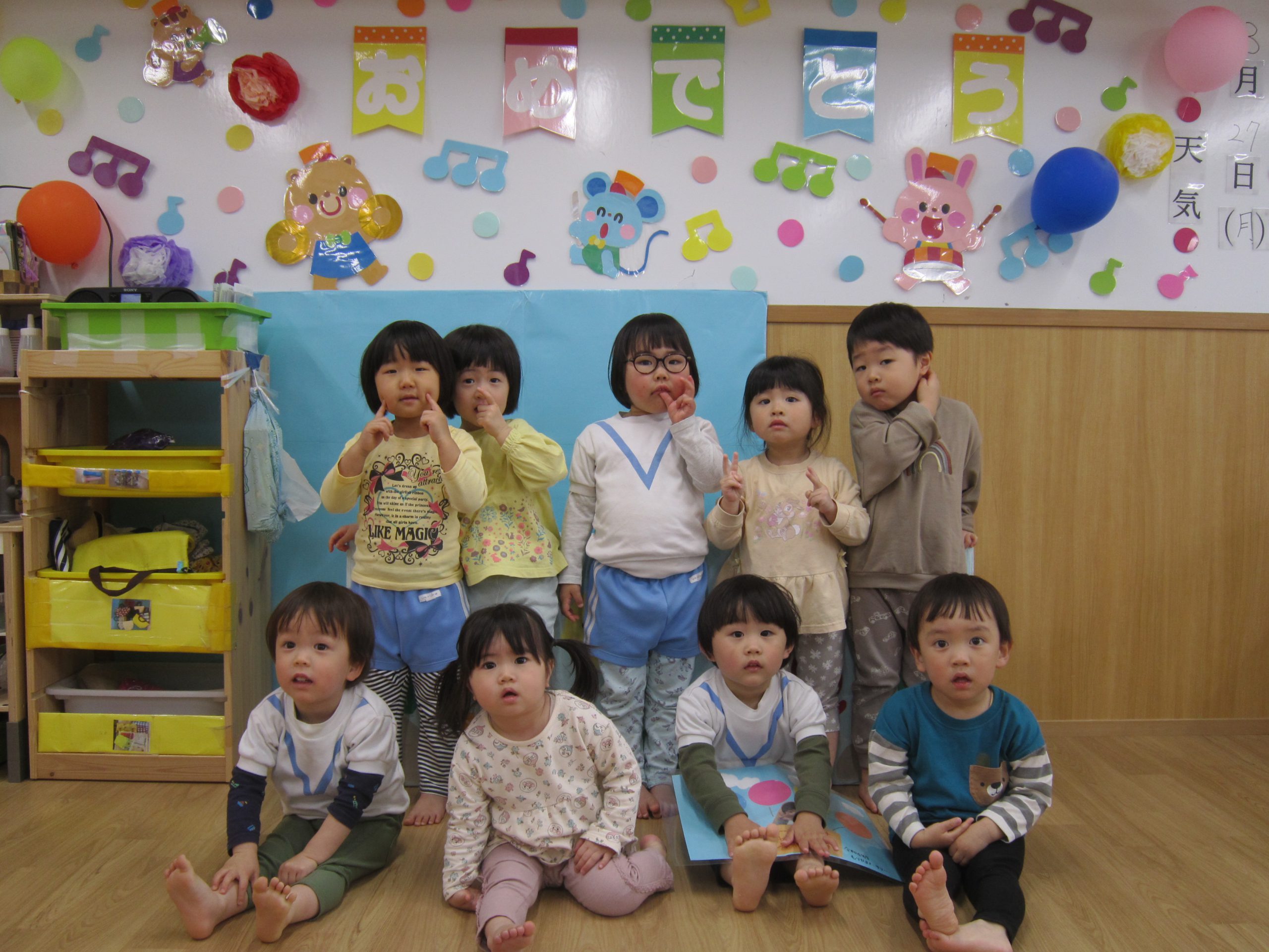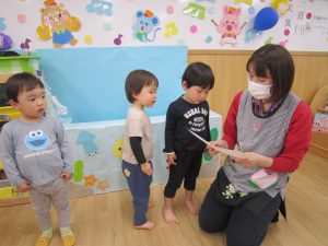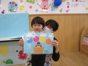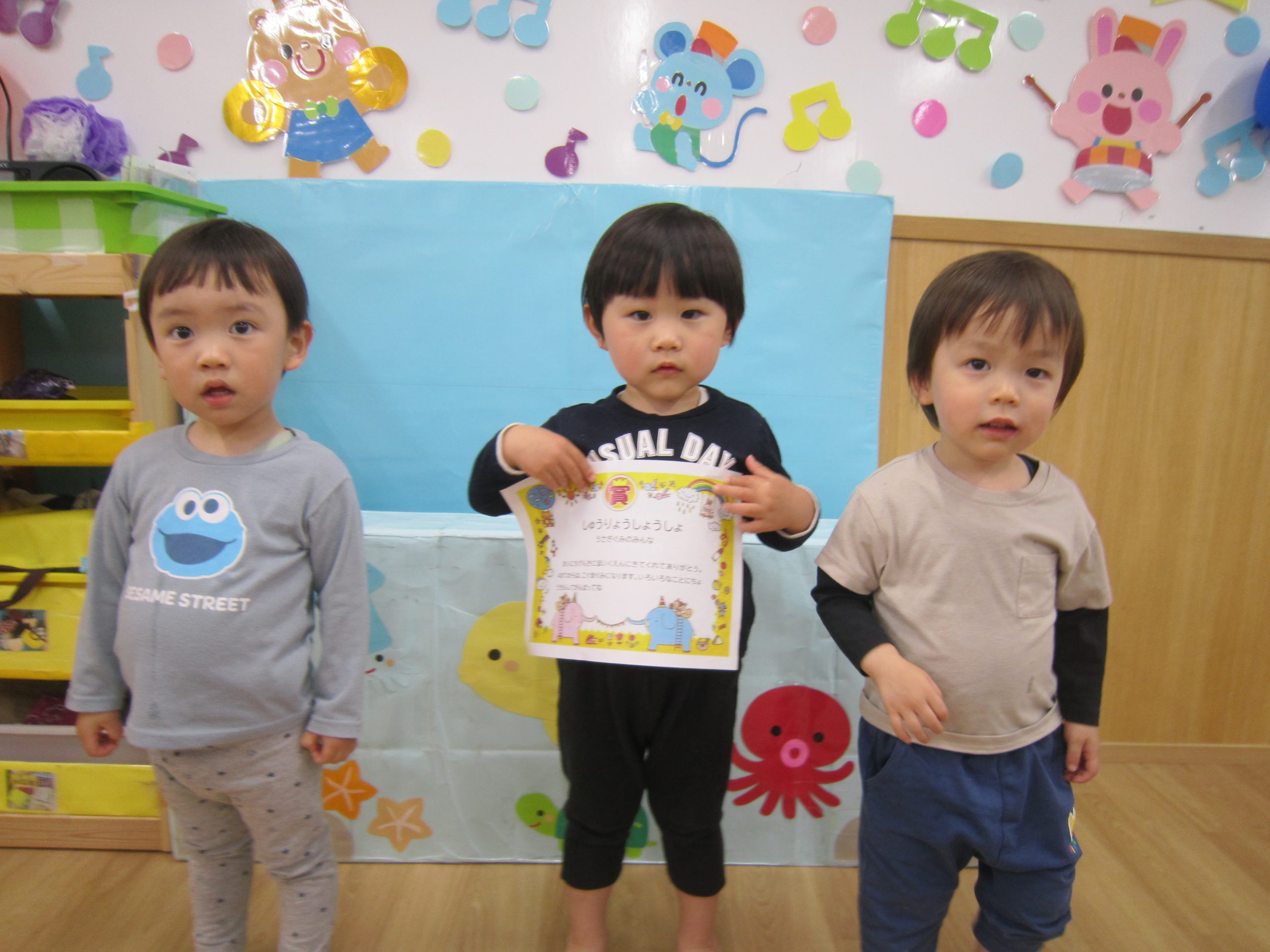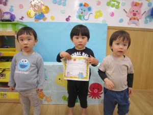 修了式&お別れ会 ひよこ組・うさぎ組2023年3月27日(月) 今日は、ひよこ組・うさぎ組の修了式と転園する友達のお別れ会がありました🎵 まずは、保育者からの出し物の“イグアナレストラン”のパネルシアターを見ました♬ その後、転園する友達にプレゼントを渡しました🎶 まだ歩けなかったひよこ組の時から、ずっと見てきたのでお別れするのは寂しいです・・💦 31日までナーサリーに来てくれるので、まだまだたくさん遊ぼうね♪ みんなで“はいチーズ” その後、ひよこ組・うさぎ組は修了証書を渡してもらいました♬ 修了おめでとうございます。 4月からは、新しい友達とたくさん遊ぼうね♬ « ㊗入園式🎶 ㊗卒園式🎵 »