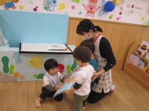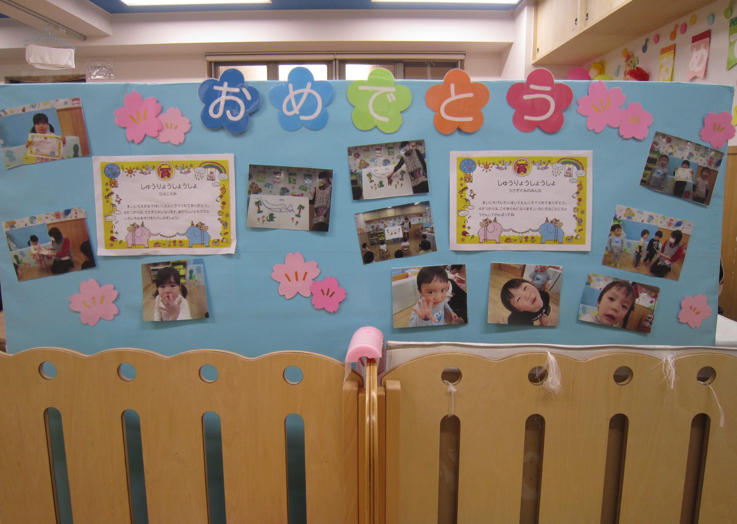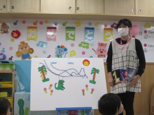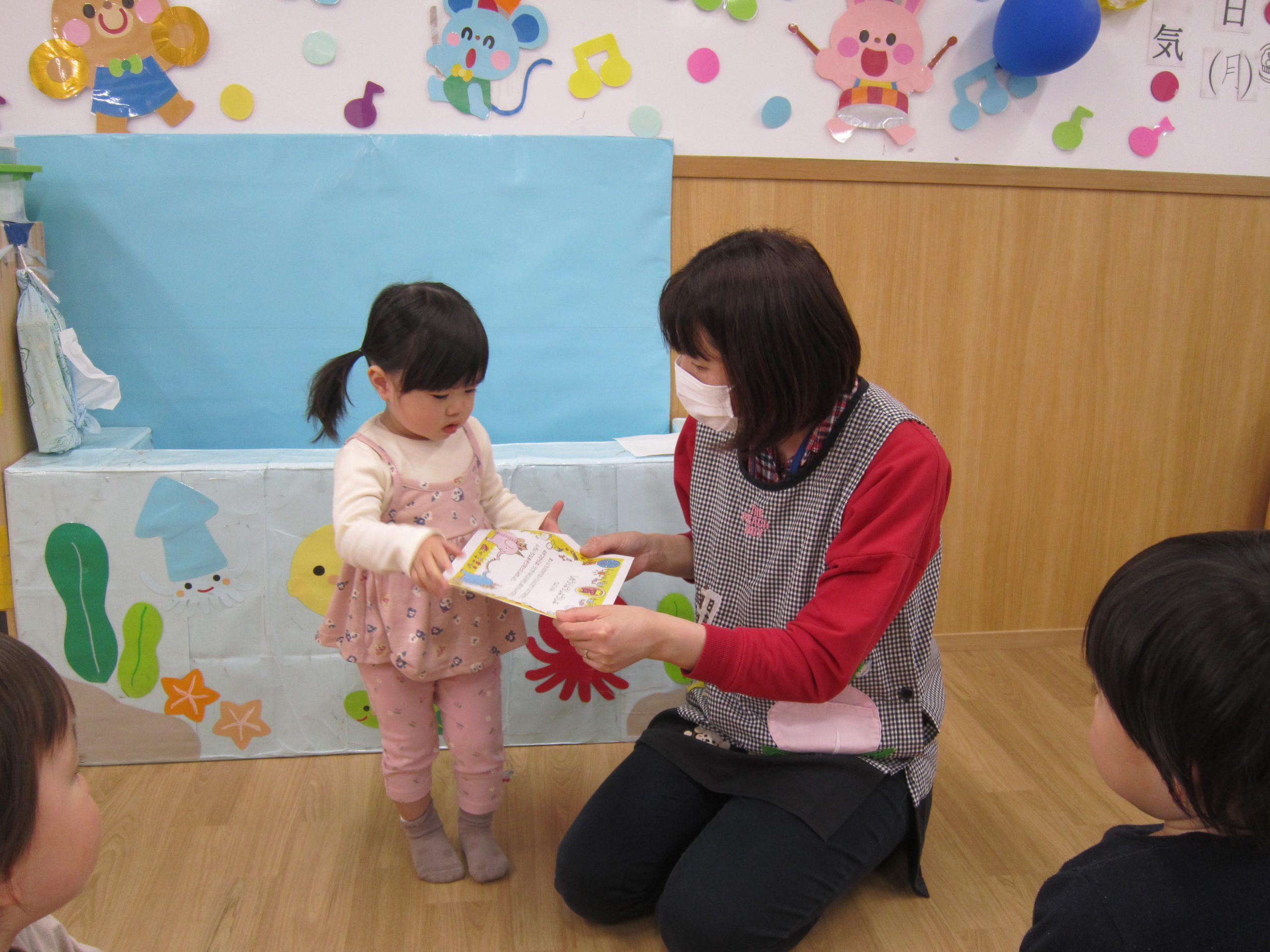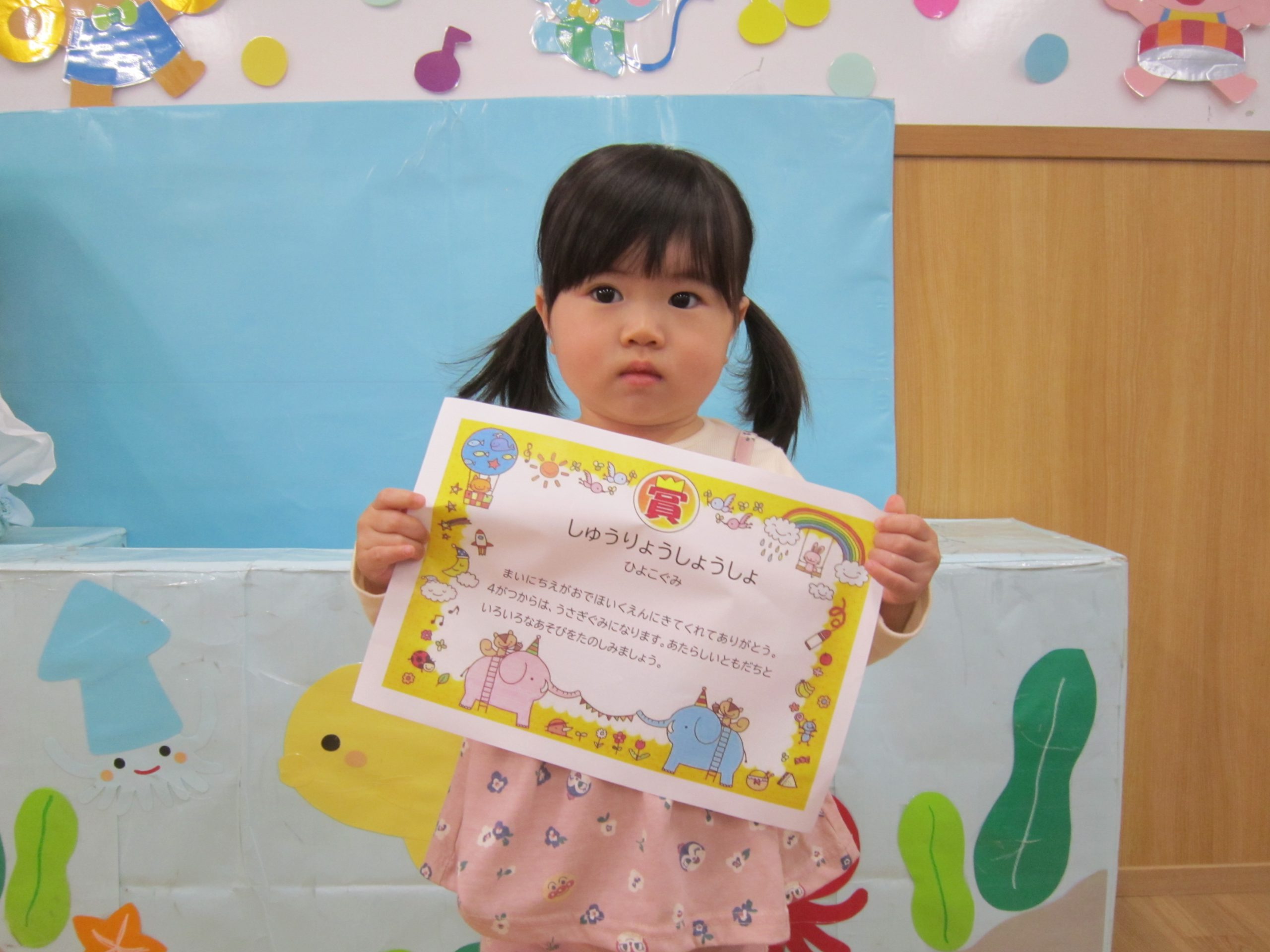 修了式&お別れ会 ひよこ組・うさぎ組2023年3月27日(月) 今日は、ひよこ組・うさぎ組の修了式と転園する友達のお別れ会がありました🎵 まずは、保育者からの出し物の“イグアナレストラン”のパネルシアターを見ました♬ その後、転園する友達にプレゼントを渡しました🎶 まだ歩けなかったひよこ組の時から、ずっと見てきたのでお別れするのは寂しいです・・💦 31日までナーサリーに来てくれるので、まだまだたくさん遊ぼうね♪ みんなで“はいチーズ” その後、ひよこ組・うさぎ組は修了証書を渡してもらいました♬ 修了おめでとうございます。 4月からは、新しい友達とたくさん遊ぼうね♬ « ㊗入園式🎶 ㊗卒園式🎵 »