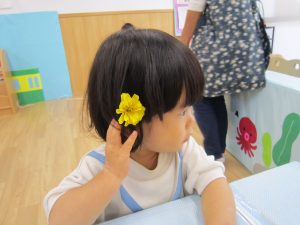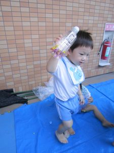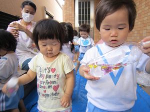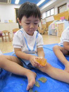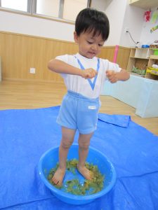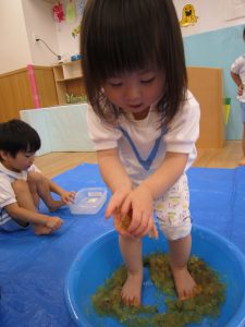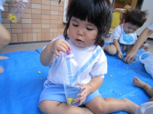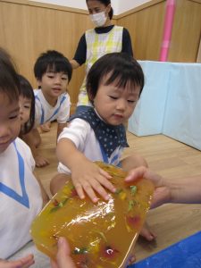 寒天あそび2020年9月9日(水) 昨日、ひよこ・うさぎ組がお花のジュースを作りました。 その前にお花を使って・・オシャレをしました。 その後、ジュース作り! まずは、ペットボトルに花を入れて 水を入れて・・・フリフリ 子ども達が帰った後、魔法をかけると・・・あら不思議!! お花の入った寒天が出来上がっていました。 ペタペタ 手でぐちゃぐちゃ 足でぐちゃぐちゃ 冷たくて気持ちよかった! また遊ぼうね!! « 制作 砂あそび PART2 »
