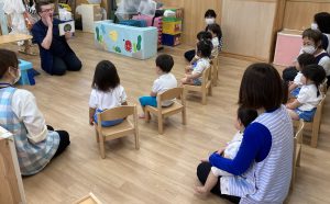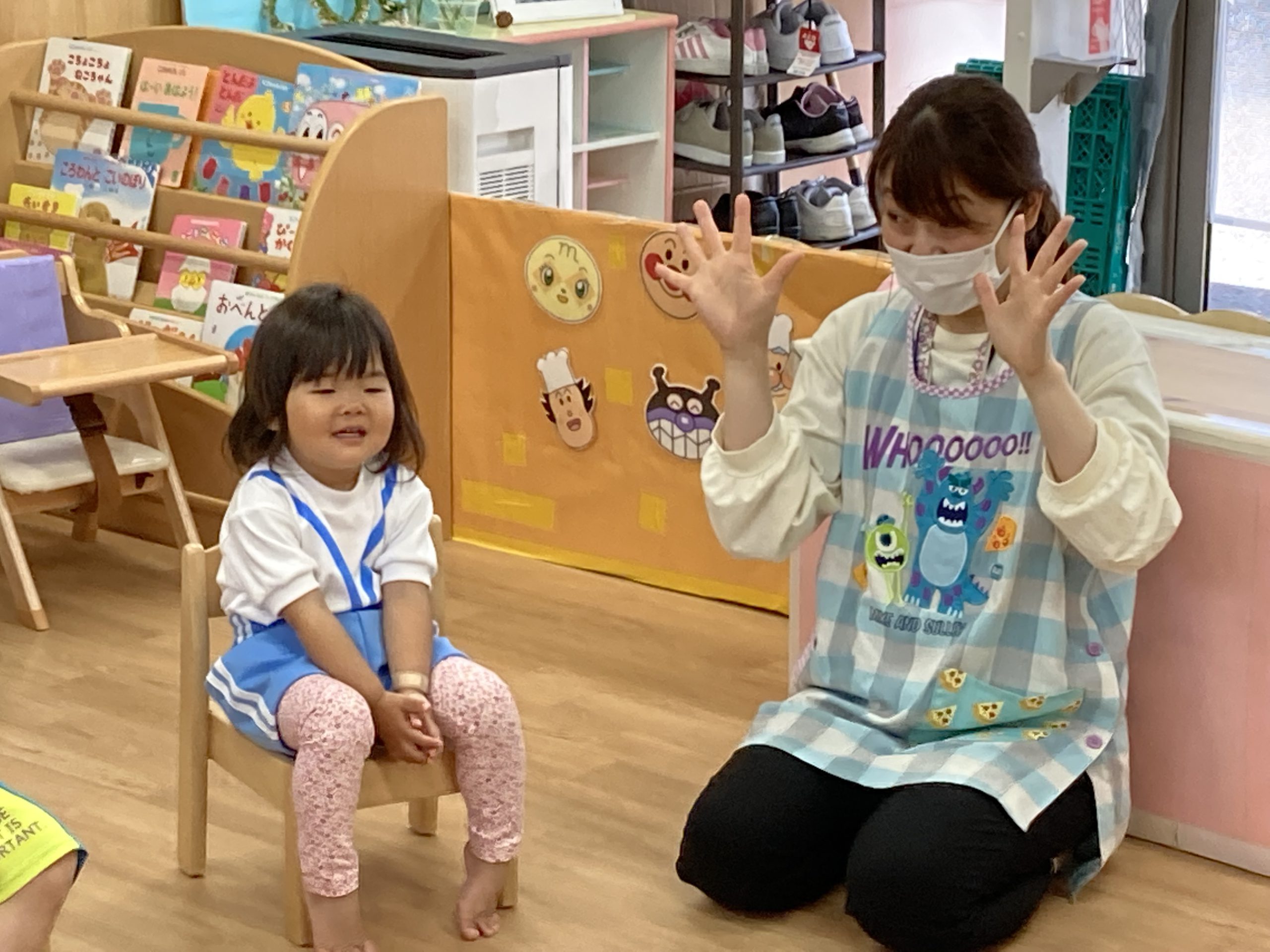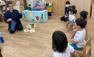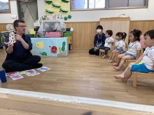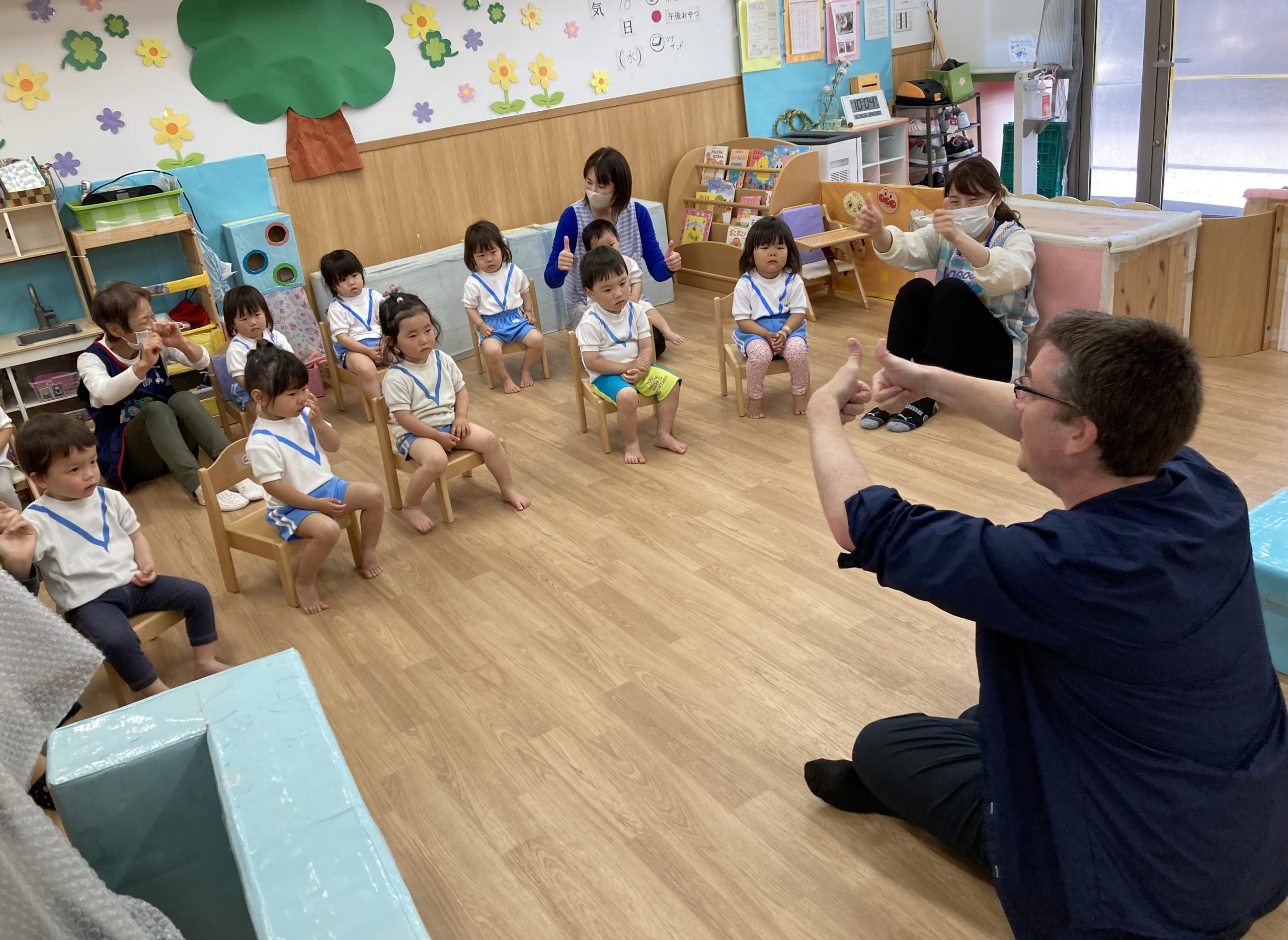 今年度初めての英語あそび🎶2023年5月10日(水) 今日は、今年度初めての英語あそびがありました🎶 ダニエル先生です🎶 さぁ~英語あそびの始まりです🎶 子ども達は緊張気味です❕ 初めて触れる英語に子ども達は少し戸惑っていましたが、少しずつ笑顔が見られました🎵 子ども達の笑顔にダニエル先生も喜んでいました🎵 果物に色、手遊びそして絵本の全てが英語でした♬ 来週の英語あそびもお楽しみに! « 今年度初めての体操教室♪ うの家 こぐま組 »