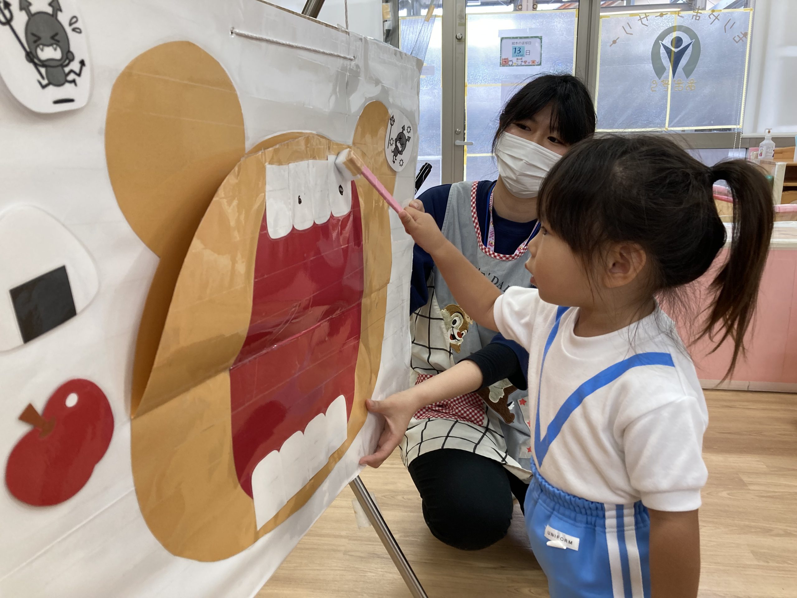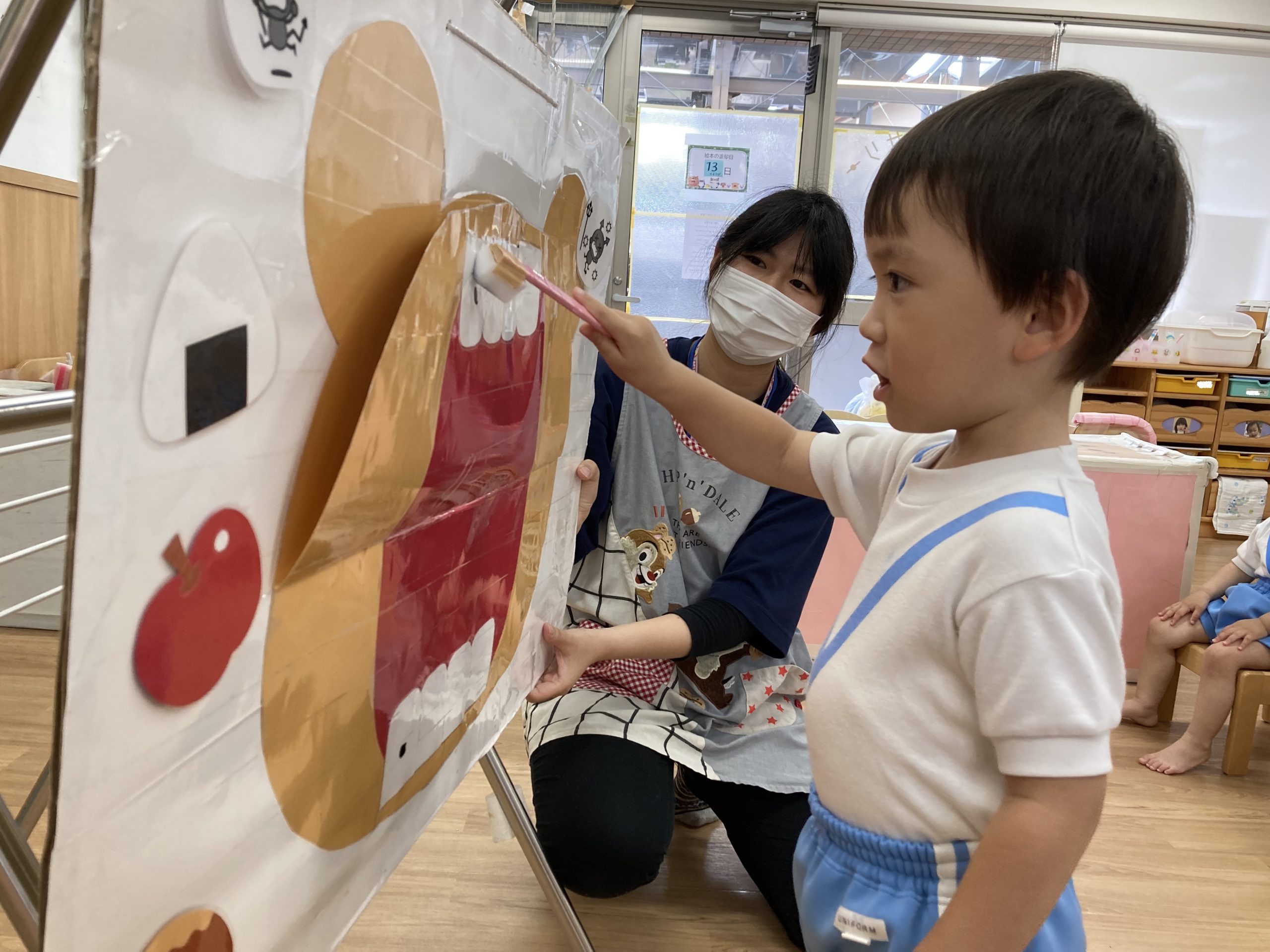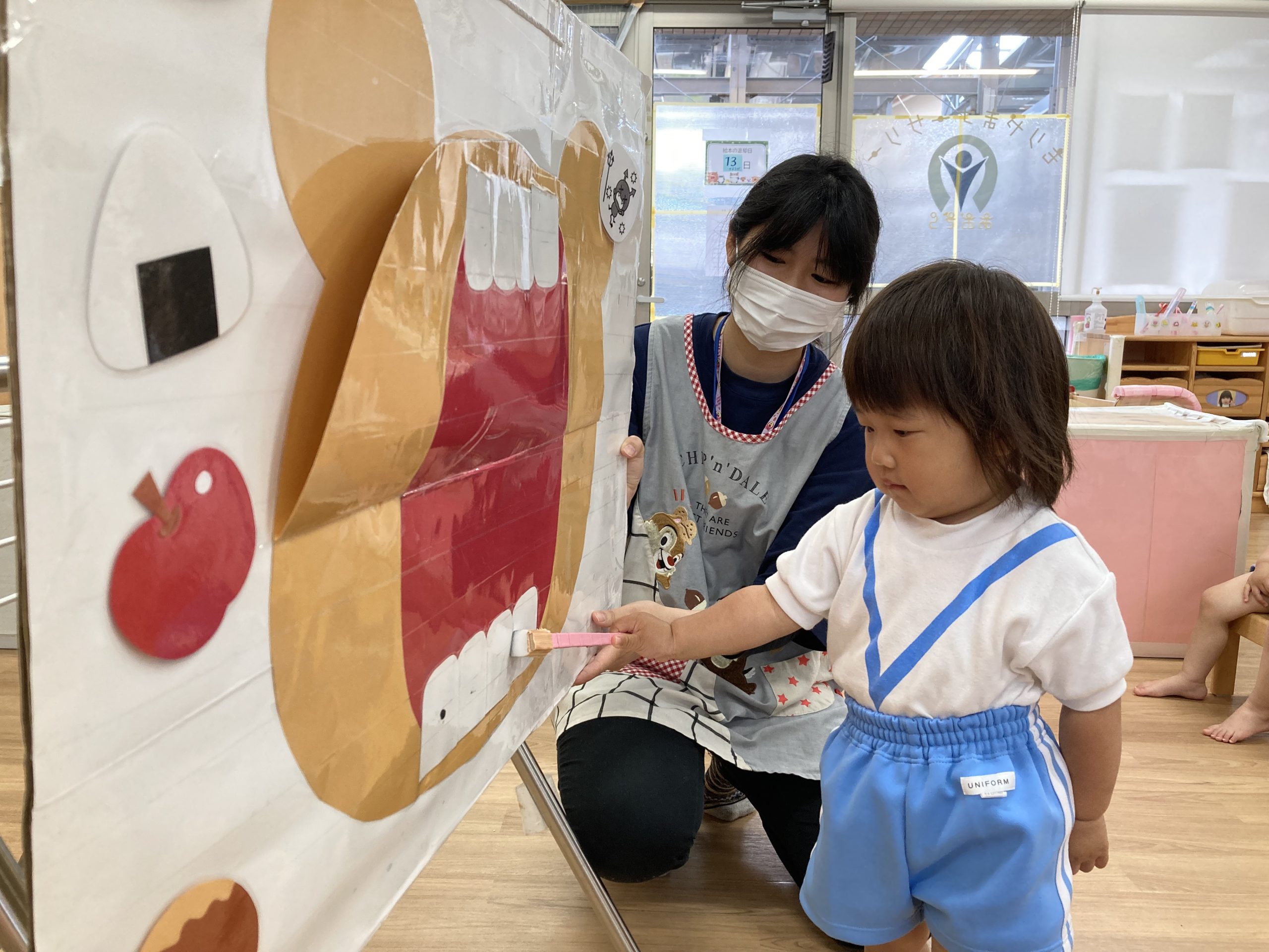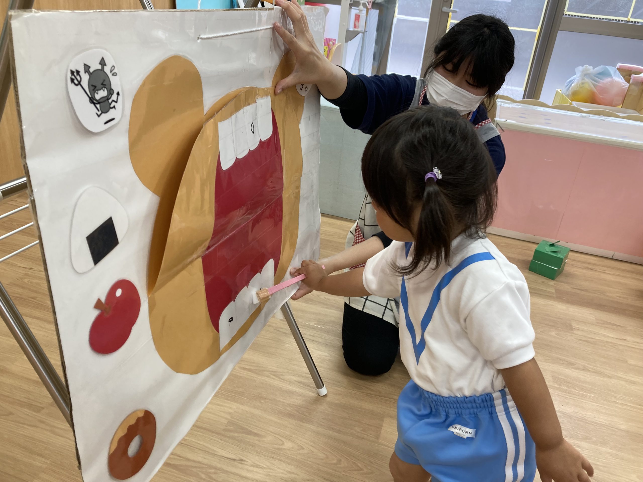 虫歯予防デー2023年6月9日(金) 6月4日は虫歯予防デーです。 今日は、虫歯についてお話しを聞きました。 くまさんは、食べることが大好きです♪ しかし、食べた後すぐに寝てしまいました・・・ すると虫ばい菌がやってきて・・・くまさんの口の中目掛けて入っていきました❕ くまさんは、歯が痛くて目が覚めました❕ そこで、みんなでくまさんの黒くなった歯を磨いてあげました🎵 みんなが磨いてくれたのでピカピカになりました🎵 その後、みんなで“はをみがきましょう”の歌を歌いました🎵 今日からうさぎ組は、給食後に歯を磨きました。 「ピカピカの歯になった」と喜んでいました🎵 « 新聞紙遊び🎵 保育者と一緒にふれあい遊び🎵 »
