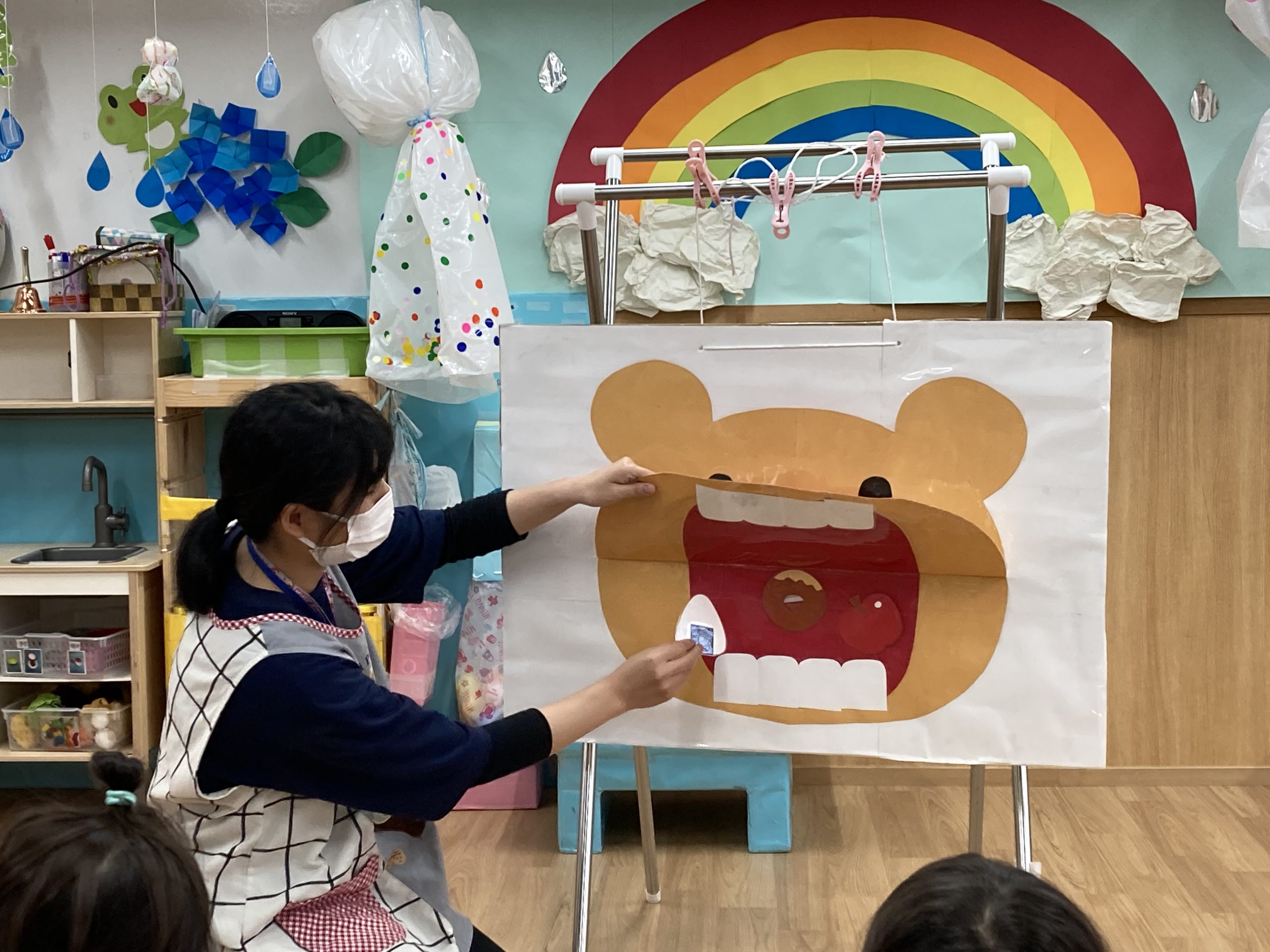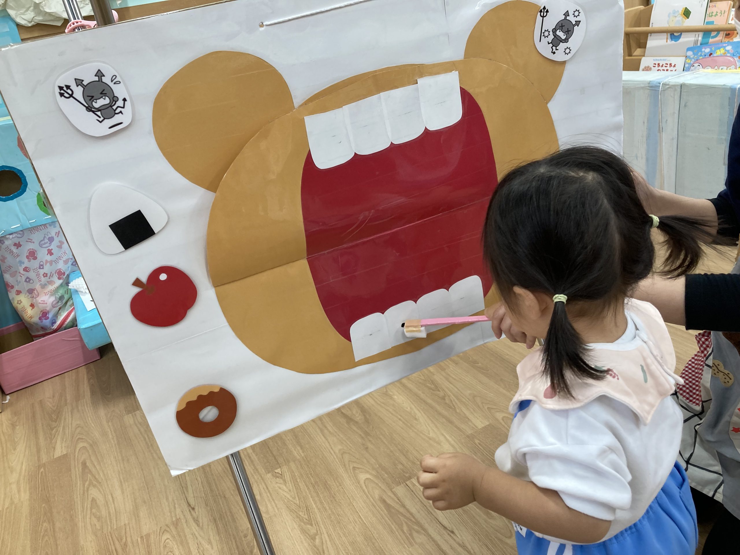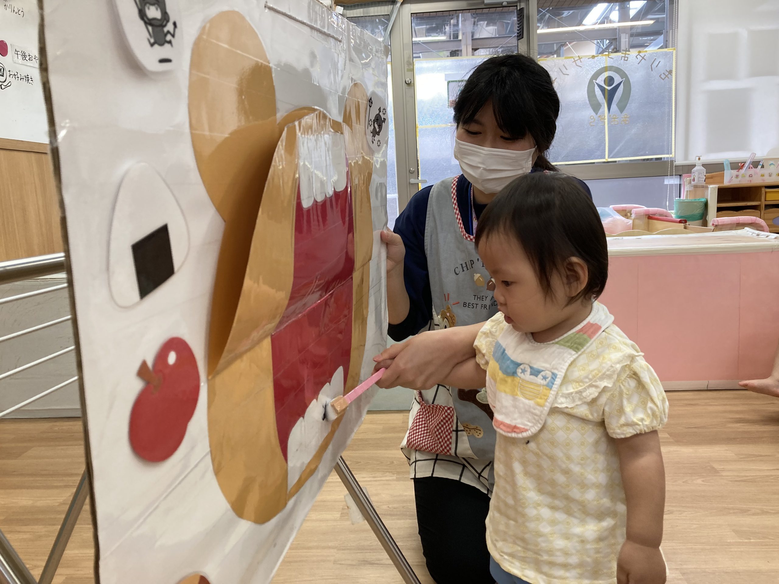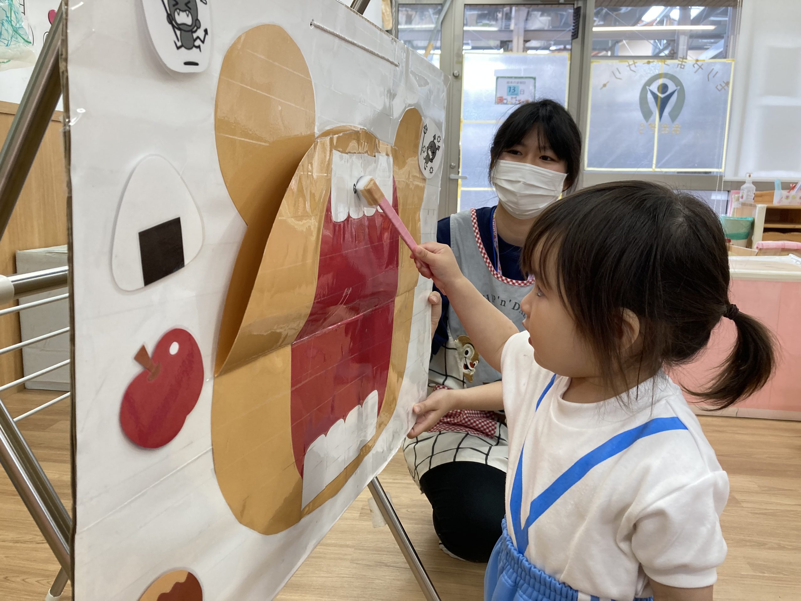 虫歯予防デー2023年6月9日(金) 6月4日は虫歯予防デーです。 今日は、虫歯についてお話しを聞きました。 くまさんは、食べることが大好きです♪ しかし、食べた後すぐに寝てしまいました・・・ すると虫ばい菌がやってきて・・・くまさんの口の中目掛けて入っていきました❕ くまさんは、歯が痛くて目が覚めました❕ そこで、みんなでくまさんの黒くなった歯を磨いてあげました🎵 みんなが磨いてくれたのでピカピカになりました🎵 その後、みんなで“はをみがきましょう”の歌を歌いました🎵 今日からうさぎ組は、給食後に歯を磨きました。 「ピカピカの歯になった」と喜んでいました🎵 « 新聞紙遊び🎵 保育者と一緒にふれあい遊び🎵 »