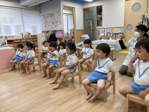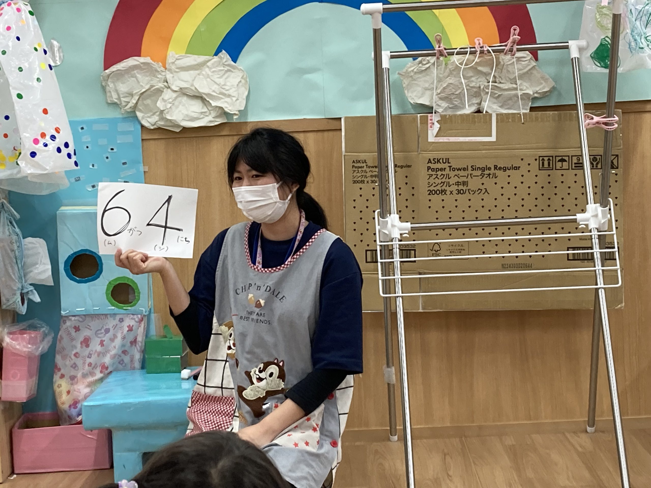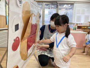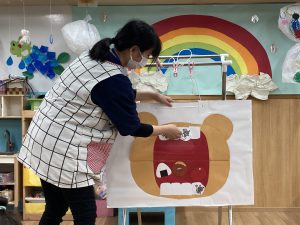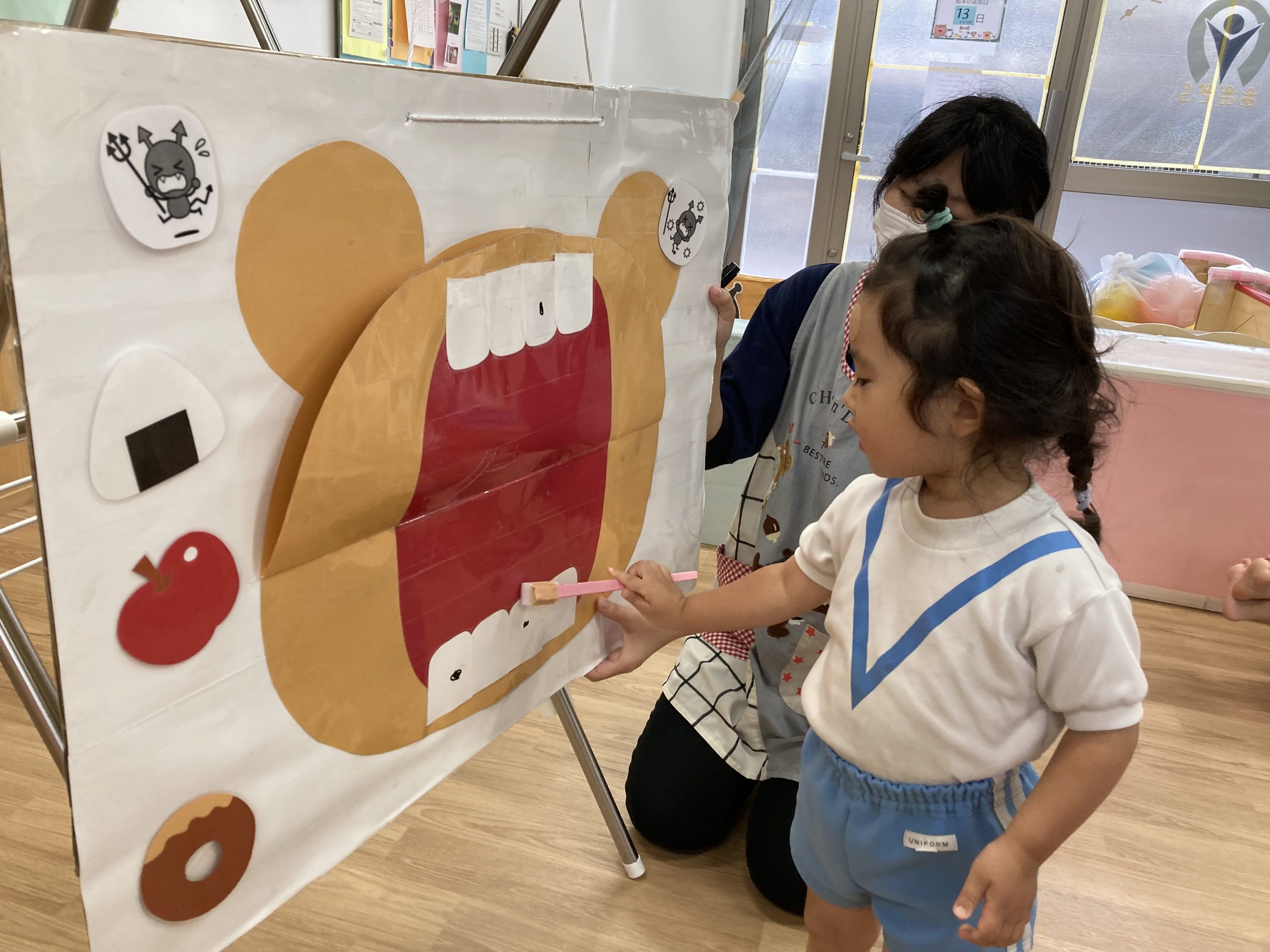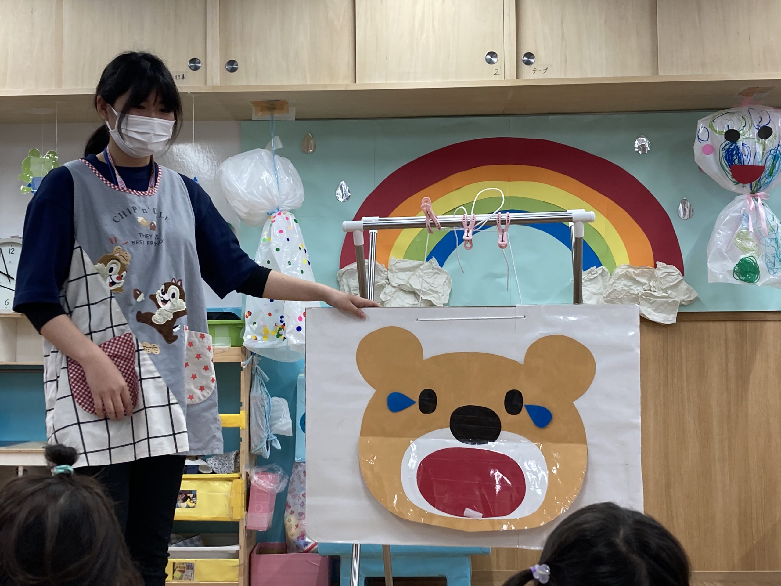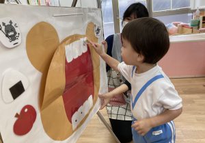 虫歯予防デー2023年6月9日(金) 6月4日は虫歯予防デーです。 今日は、虫歯についてお話しを聞きました。 くまさんは、食べることが大好きです♪ しかし、食べた後すぐに寝てしまいました・・・ すると虫ばい菌がやってきて・・・くまさんの口の中目掛けて入っていきました❕ くまさんは、歯が痛くて目が覚めました❕ そこで、みんなでくまさんの黒くなった歯を磨いてあげました🎵 みんなが磨いてくれたのでピカピカになりました🎵 その後、みんなで“はをみがきましょう”の歌を歌いました🎵 今日からうさぎ組は、給食後に歯を磨きました。 「ピカピカの歯になった」と喜んでいました🎵 « 新聞紙遊び🎵 保育者と一緒にふれあい遊び🎵 »