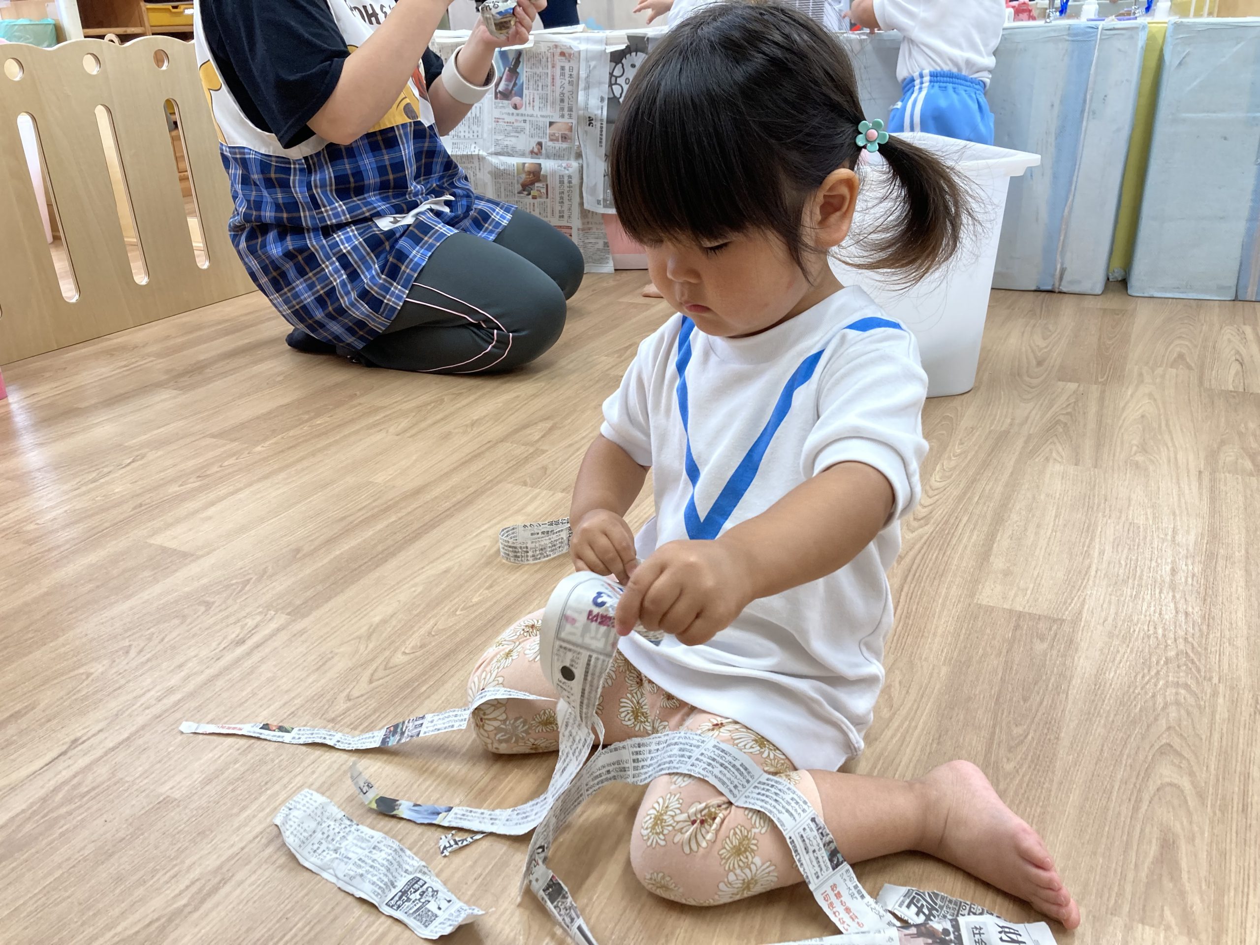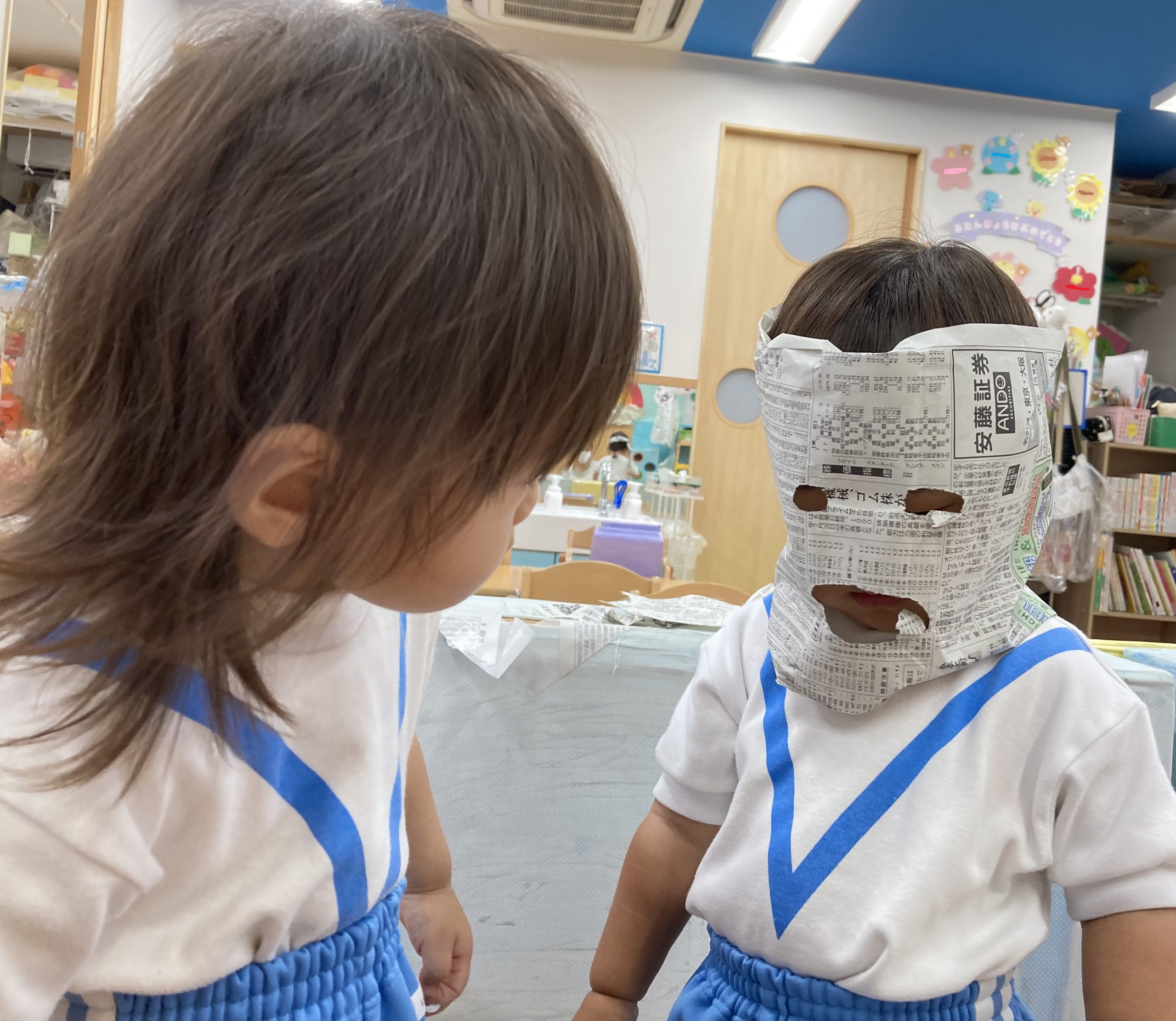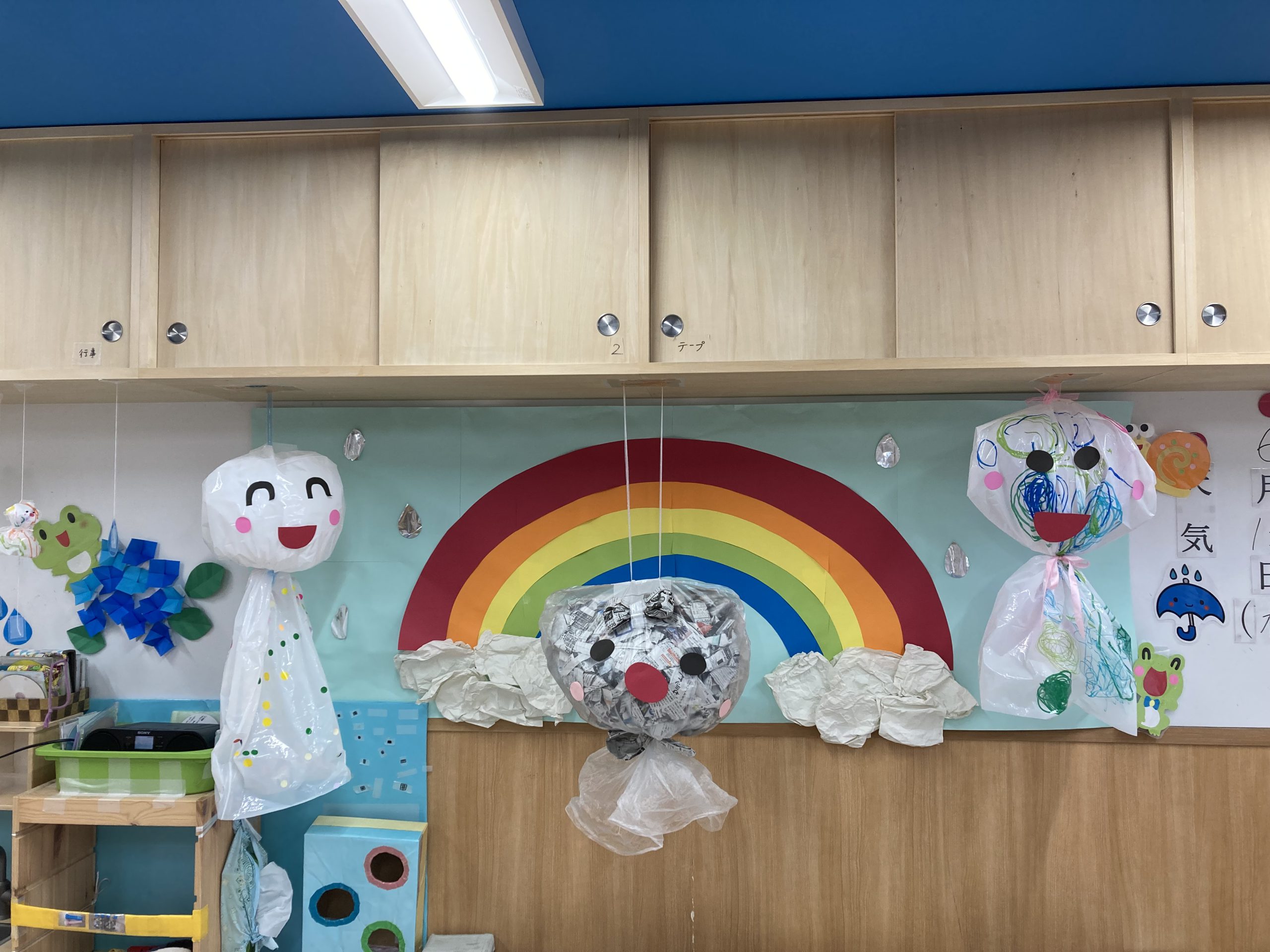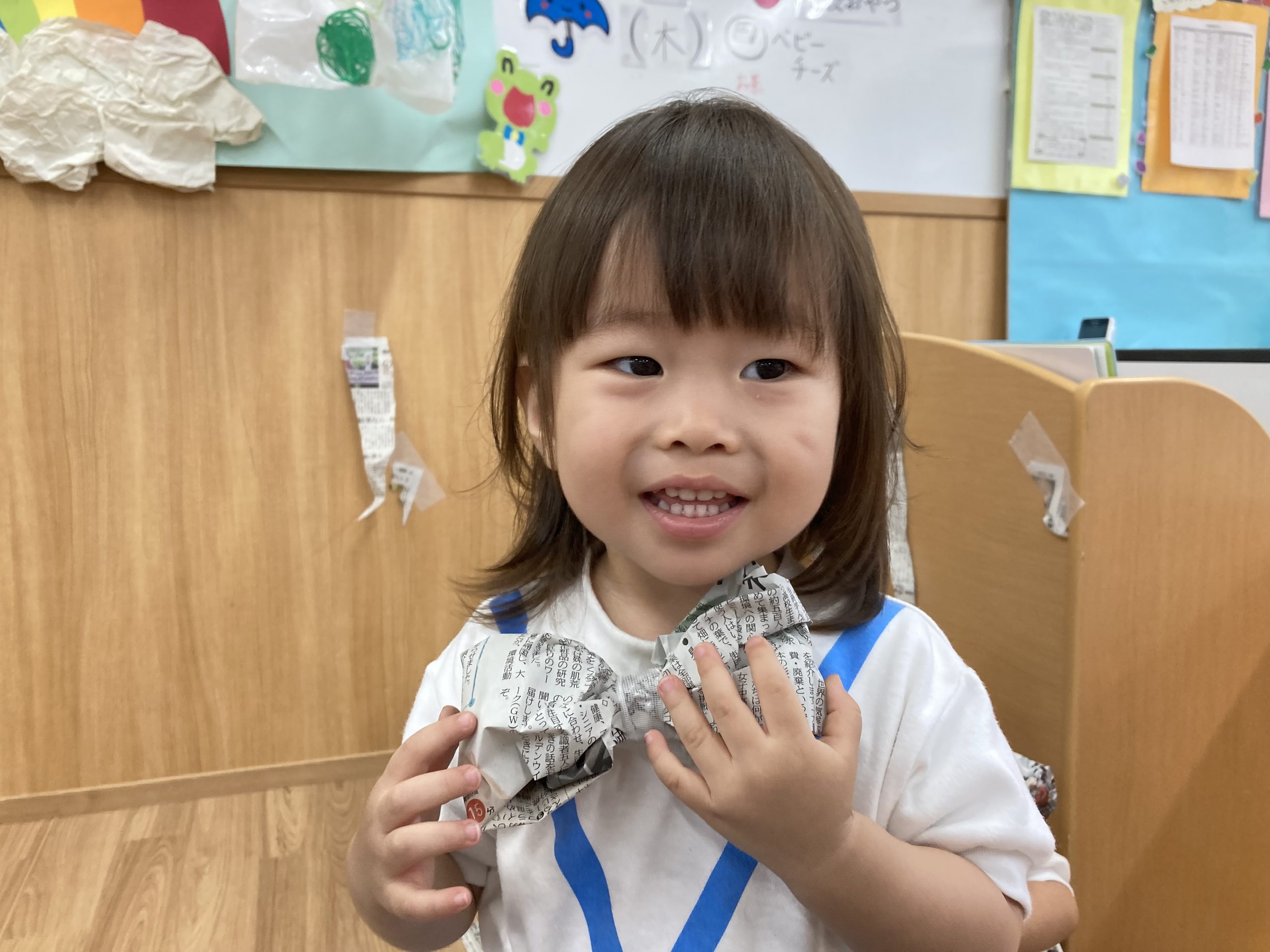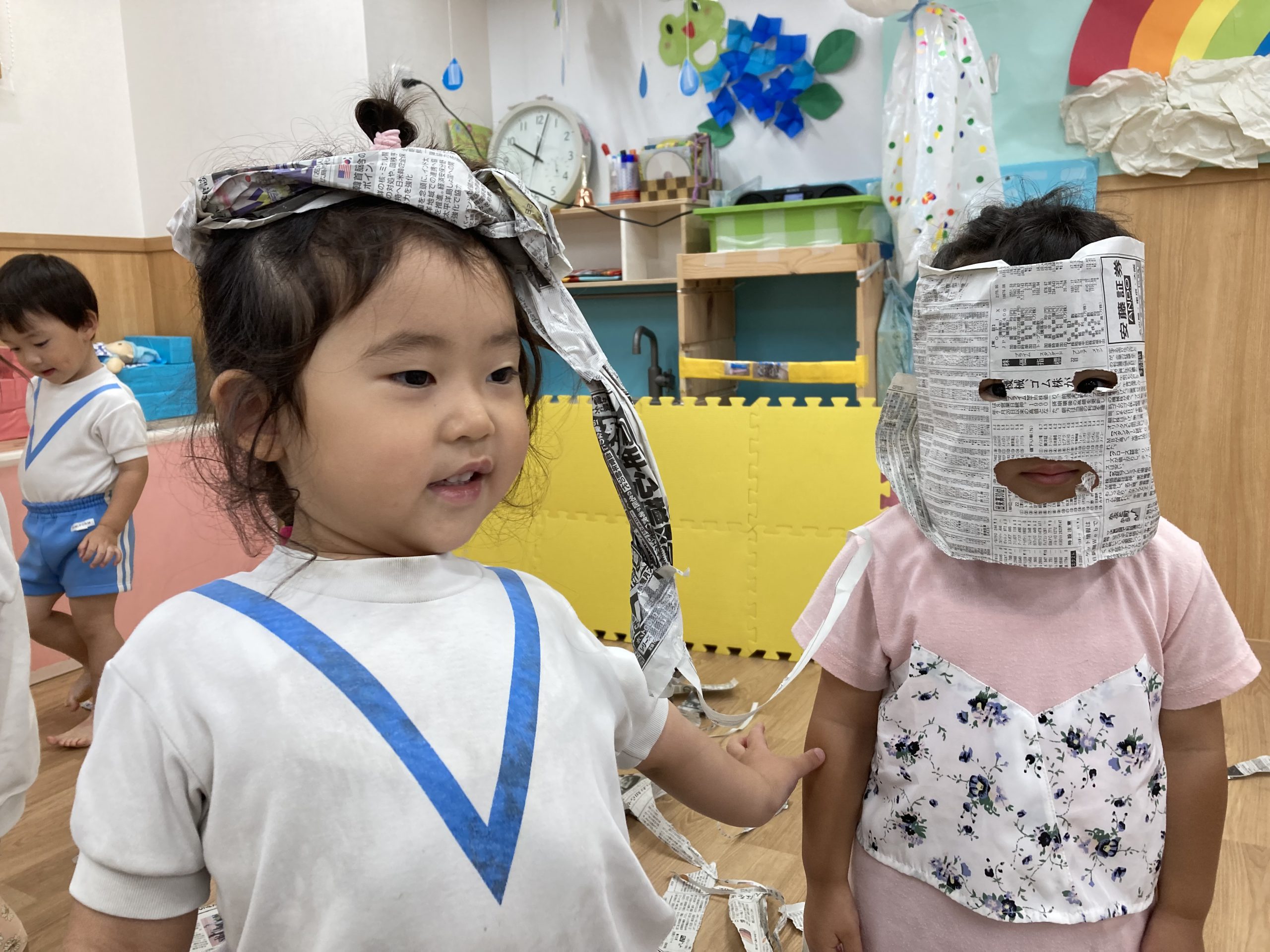 新聞紙遊び🎵2023年6月15日(木) 今日は、新聞紙で遊びました♪ まずは、新聞紙をビリビリと破って・・ そして、新聞紙を使ってオシャレをしてみました🎶 その後、思いっきり新聞紙遊びを楽しみました🎵 遊んだ後は、新聞紙を袋の中に入れててるてる坊主を作りました🎵 こぐま組がてるてる坊主の顔を貼ってくれました🎶 完成しました🎵 最後にてるてる坊主をなでなで 大型壁面に追加で今日作ったてるてる坊主を飾りました🎶 « 小麦粉粘土遊び🎵 虫歯予防デー »