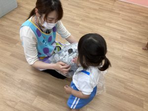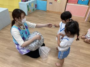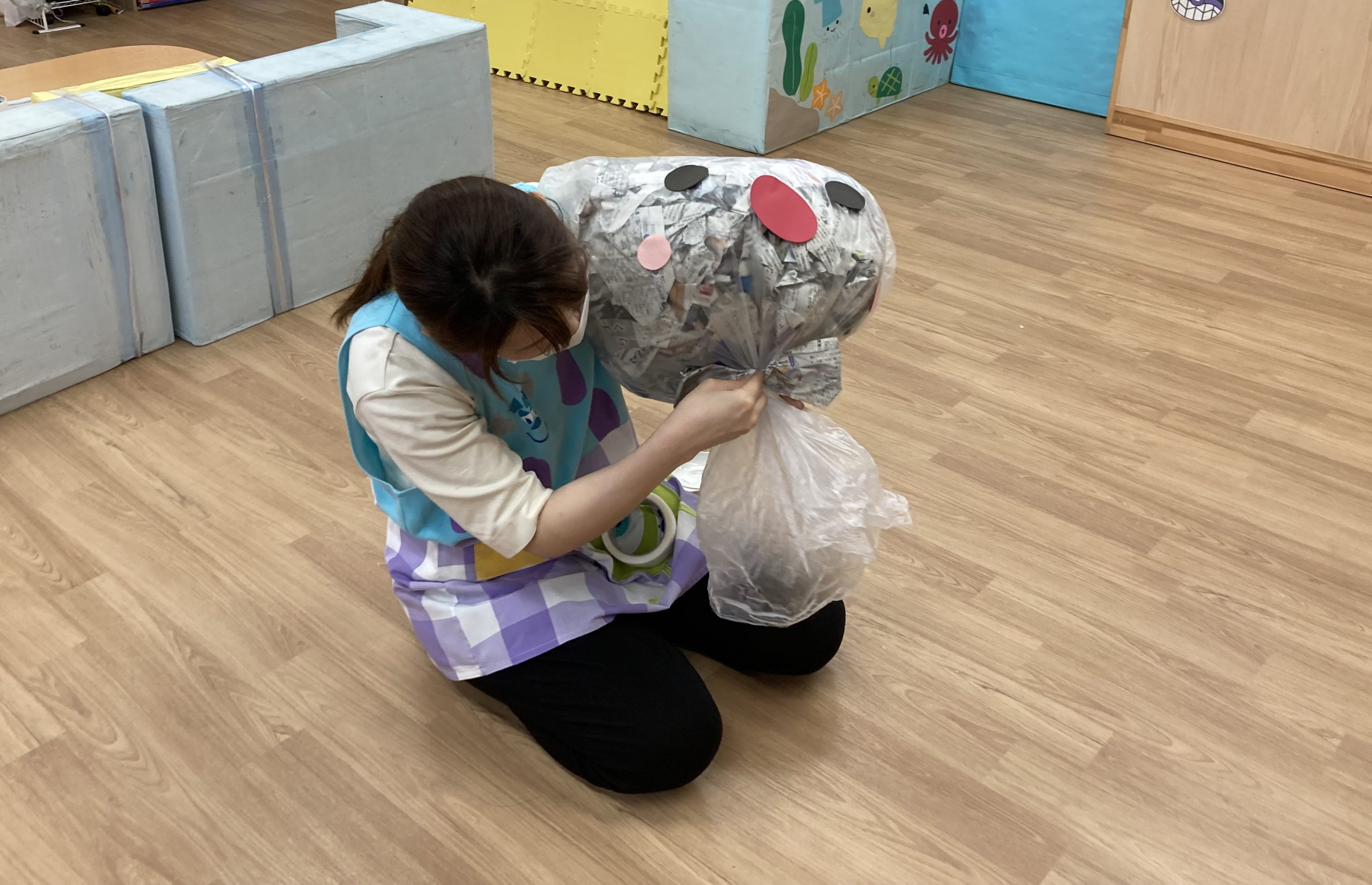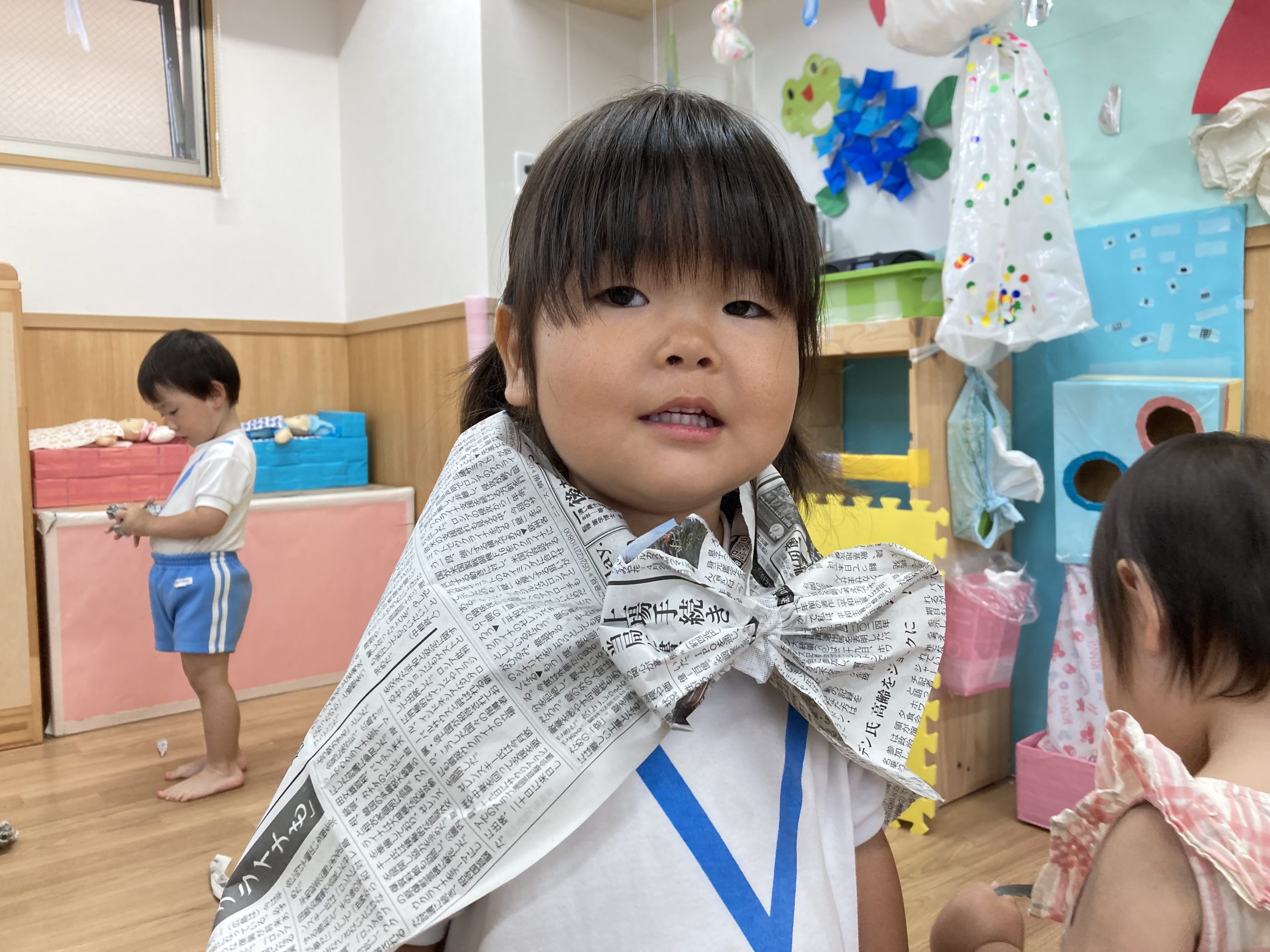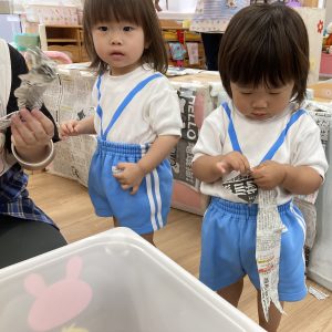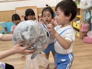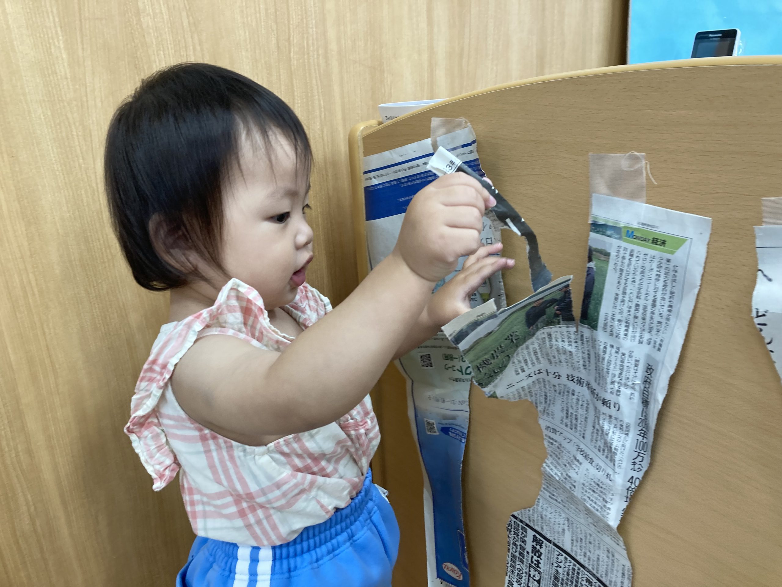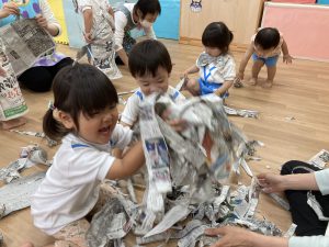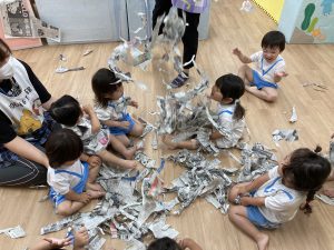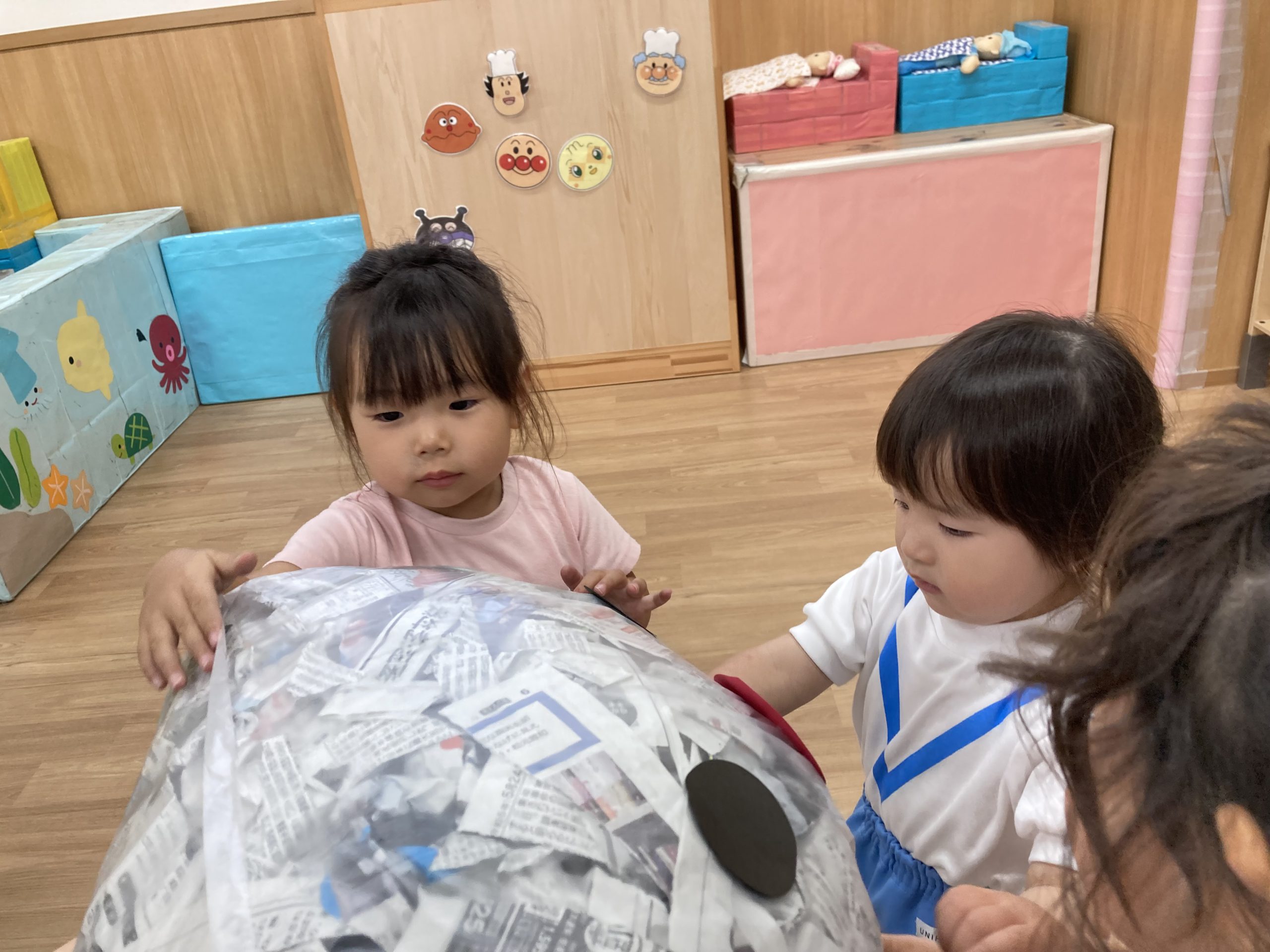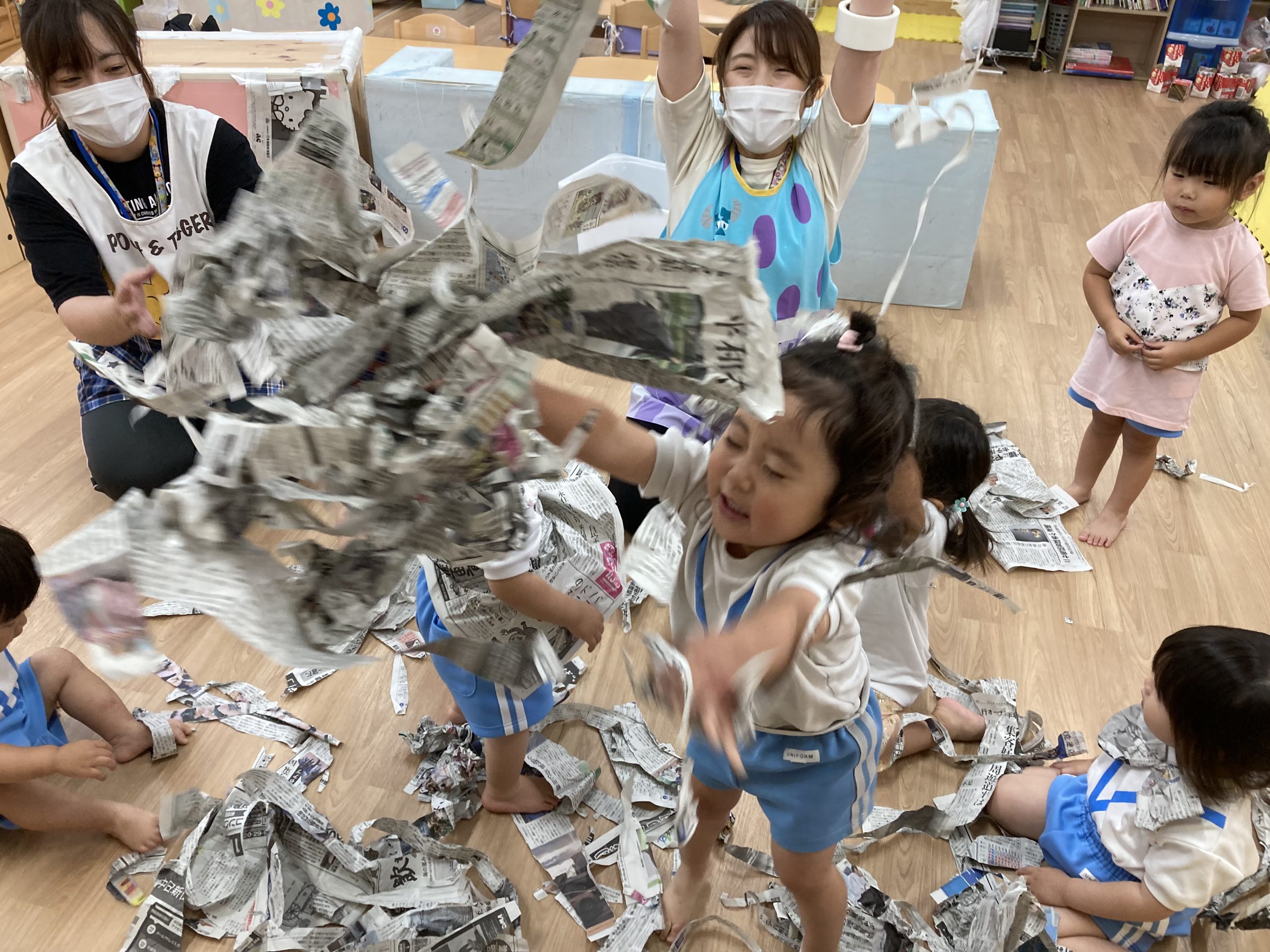 新聞紙遊び🎵2023年6月15日(木) 今日は、新聞紙で遊びました♪ まずは、新聞紙をビリビリと破って・・ そして、新聞紙を使ってオシャレをしてみました🎶 その後、思いっきり新聞紙遊びを楽しみました🎵 遊んだ後は、新聞紙を袋の中に入れててるてる坊主を作りました🎵 こぐま組がてるてる坊主の顔を貼ってくれました🎶 完成しました🎵 最後にてるてる坊主をなでなで 大型壁面に追加で今日作ったてるてる坊主を飾りました🎶 « 小麦粉粘土遊び🎵 虫歯予防デー »
