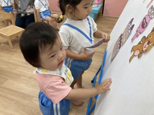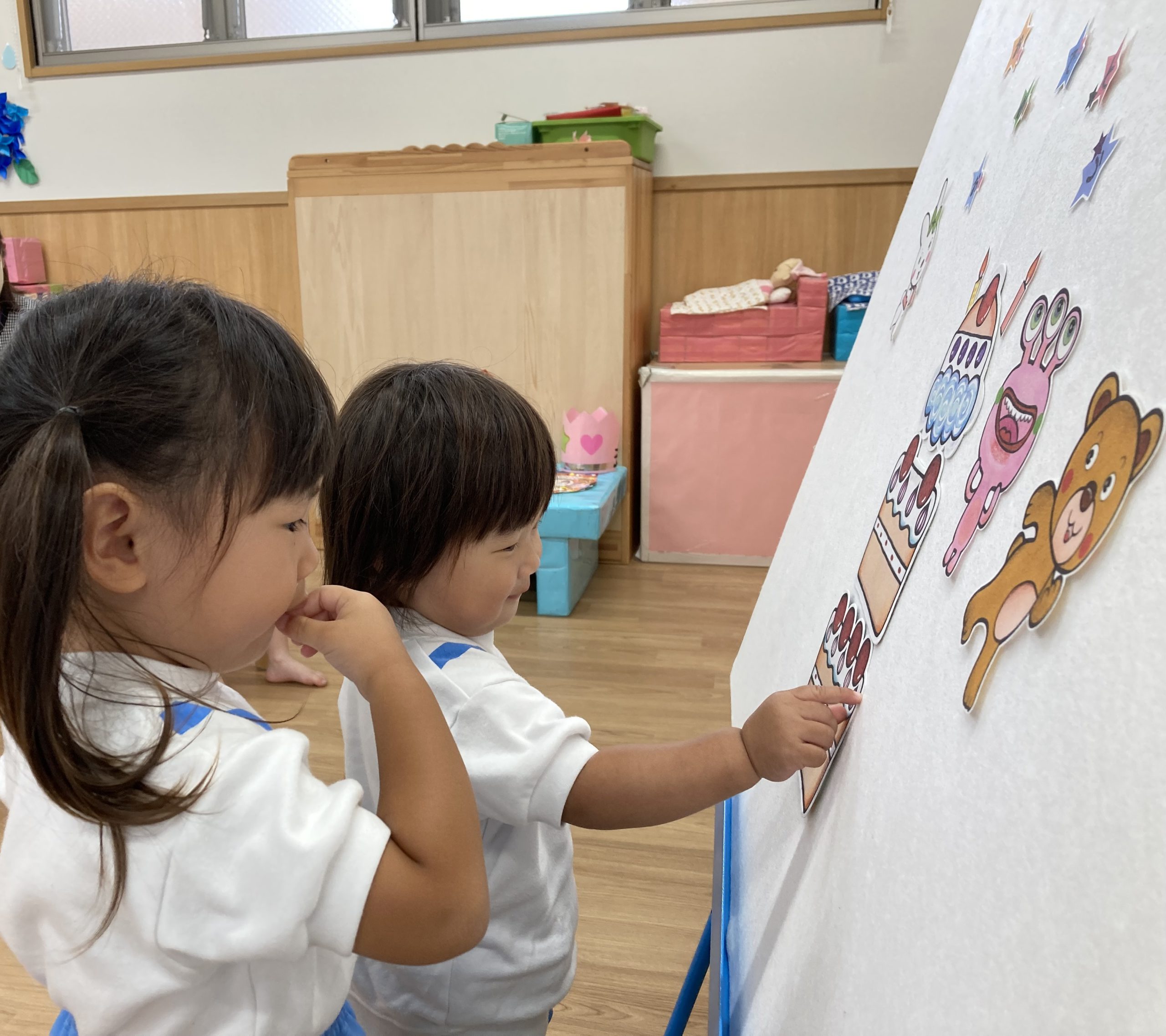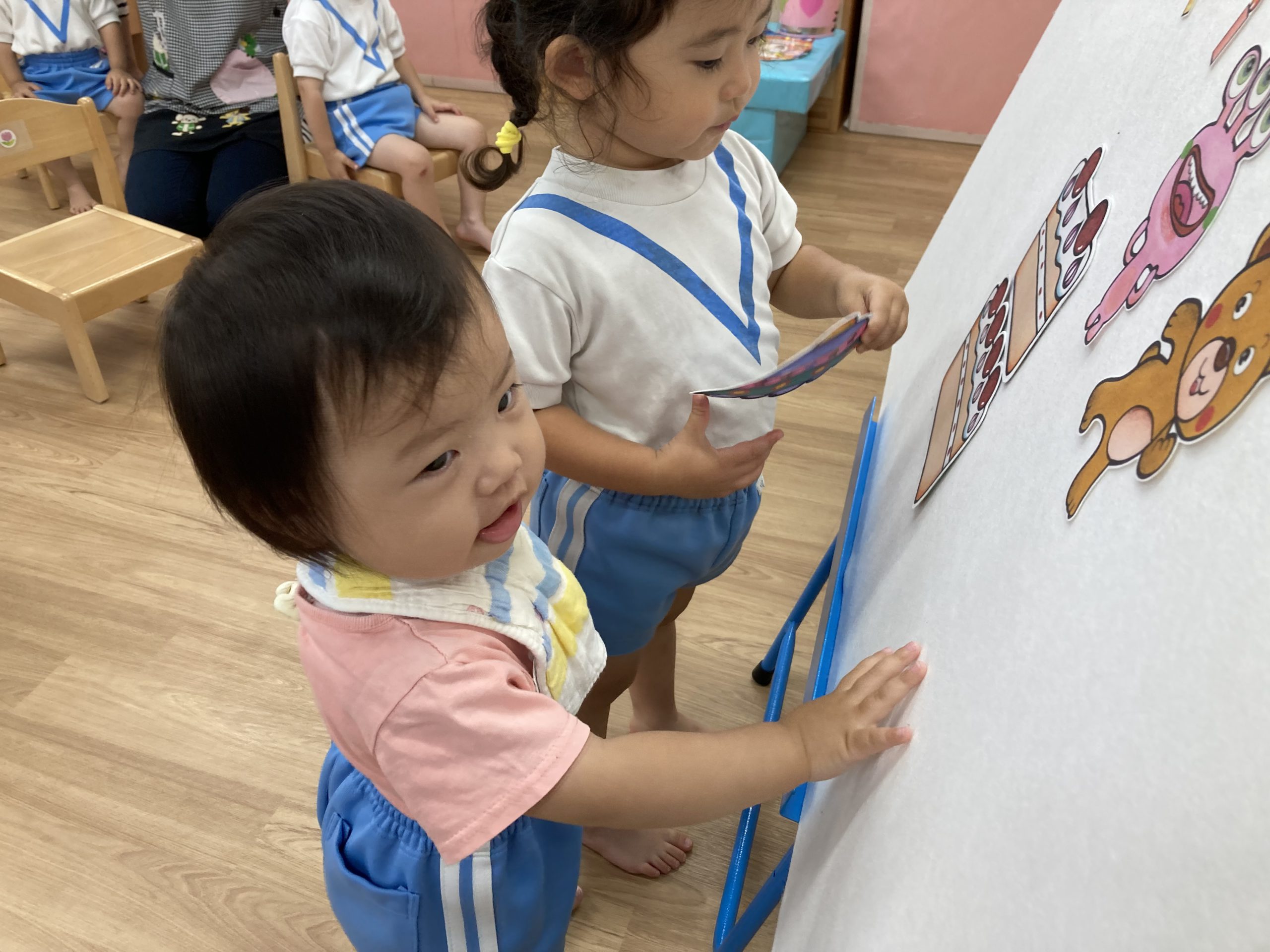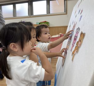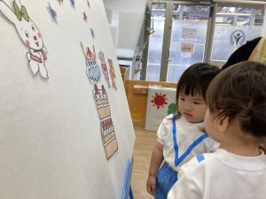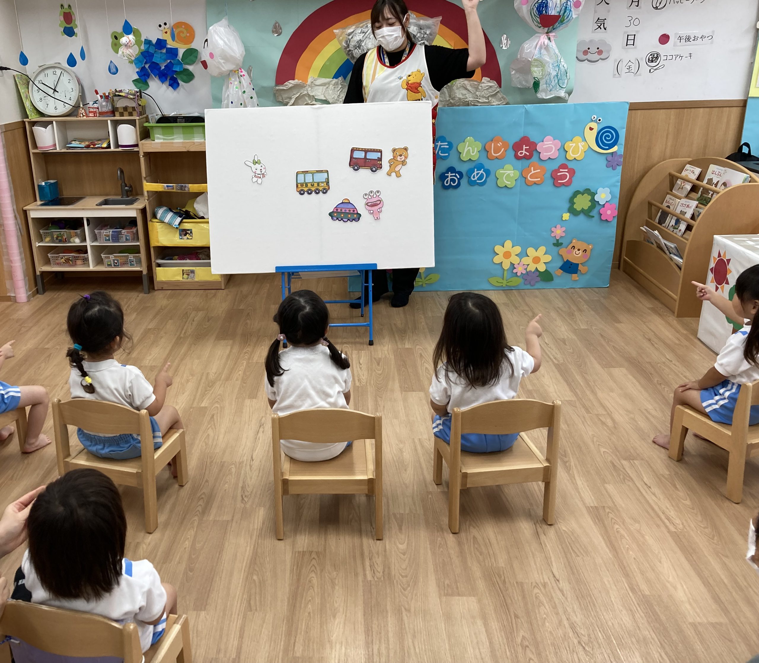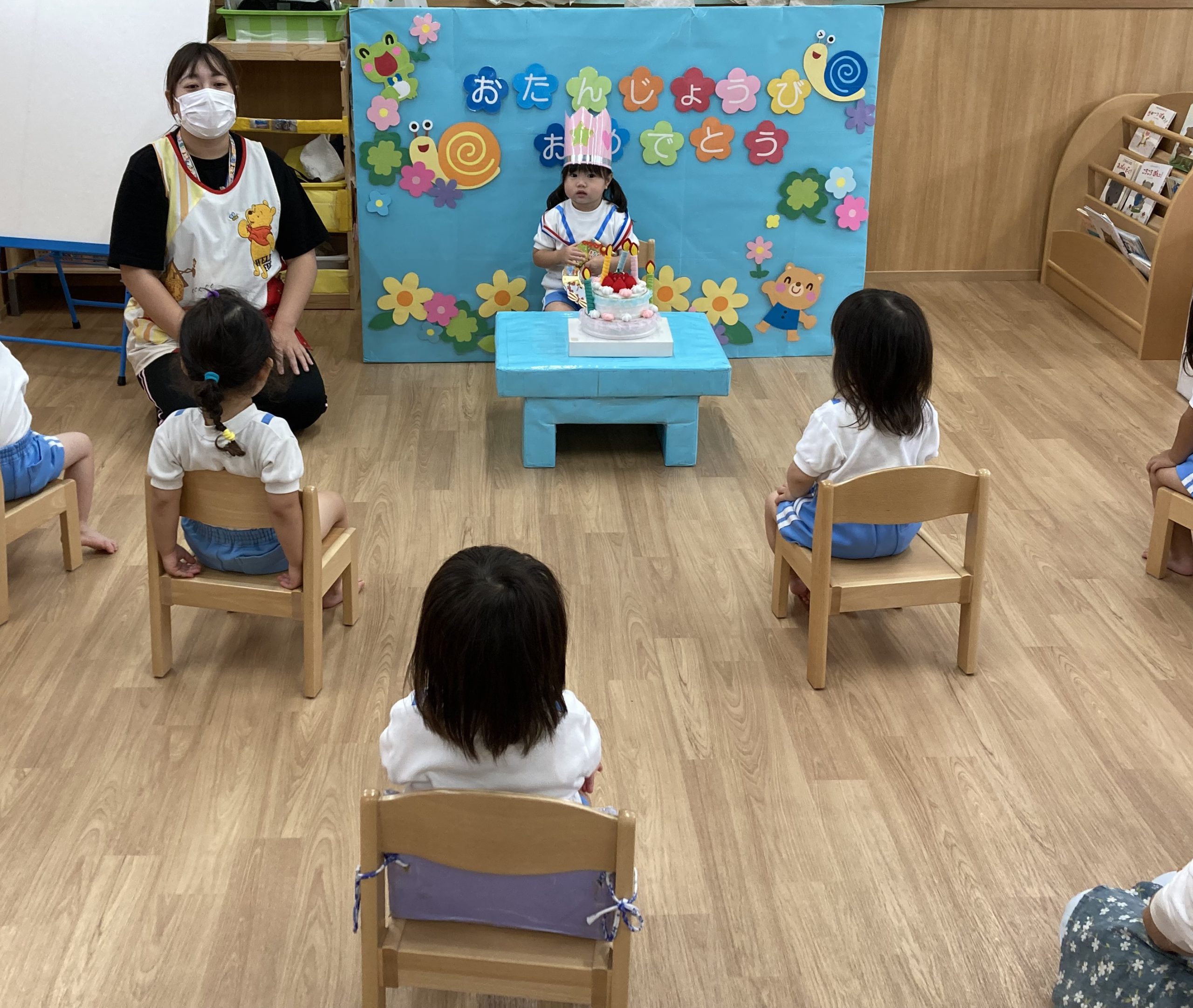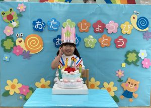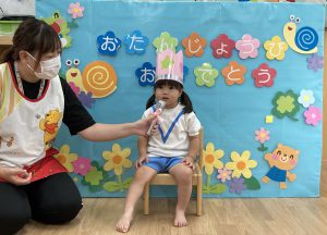 6月の誕生日会🎶2023年6月30日(金) 今日は6月の誕生会がありました🎵 誕生児は1名です🎶 少し緊張をしながら質問に答えていました🎵 そして、友達からの歌のプレゼントの時も緊張していましたが「おめでとう」と言われると少し笑顔が見られました🎶 保育者からの出し物は“へんしんケーキ”のパネルシアターでした🎵 みんなで魔法をかけると・・・ 車がケーキに変身しました♪ 変身したケーキを順番に食べに行きました🎵 お誕生日おめでとうございます。 素敵な一年になりますように・・・ « 水遊び🎶 ピーマンの収獲🎶 »