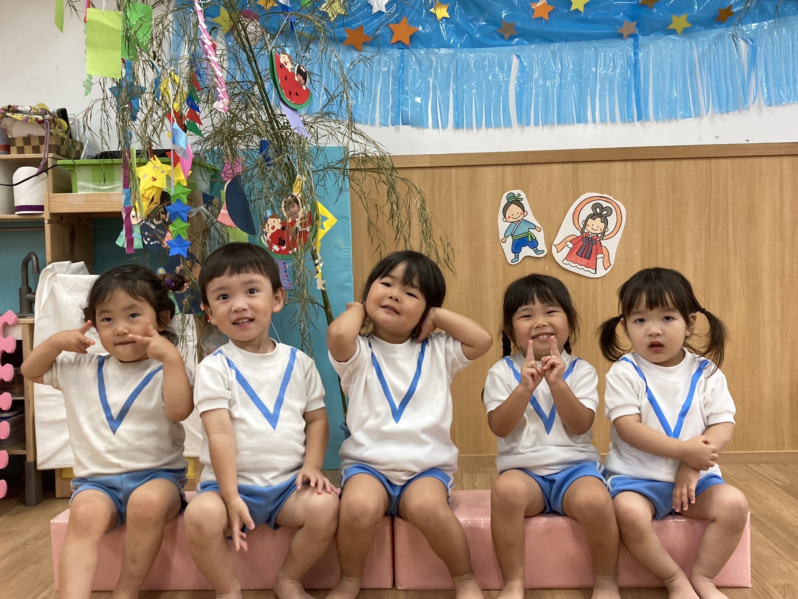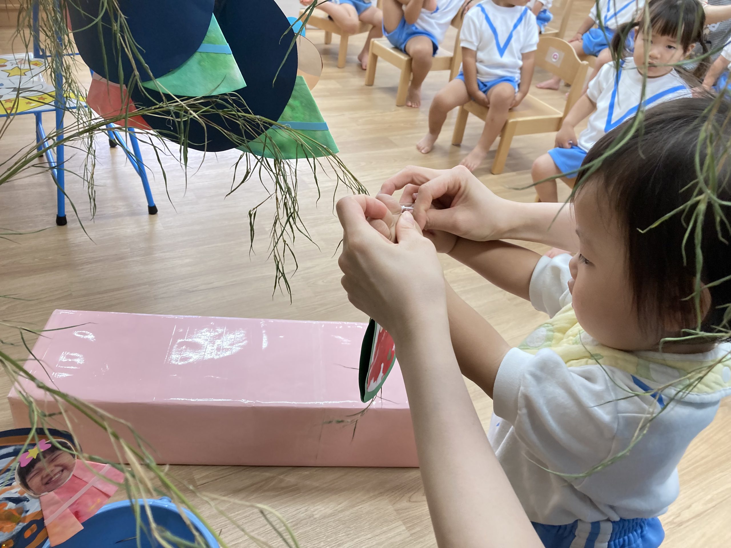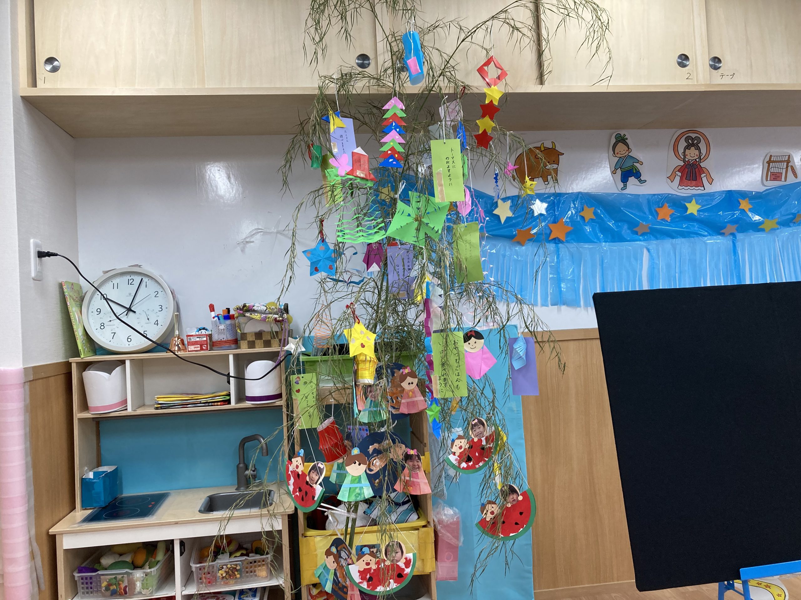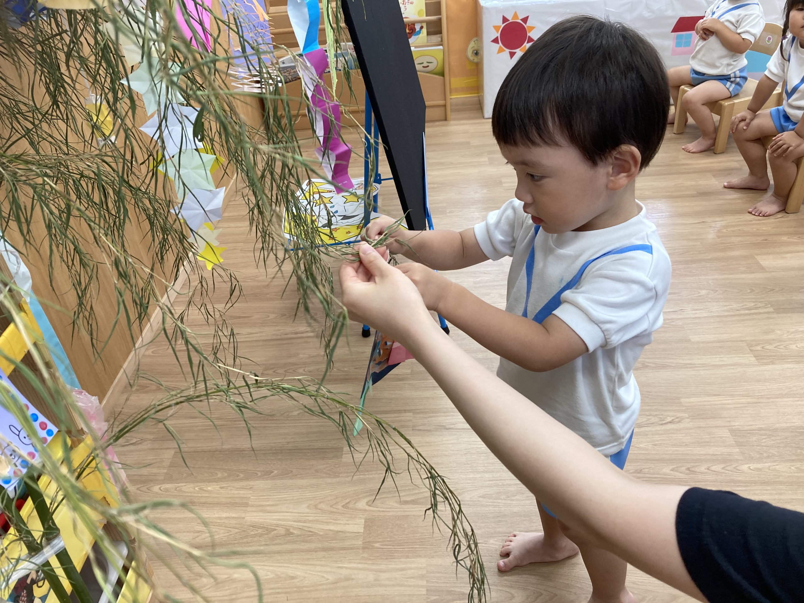 七夕の集い🎋2023年7月7日(金) 今日は7月7日七夕です🎋 以前子ども達が笹飾りを作りました🎵 作った飾りを今日笹につけました🎶 さぁ準備ができました🎵 七夕の集いの始まりです🎶 “たなばたさま”の歌を歌ったり、“たなばた”のパネルシアターをみて楽しみました🎵 最後に写真を撮りました🎶 子ども達や保護者の方の願い事が叶いますように・・・・ 本日笹を持ち帰りました🎵 お家でも“たなばた”を楽しんでください🎶 « 片栗粉遊び🎶 水遊び🎶 »
