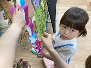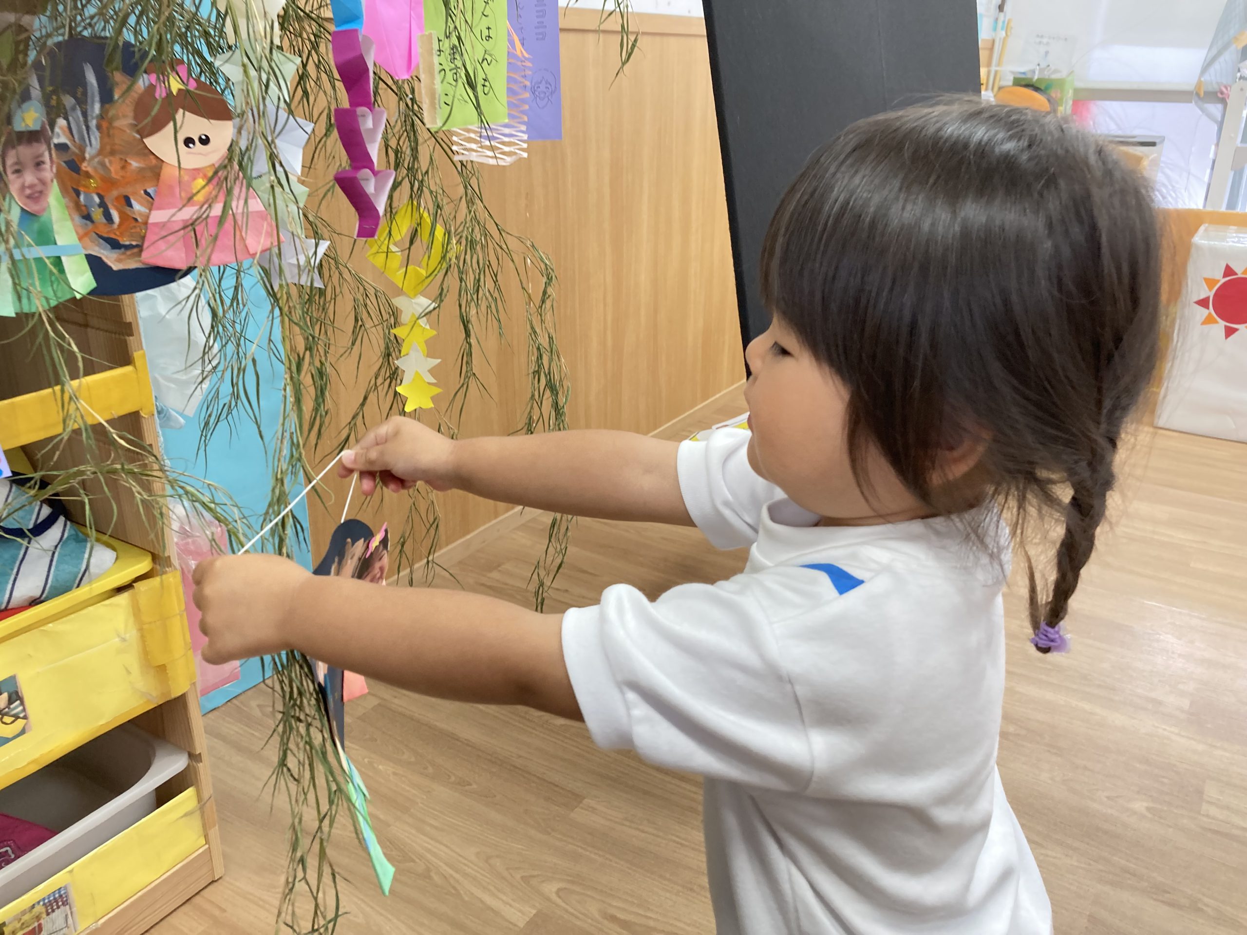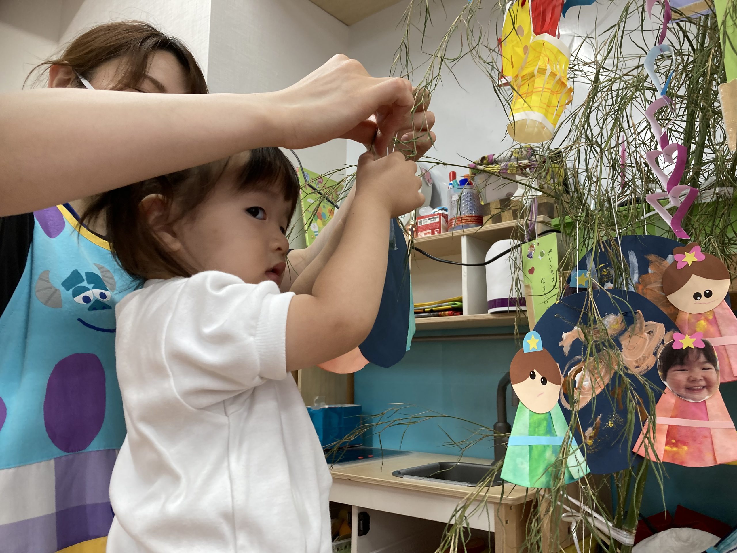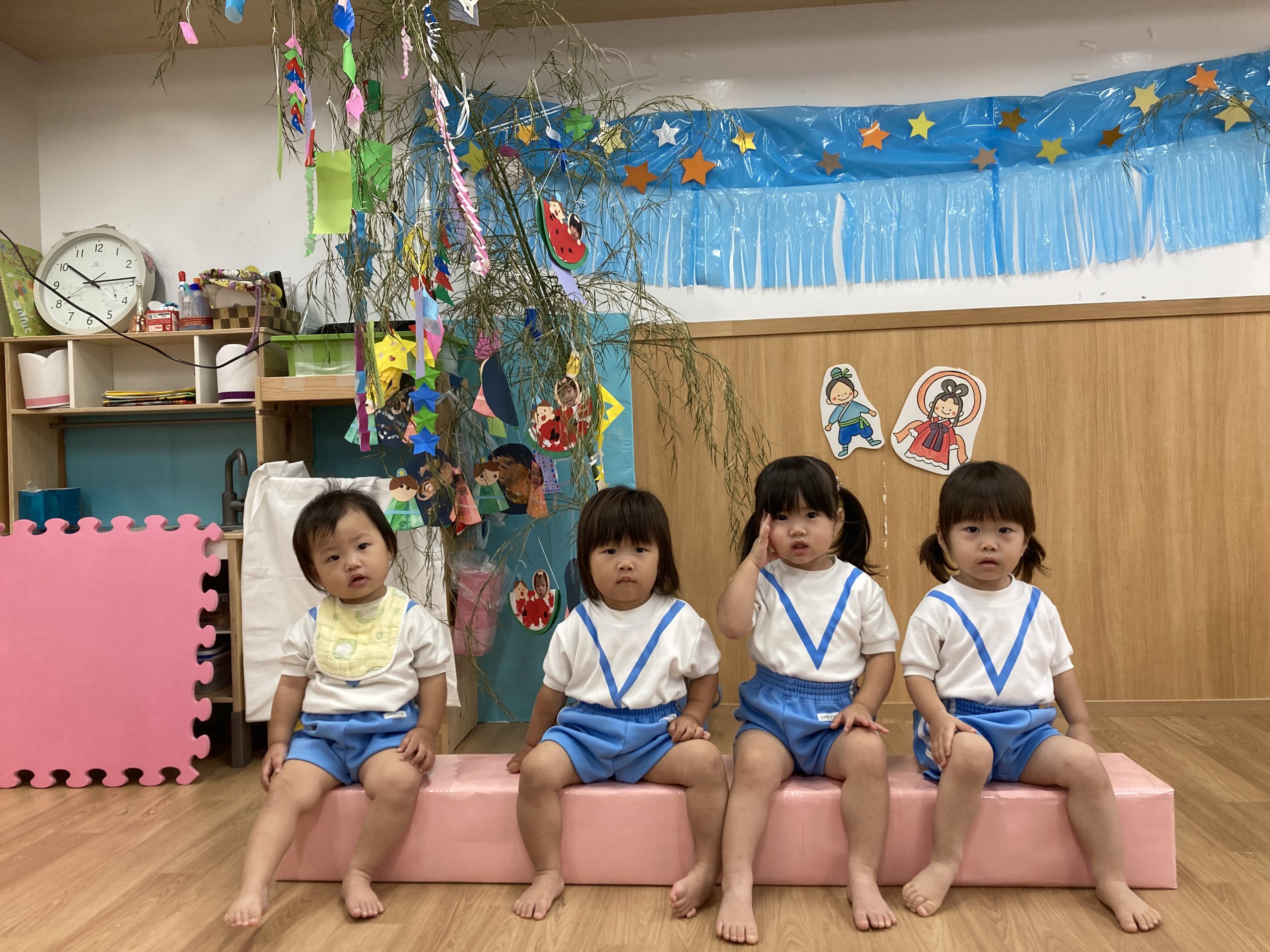七夕の集い🎋2023年7月7日(金) 今日は7月7日七夕です🎋 以前子ども達が笹飾りを作りました🎵 作った飾りを今日笹につけました🎶 さぁ準備ができました🎵 七夕の集いの始まりです🎶 “たなばたさま”の歌を歌ったり、“たなばた”のパネルシアターをみて楽しみました🎵 最後に写真を撮りました🎶 子ども達や保護者の方の願い事が叶いますように・・・・ 本日笹を持ち帰りました🎵 お家でも“たなばた”を楽しんでください🎶 « 片栗粉遊び🎶 水遊び🎶 »