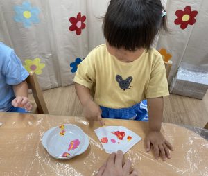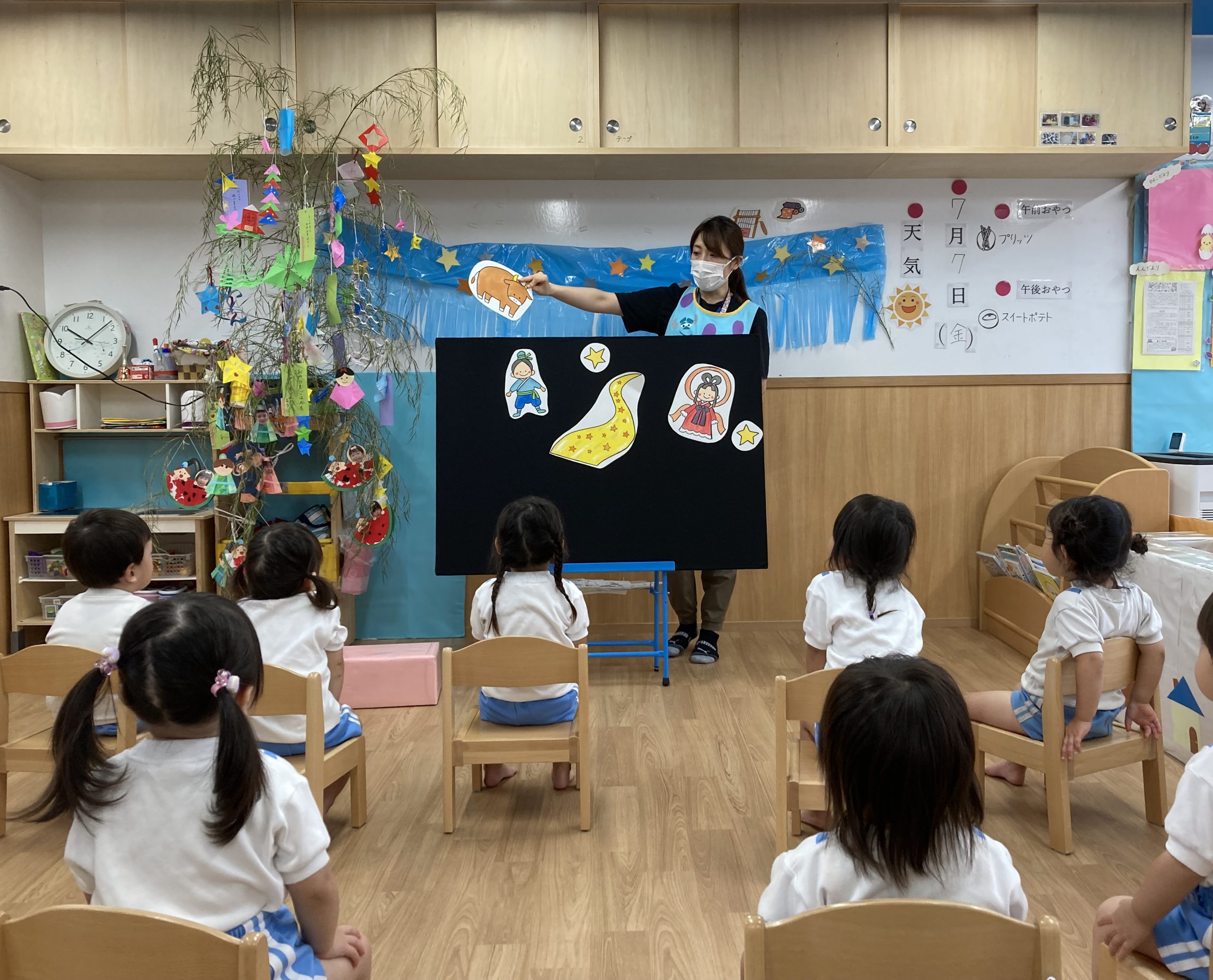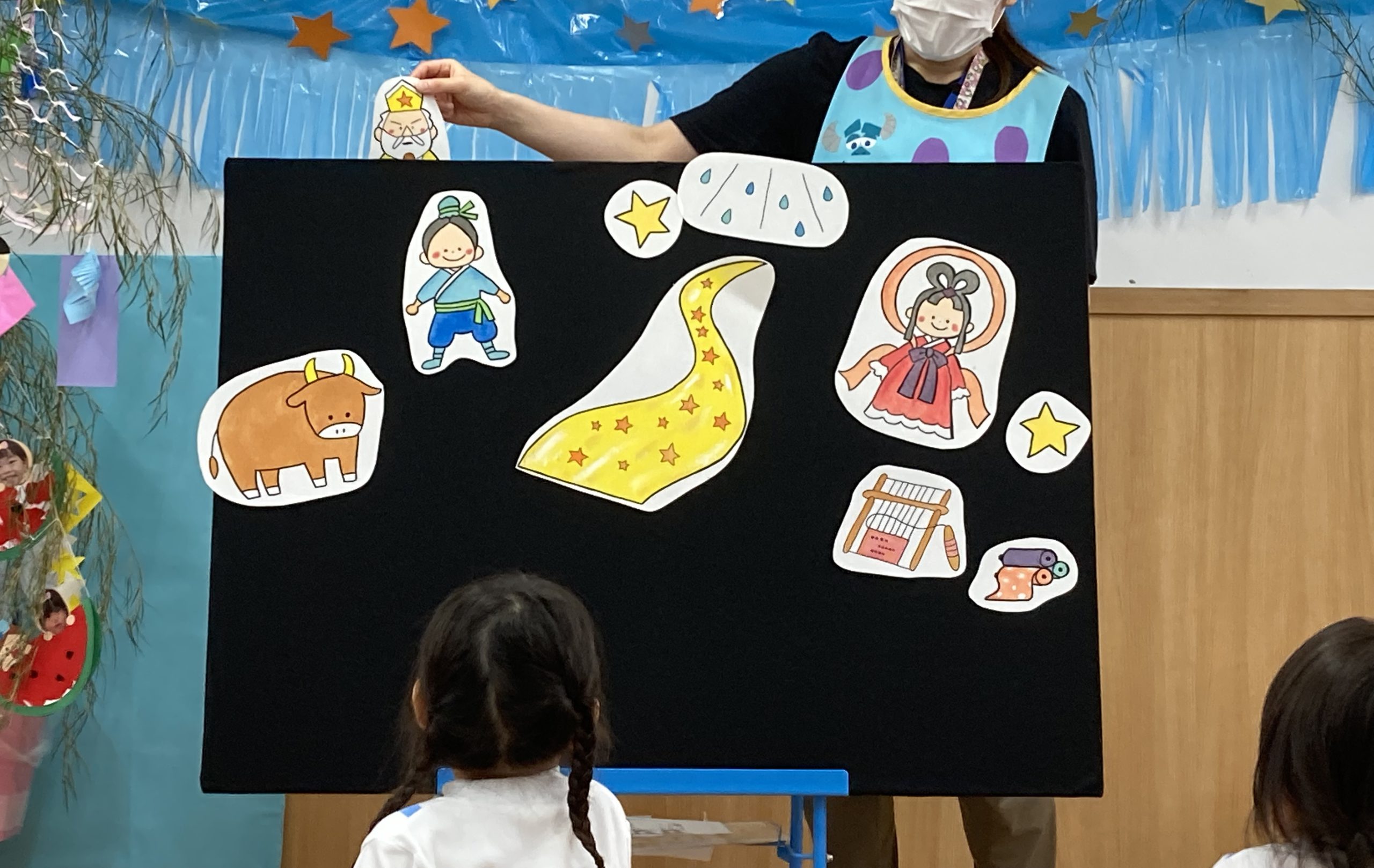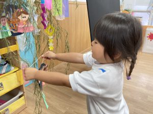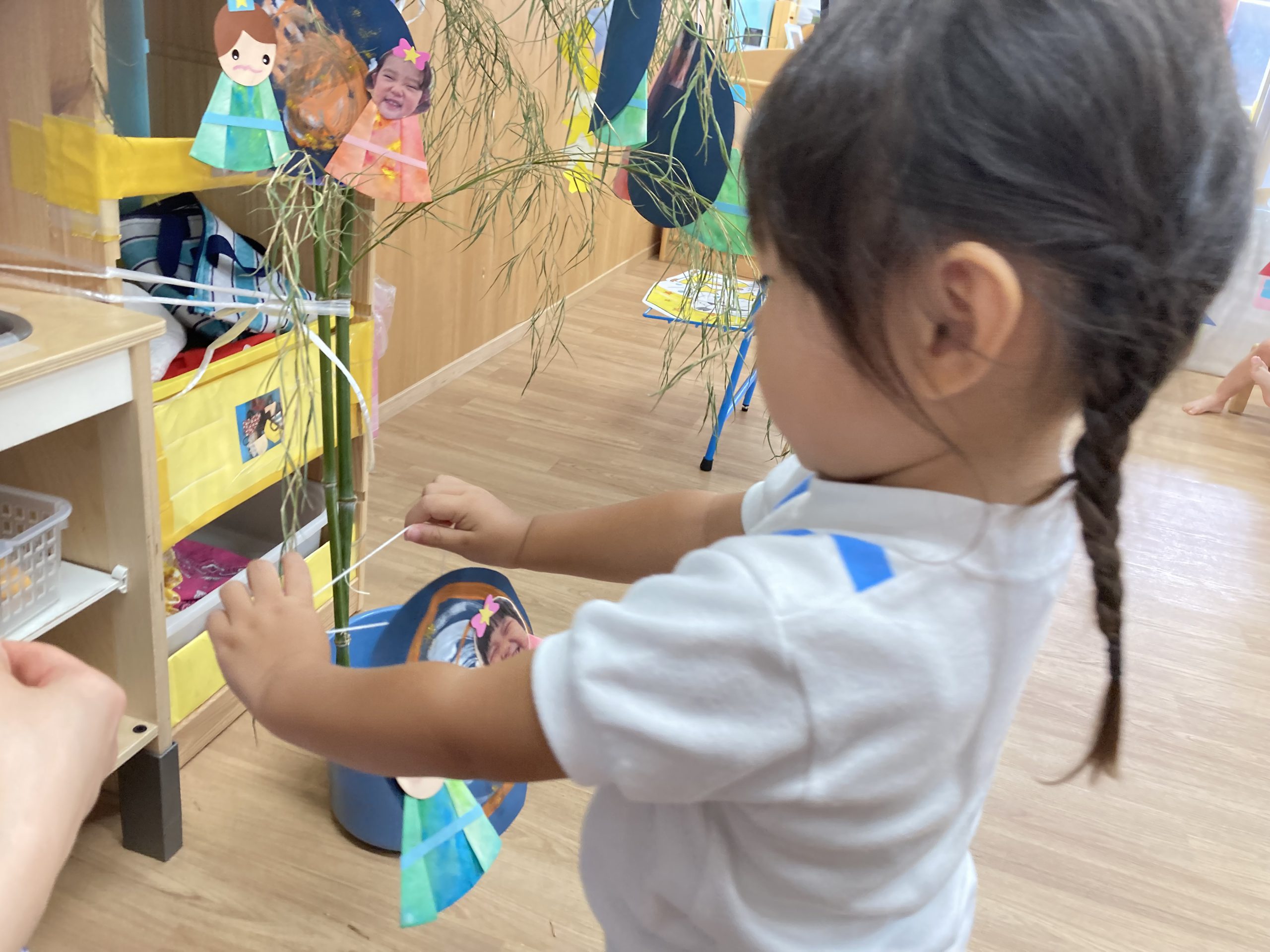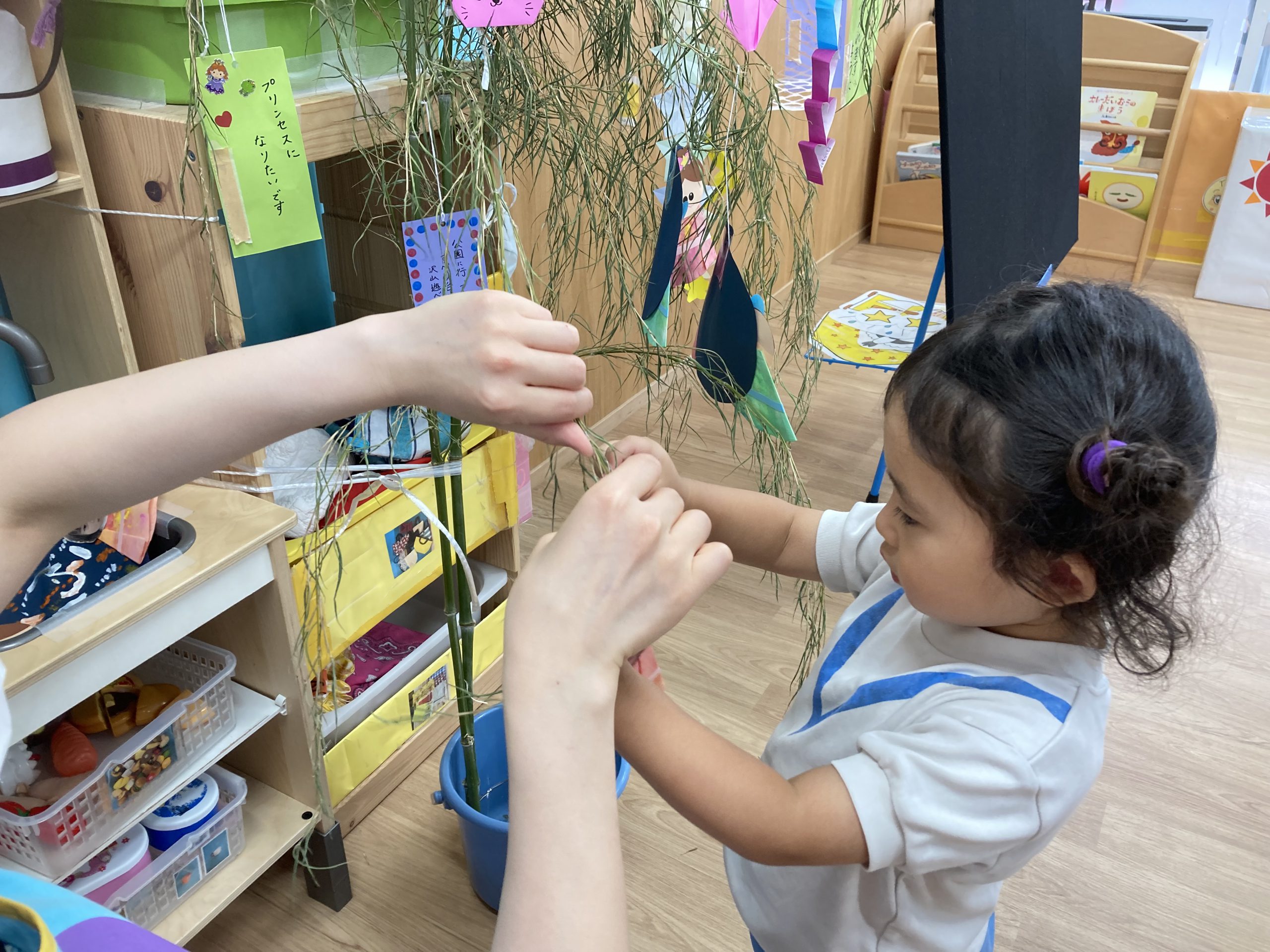 七夕の集い🎋2023年7月7日(金) 今日は7月7日七夕です🎋 以前子ども達が笹飾りを作りました🎵 作った飾りを今日笹につけました🎶 さぁ準備ができました🎵 七夕の集いの始まりです🎶 “たなばたさま”の歌を歌ったり、“たなばた”のパネルシアターをみて楽しみました🎵 最後に写真を撮りました🎶 子ども達や保護者の方の願い事が叶いますように・・・・ 本日笹を持ち帰りました🎵 お家でも“たなばた”を楽しんでください🎶 « 片栗粉遊び🎶 水遊び🎶 »