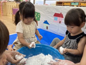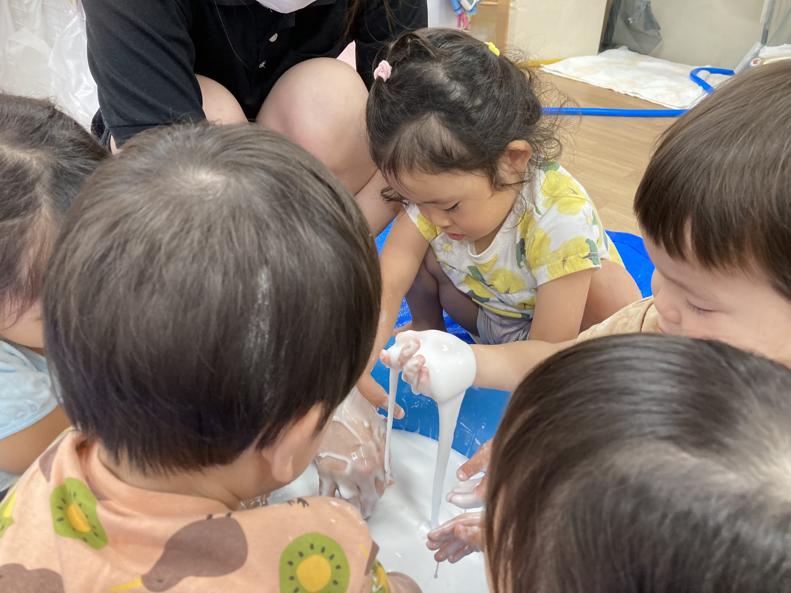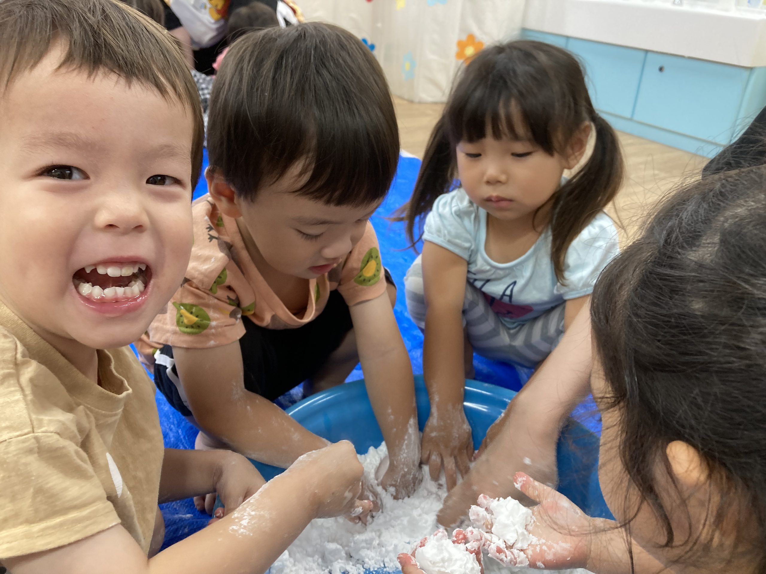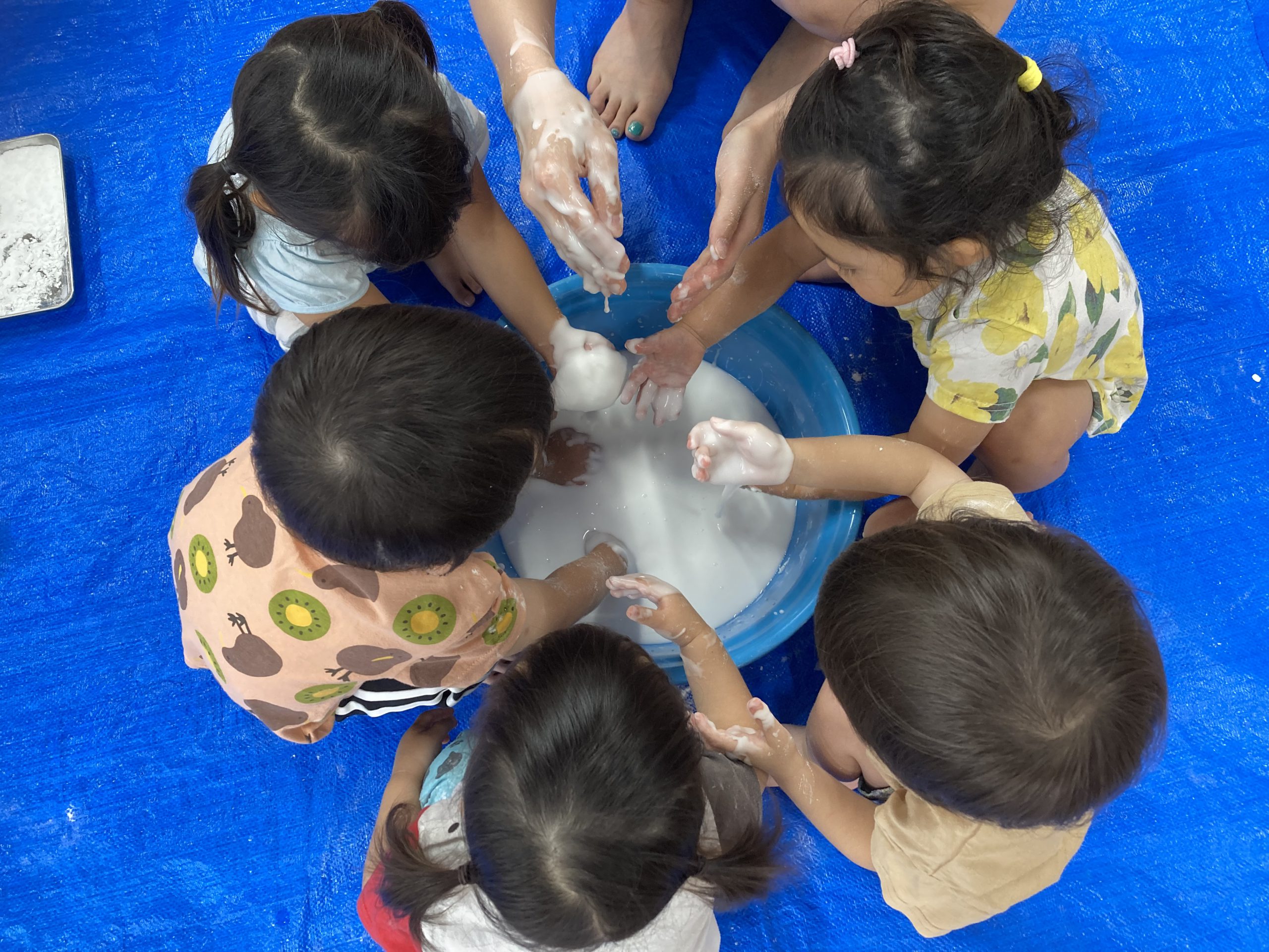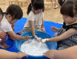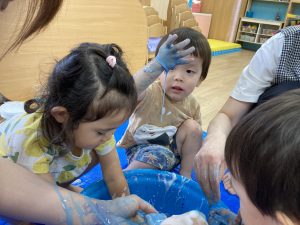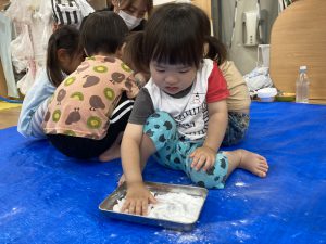 片栗粉遊び🎶2023年7月14日(金) 今日はみんなで片栗粉遊びを楽しみました🎶 まずは、片栗粉を触ってみました🎵 お水を少し入れてみよう♬ もっとお水を入れて・・ トロトロ・・・ 氷絵の具を使って色を付けてみよう~🎶 トロトロの感触を楽しみました🎵 « 7月18日(火)プール開き♬ 七夕の集い🎋 »