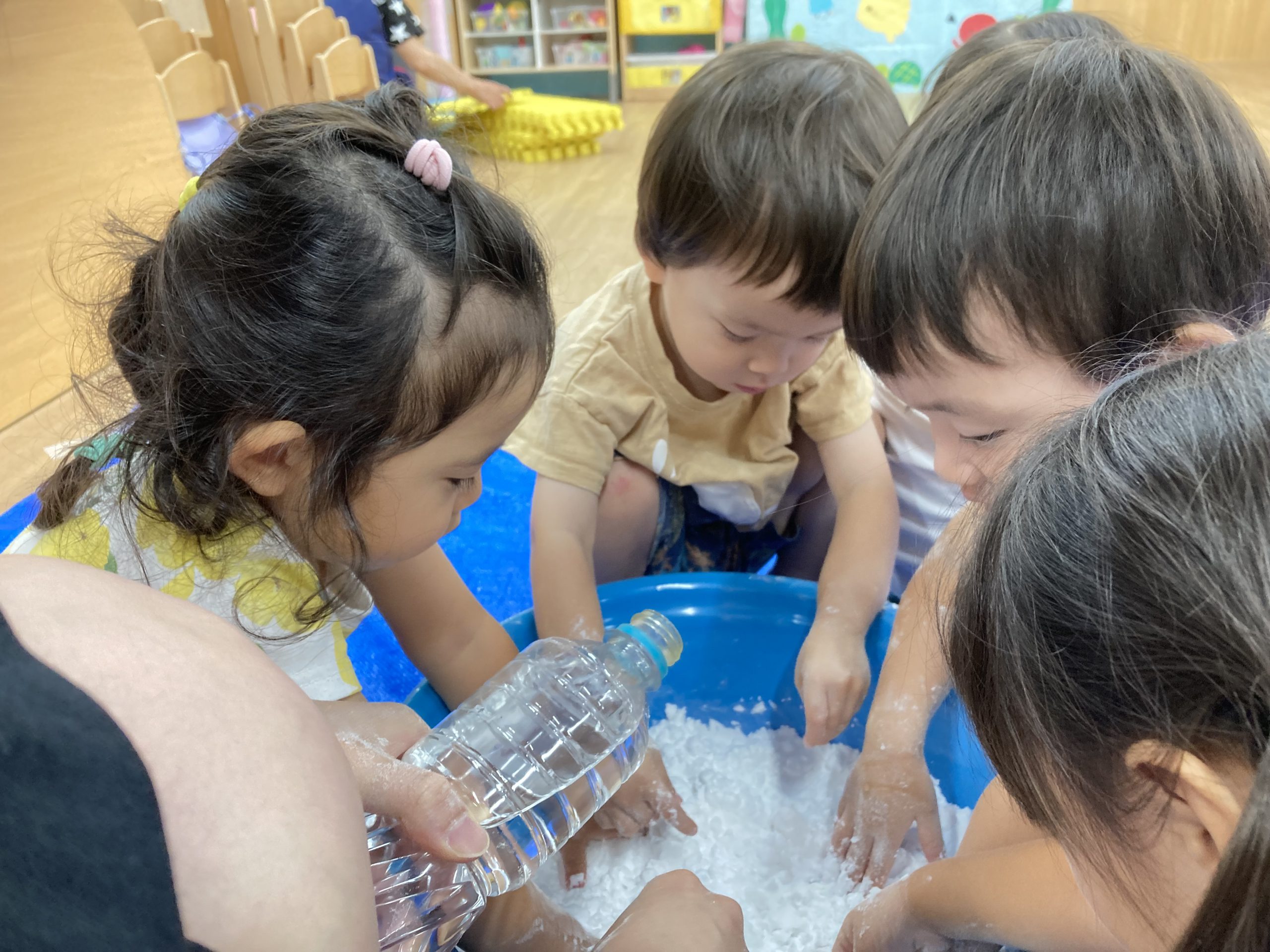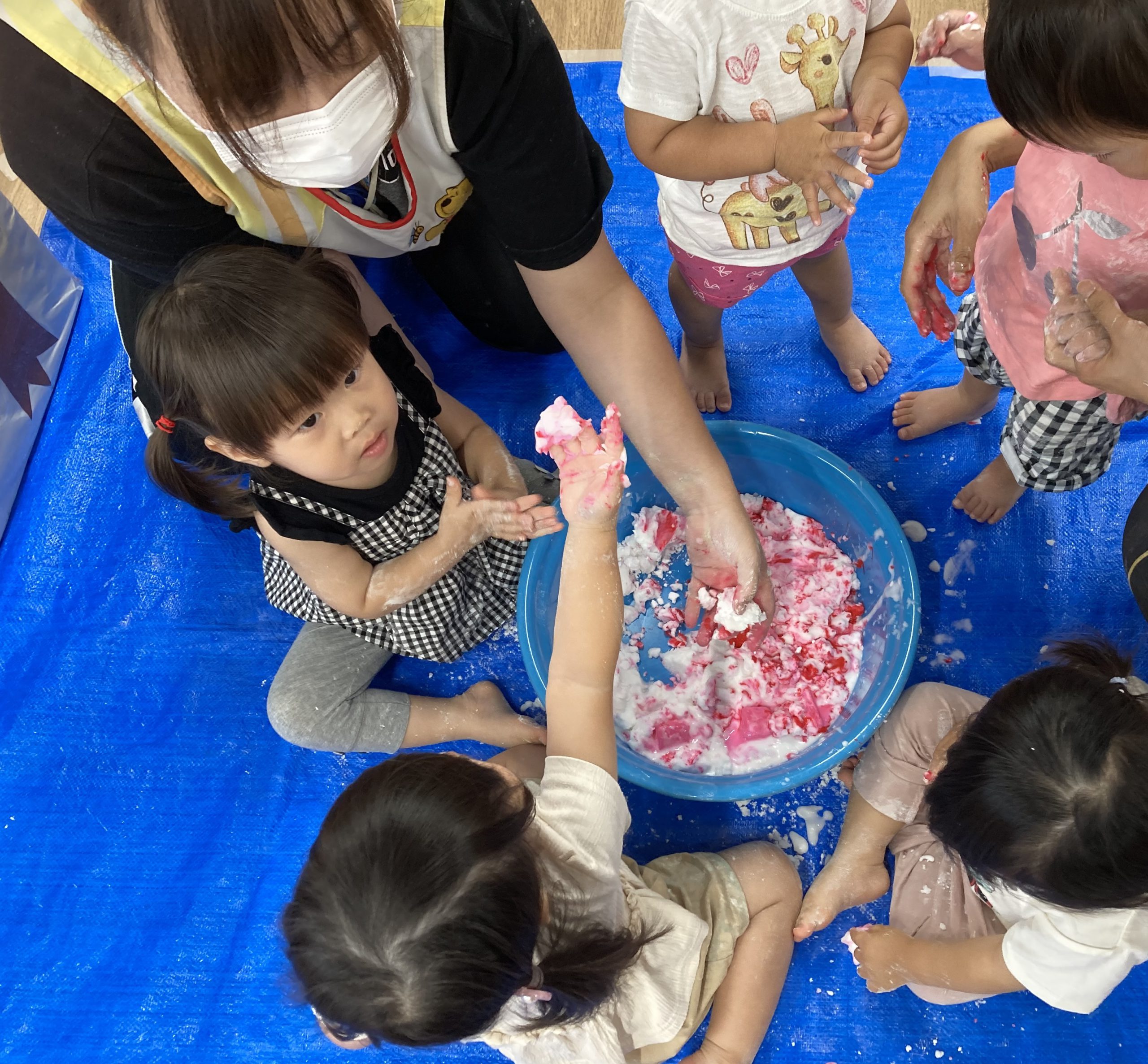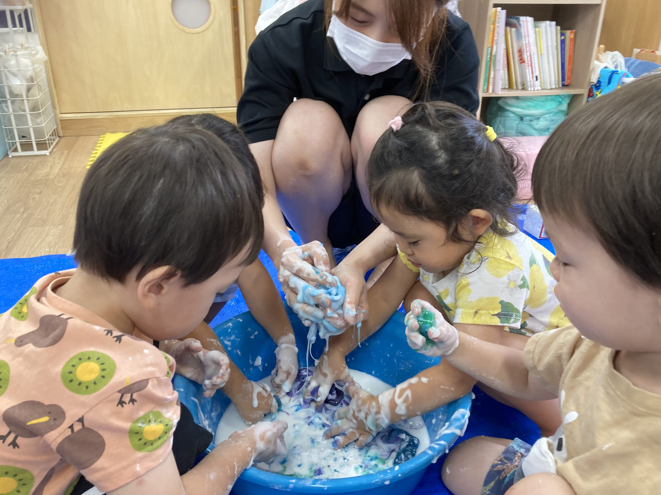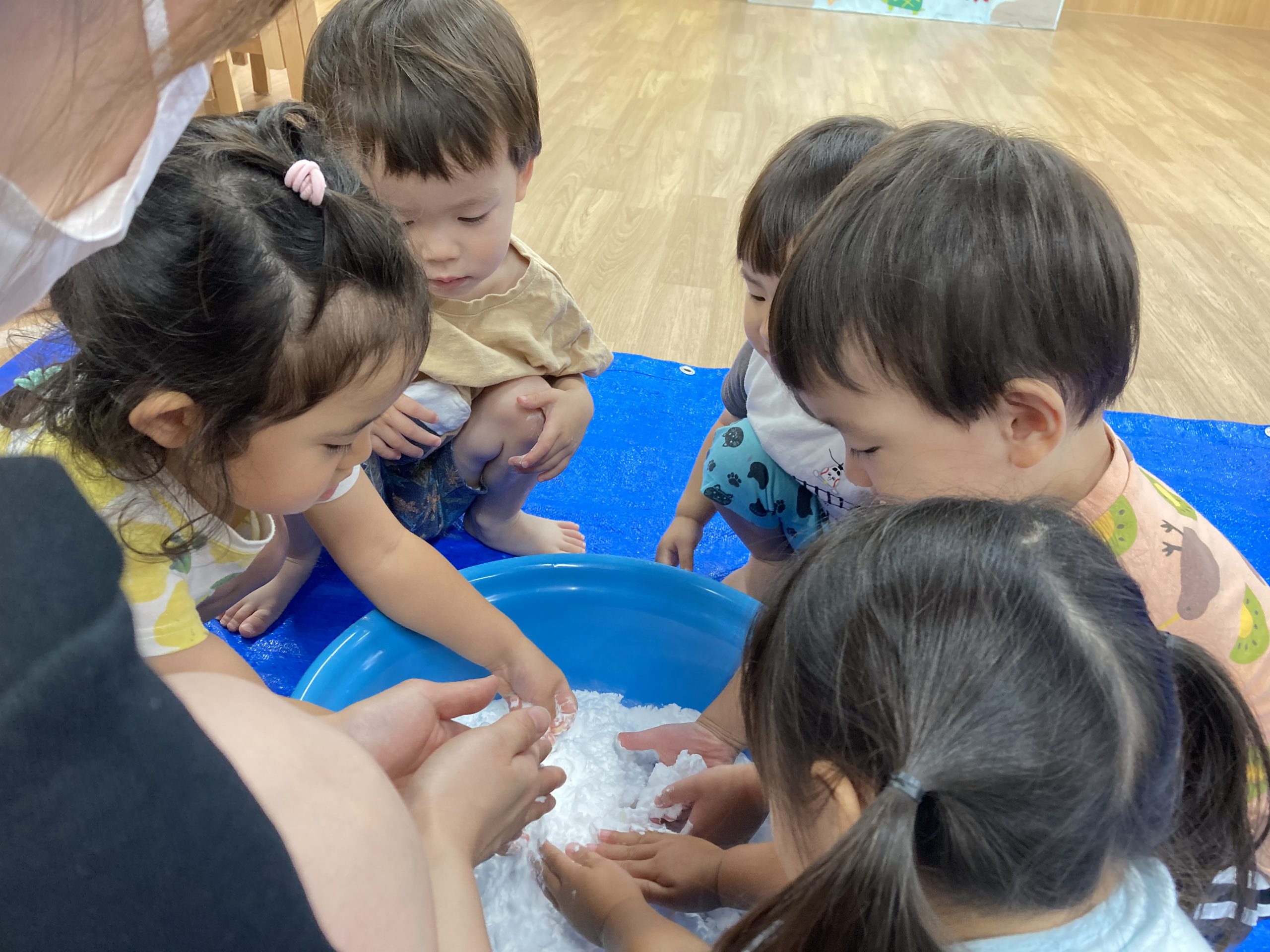 片栗粉遊び🎶2023年7月14日(金) 今日はみんなで片栗粉遊びを楽しみました🎶 まずは、片栗粉を触ってみました🎵 お水を少し入れてみよう♬ もっとお水を入れて・・ トロトロ・・・ 氷絵の具を使って色を付けてみよう~🎶 トロトロの感触を楽しみました🎵 « 7月18日(火)プール開き♬ 七夕の集い🎋 »