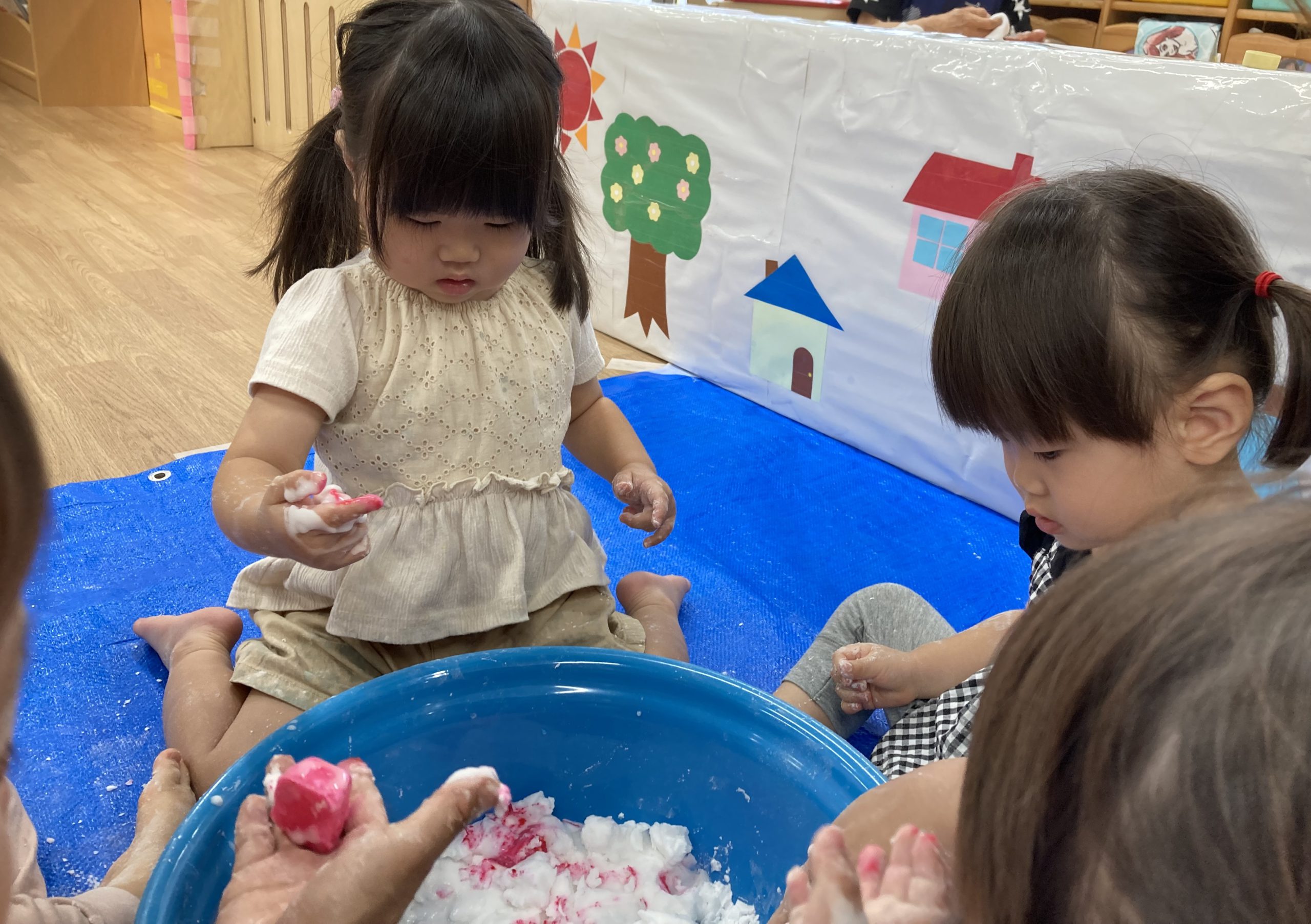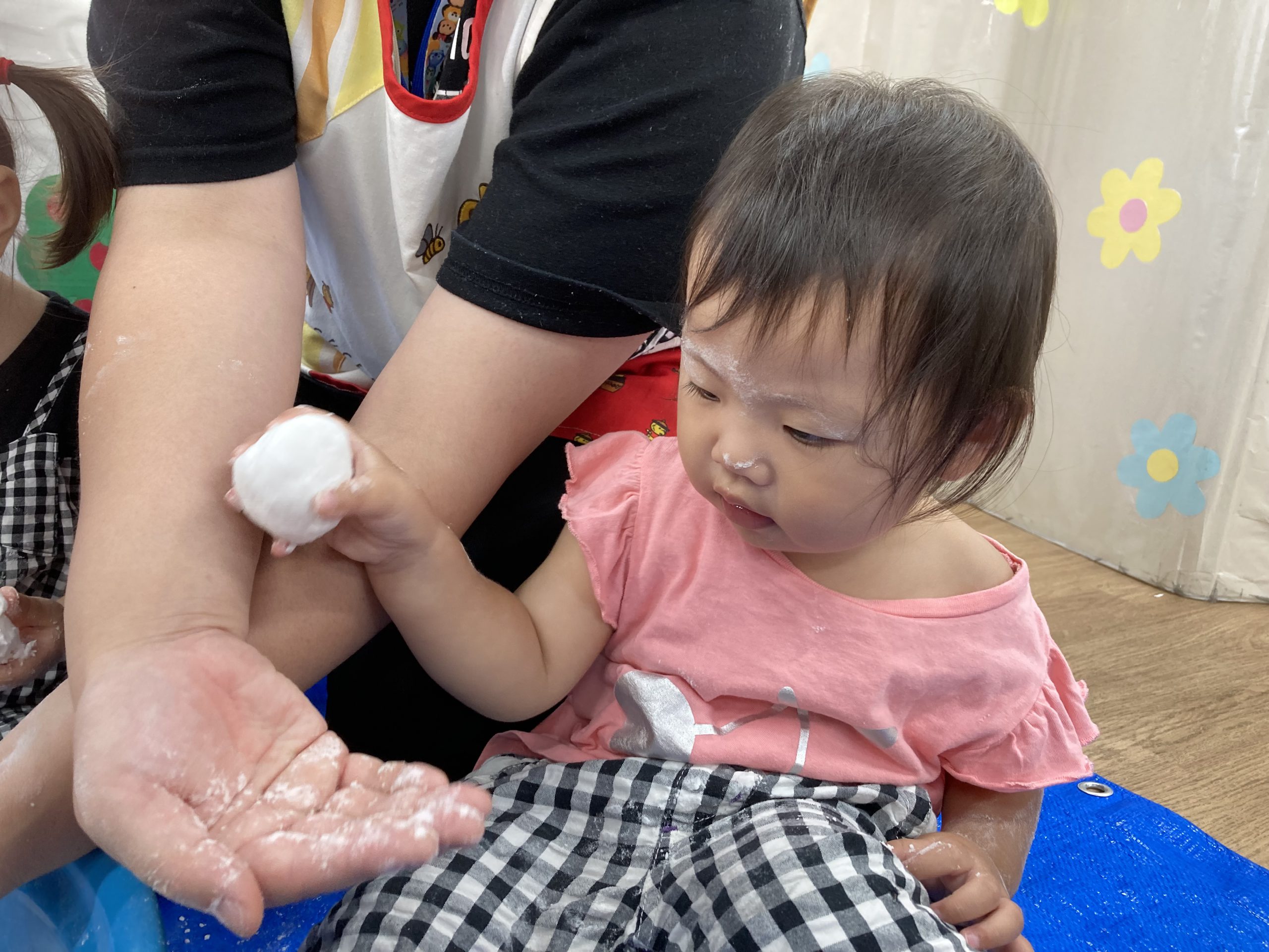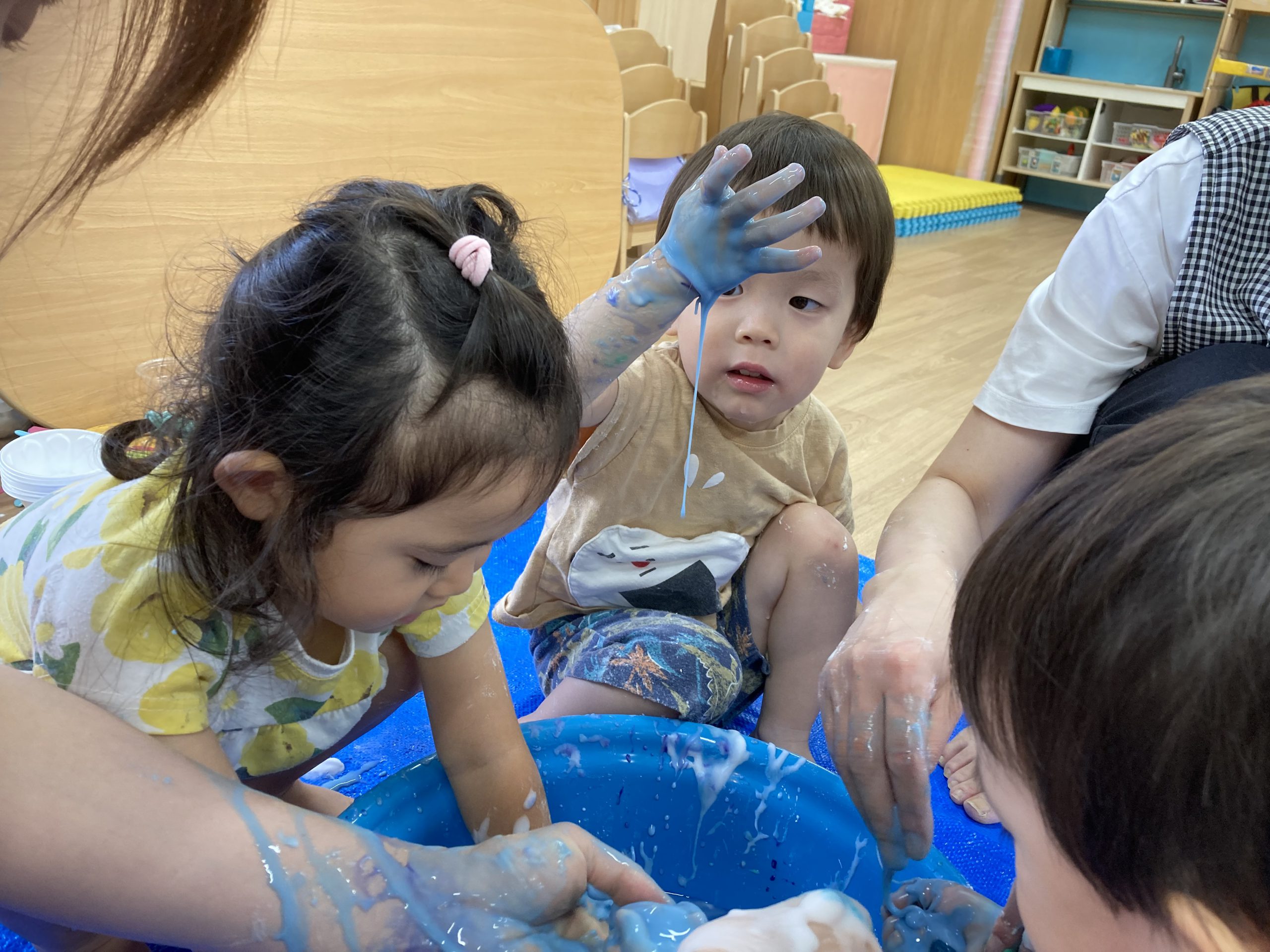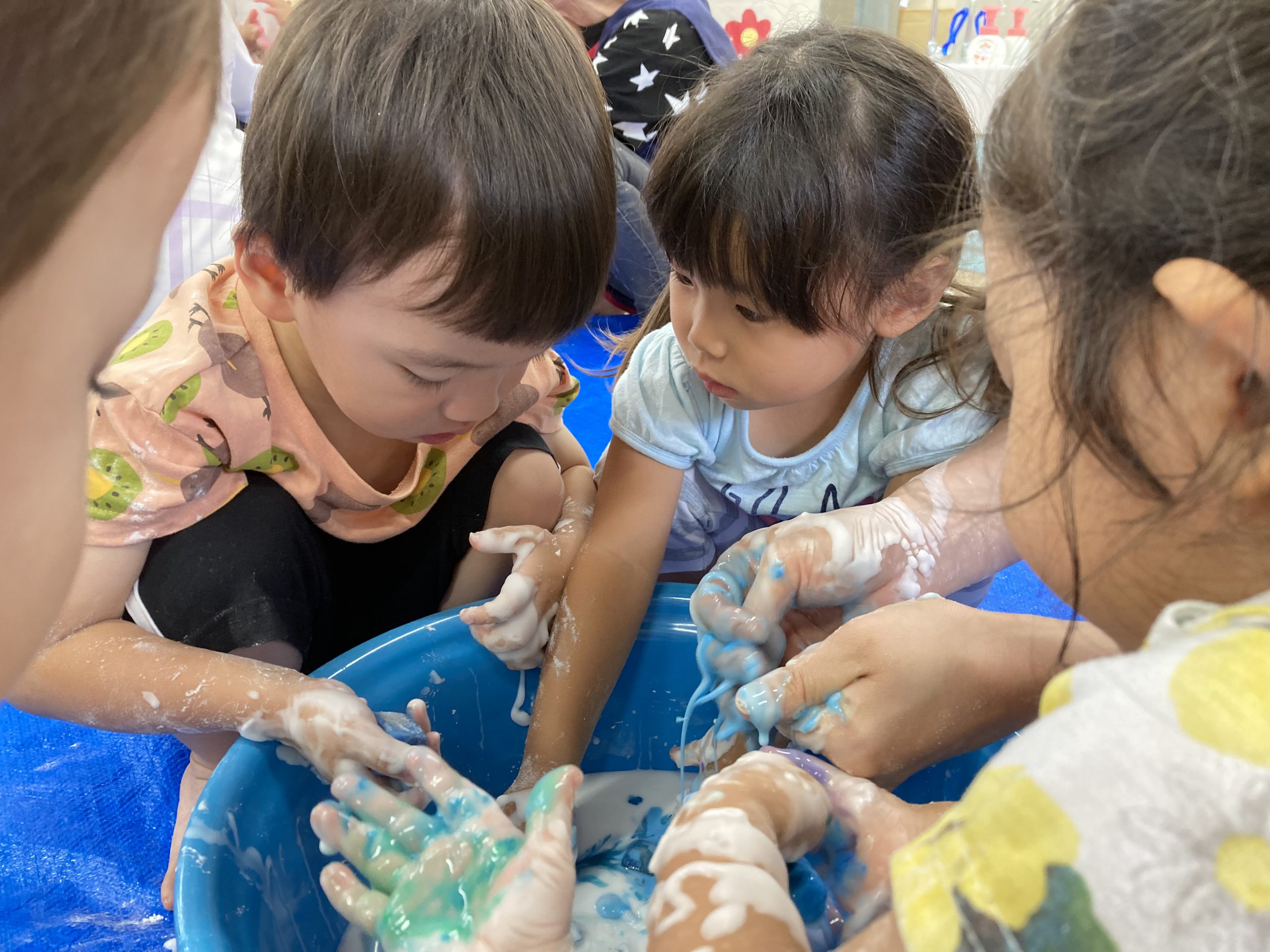 片栗粉遊び🎶2023年7月14日(金) 今日はみんなで片栗粉遊びを楽しみました🎶 まずは、片栗粉を触ってみました🎵 お水を少し入れてみよう♬ もっとお水を入れて・・ トロトロ・・・ 氷絵の具を使って色を付けてみよう~🎶 トロトロの感触を楽しみました🎵 « 7月18日(火)プール開き♬ 七夕の集い🎋 »