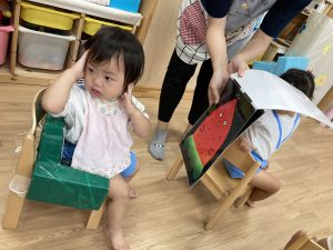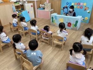 その後、保育者からの“へんしんおばけ”のカードシアターをみました。