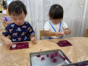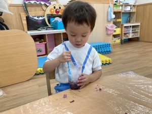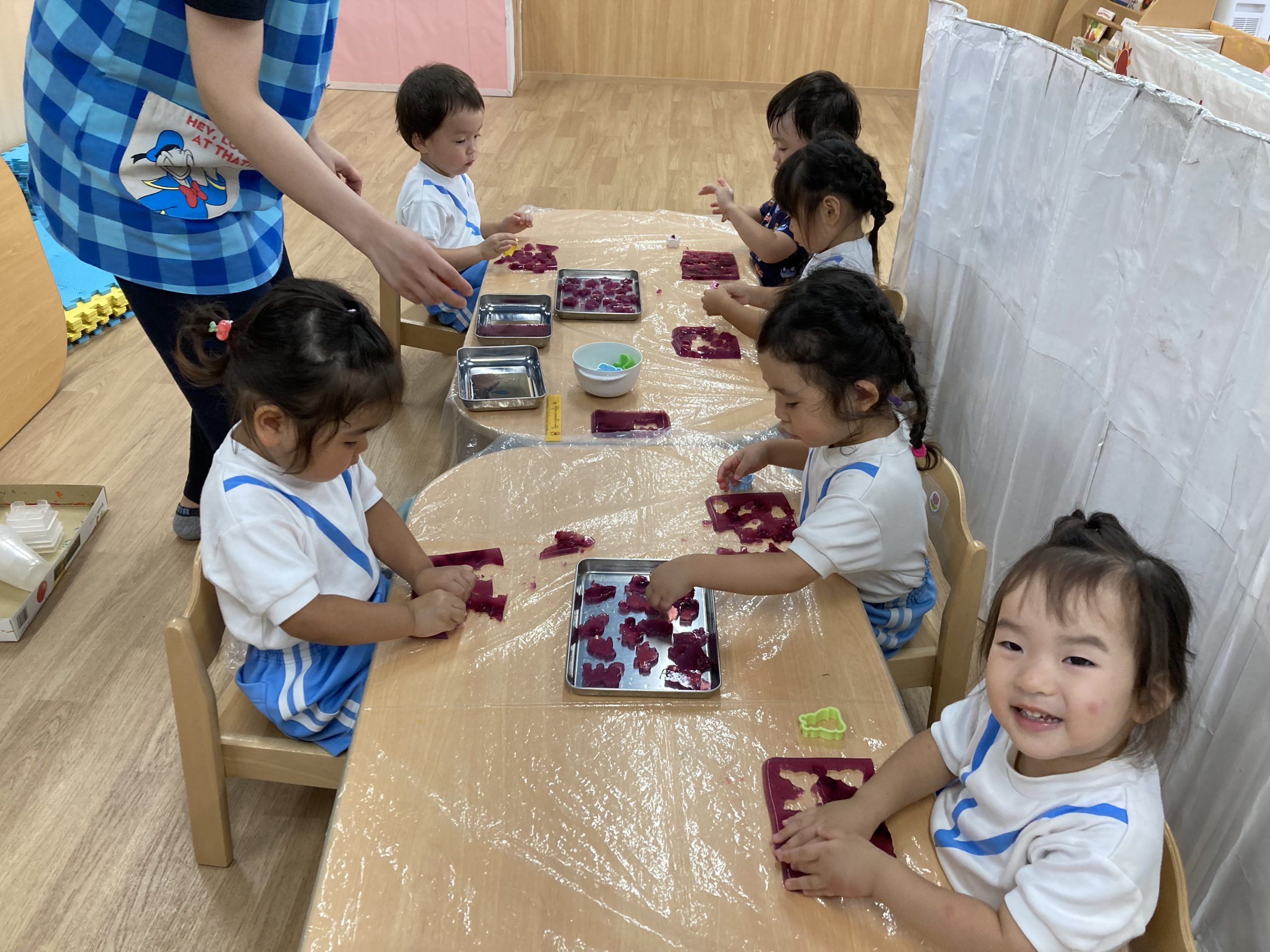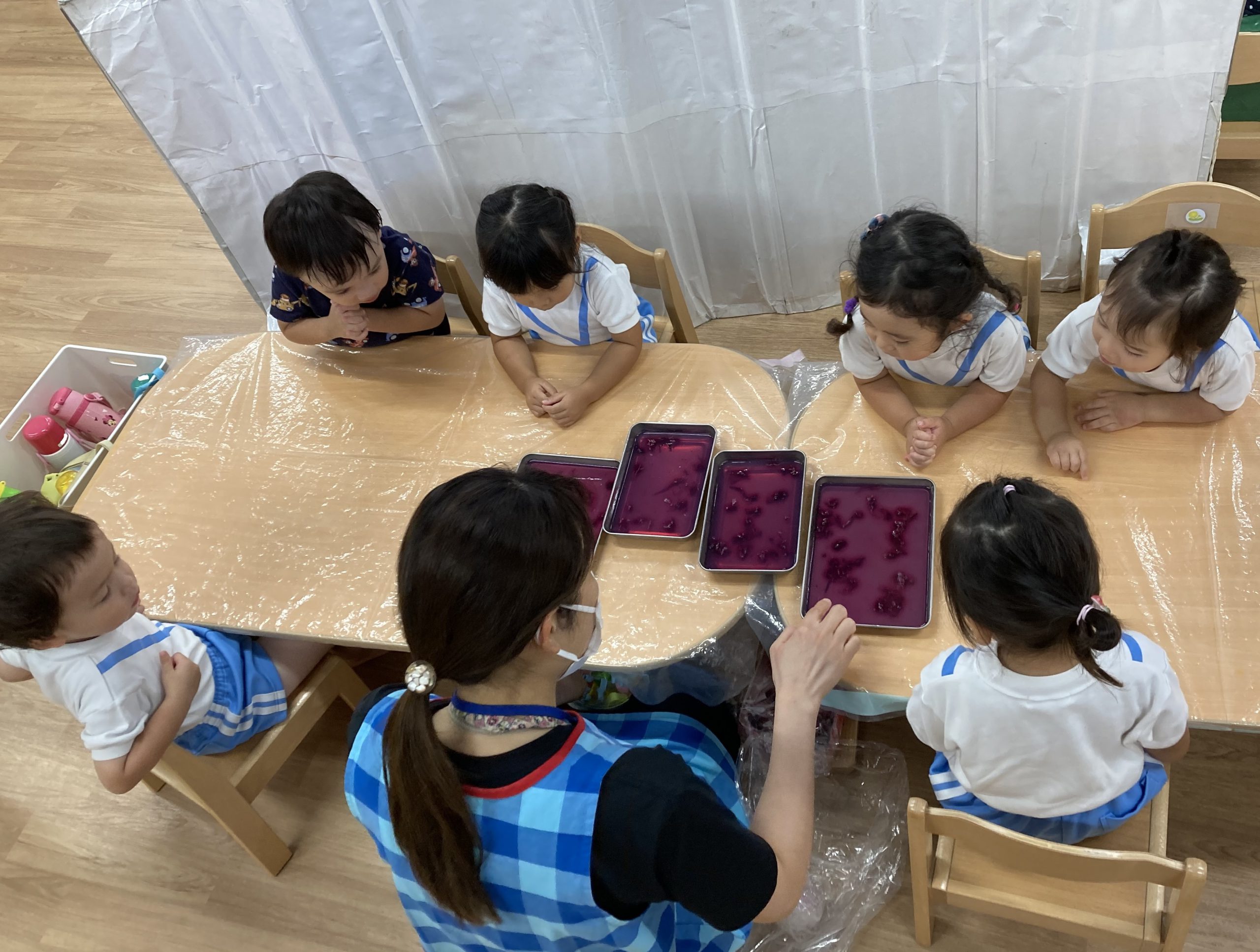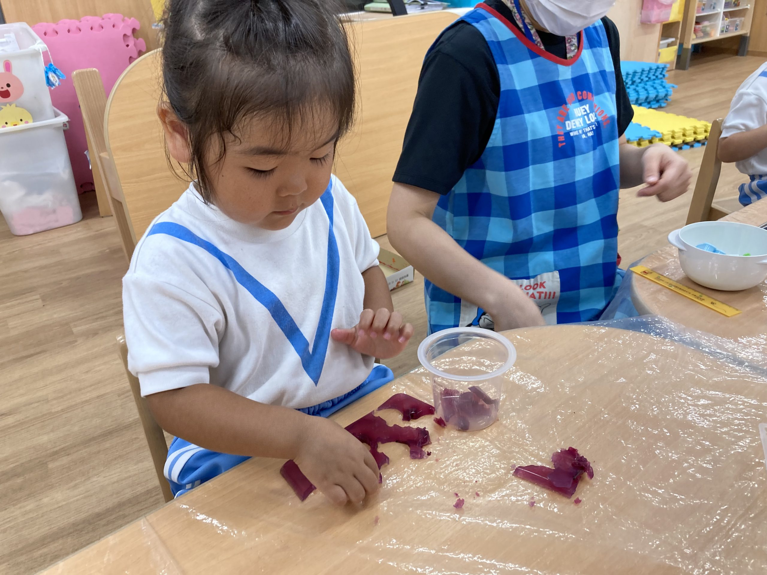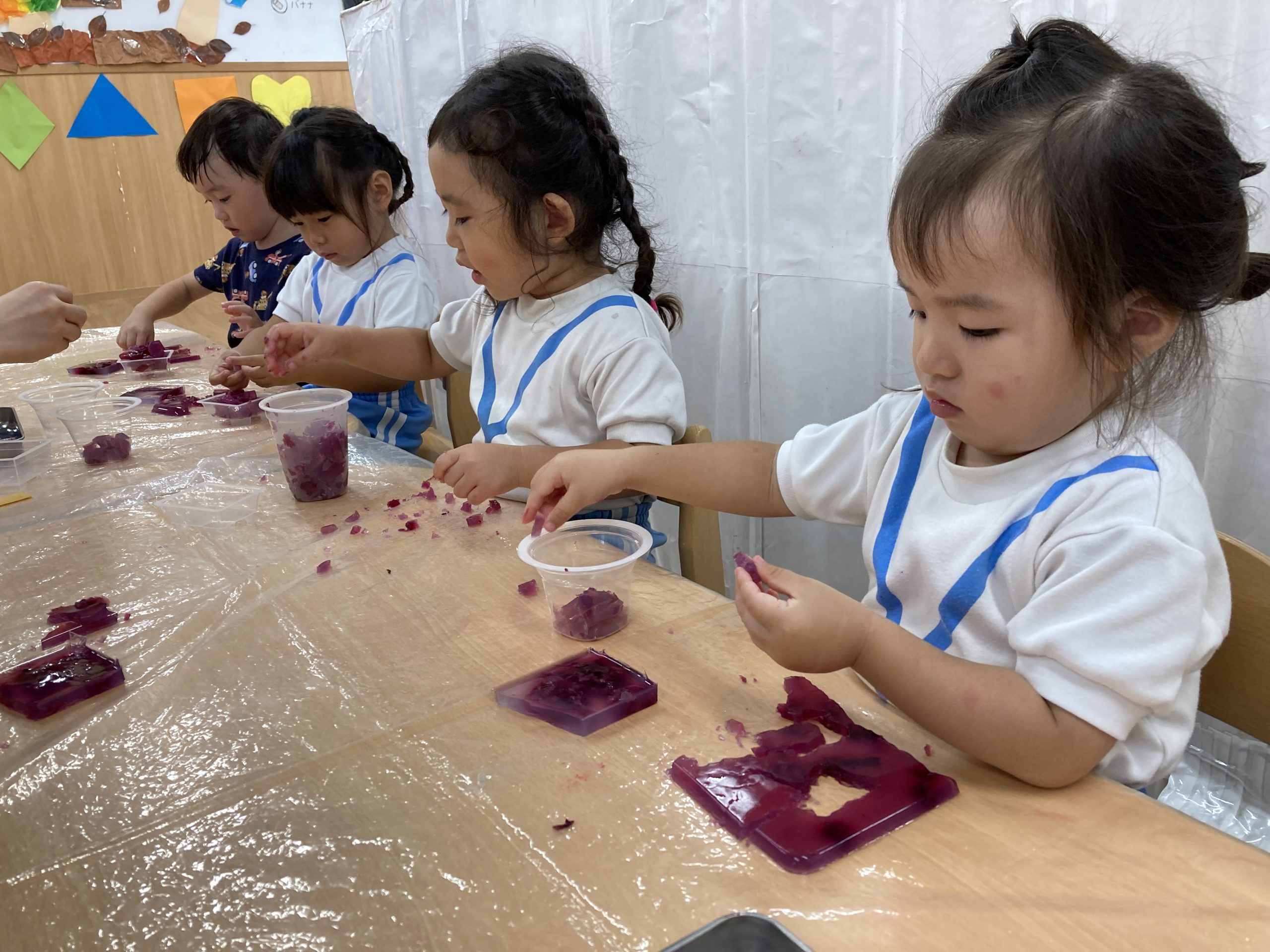 寒天遊び🎶 こぐま組2023年9月28日(木) 今日は、体操教室の後こぐま組は寒天遊びを楽しみました🎶 寒天の色は、あさがおの花で作った色水を使いました。寒天の中には、あさがおの花が入っています🎵 まずは触ってみよう♪ 次は、型抜きをしてみよう♬ 完成❕❕ 残った寒天をカップの中に入れて、何を作ろうかな・・・ 泡をのせて・・・ 最後は、袋の中に入れて寒天の感触を楽しみました🎵 寒天一つで型抜き、ジュース作り方、感触あそび等色々な遊びが楽しめたね♬ 楽しかったね♬ また、遊ぼうね🎵 « 十五夜🎑 9月のお誕生日会🎉 »
