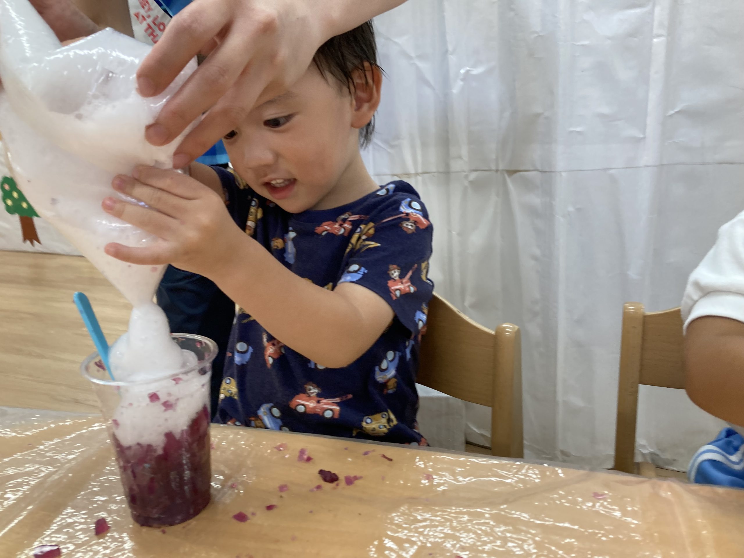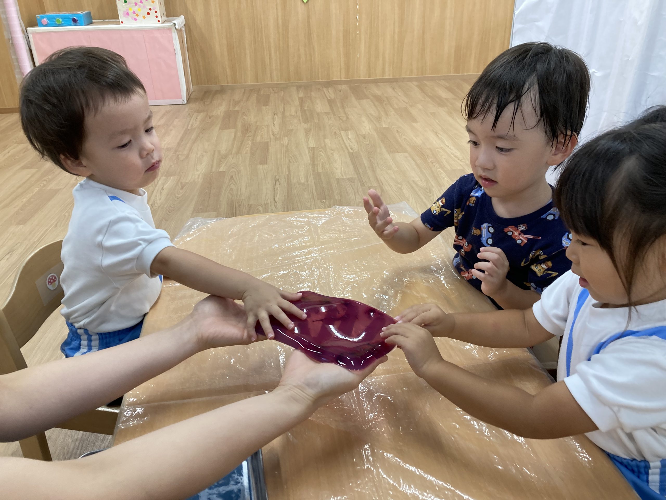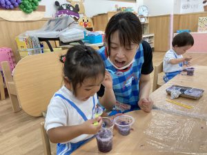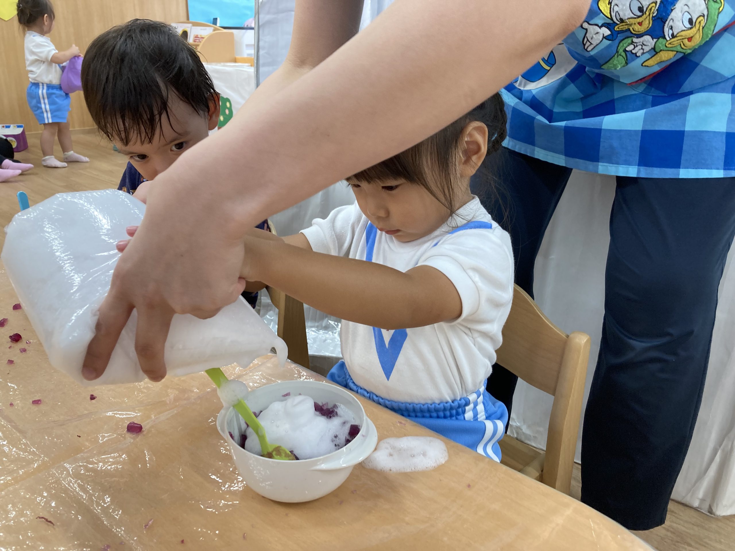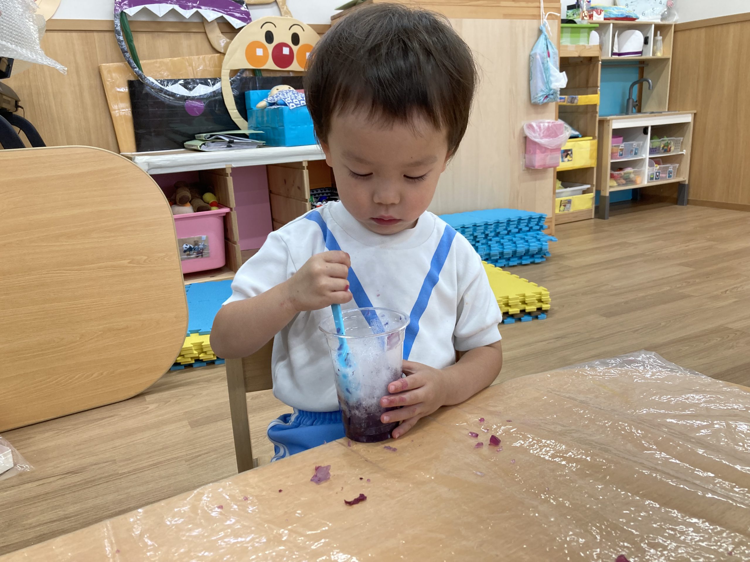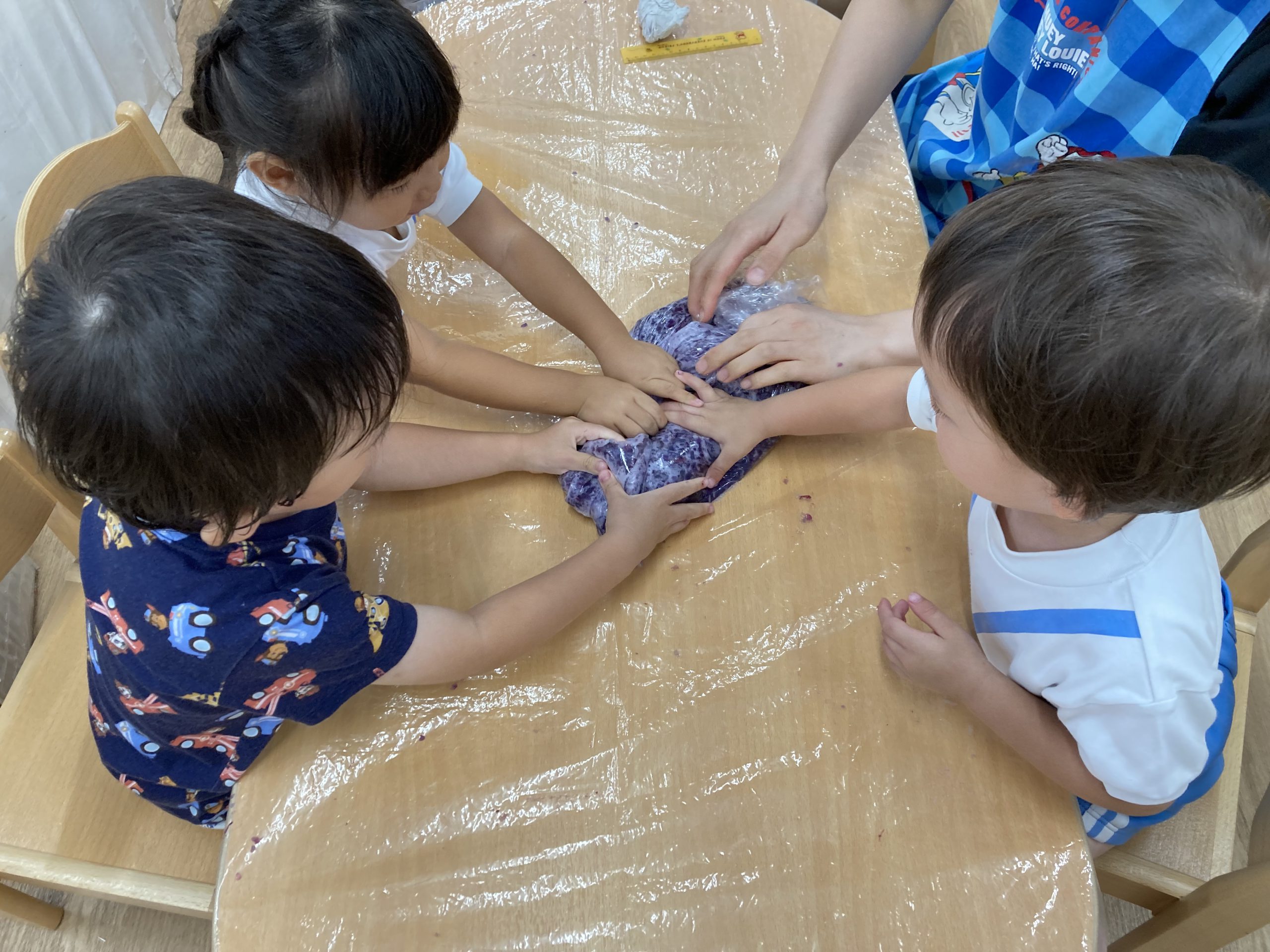寒天遊び🎶 こぐま組2023年9月28日(木) 今日は、体操教室の後こぐま組は寒天遊びを楽しみました🎶 寒天の色は、あさがおの花で作った色水を使いました。寒天の中には、あさがおの花が入っています🎵 まずは触ってみよう♪ 次は、型抜きをしてみよう♬ 完成❕❕ 残った寒天をカップの中に入れて、何を作ろうかな・・・ 泡をのせて・・・ 最後は、袋の中に入れて寒天の感触を楽しみました🎵 寒天一つで型抜き、ジュース作り方、感触あそび等色々な遊びが楽しめたね♬ 楽しかったね♬ また、遊ぼうね🎵 « 十五夜🎑 9月のお誕生日会🎉 »