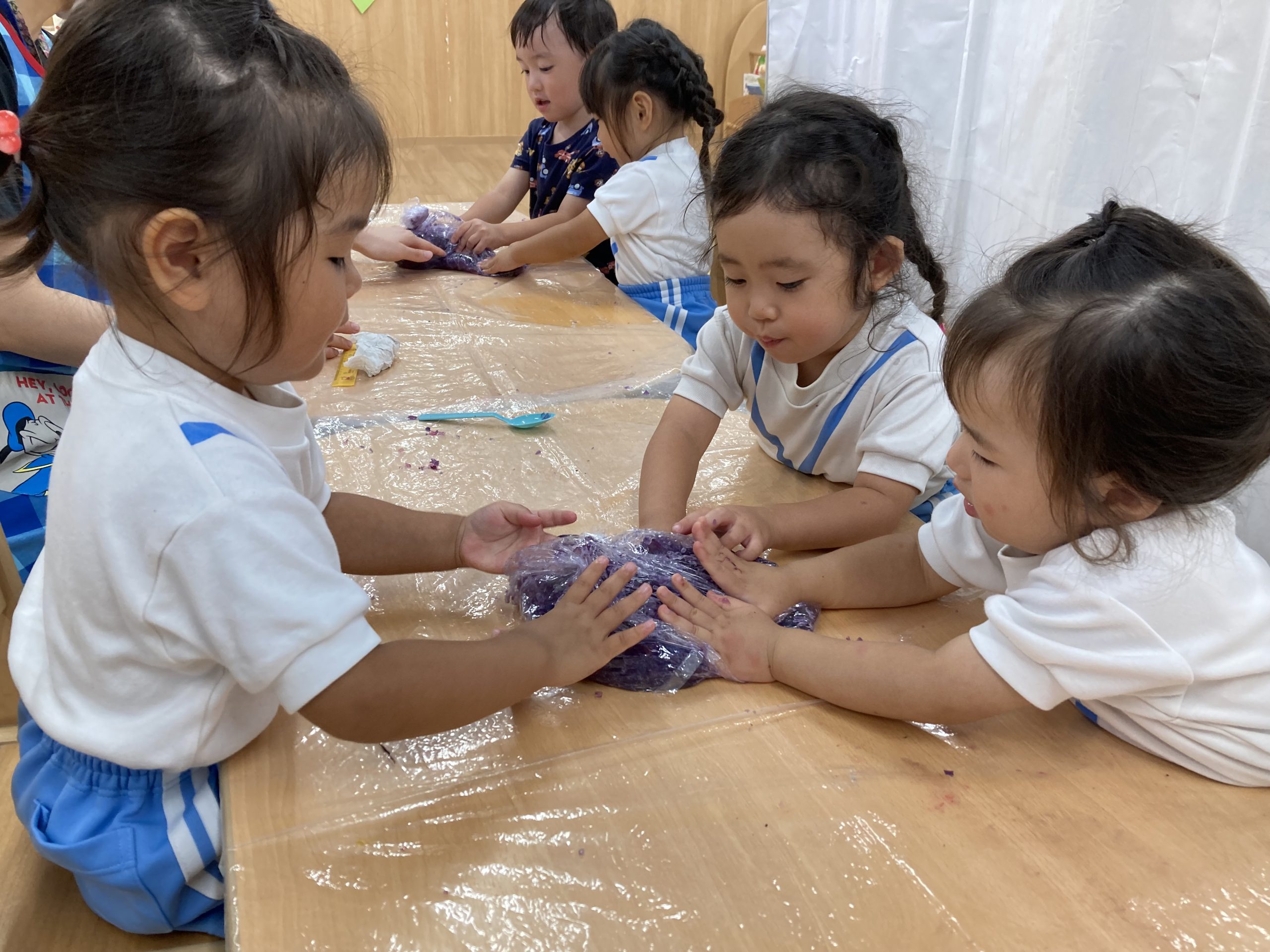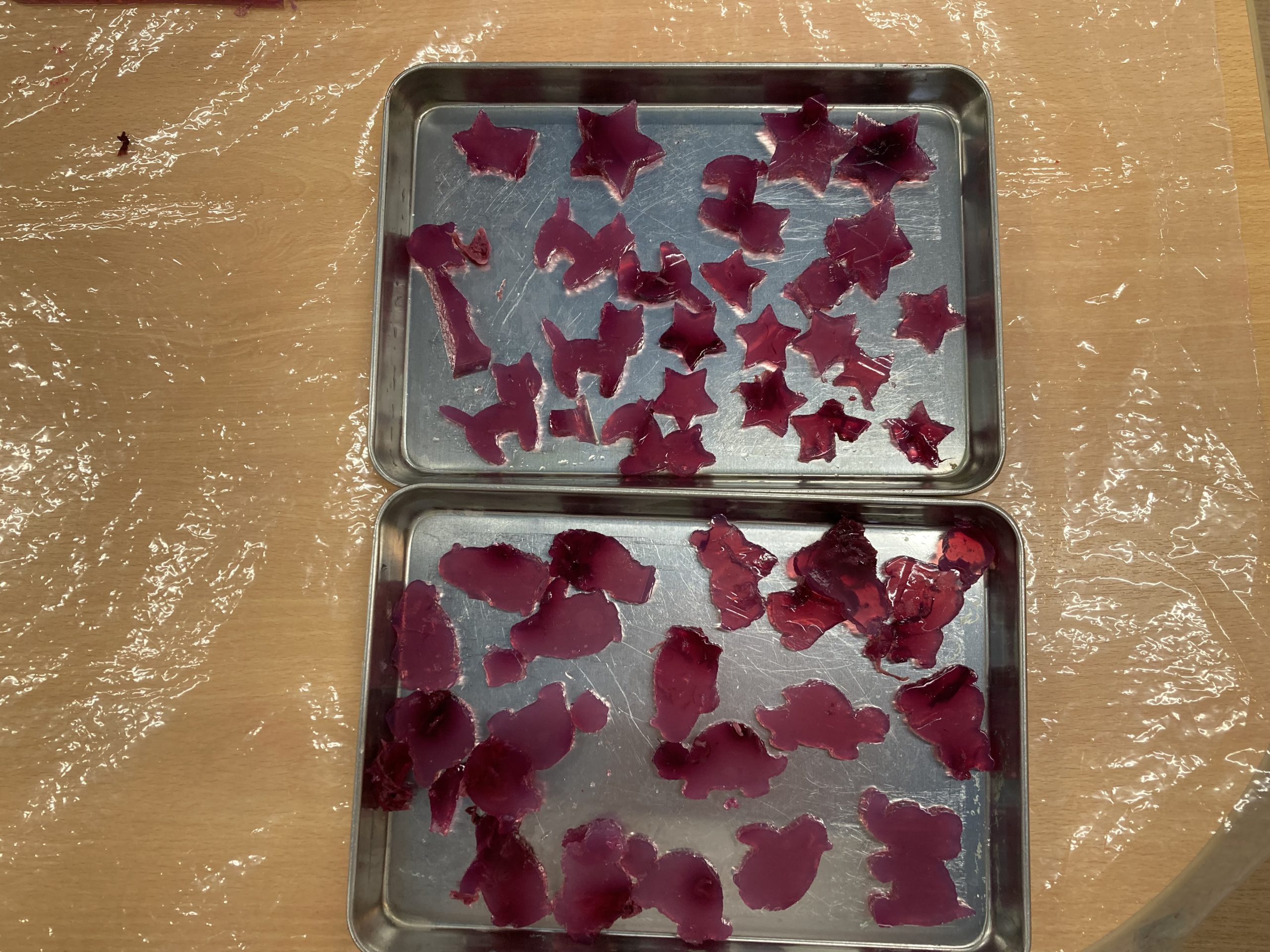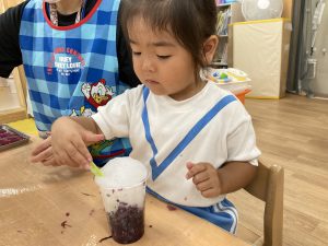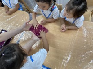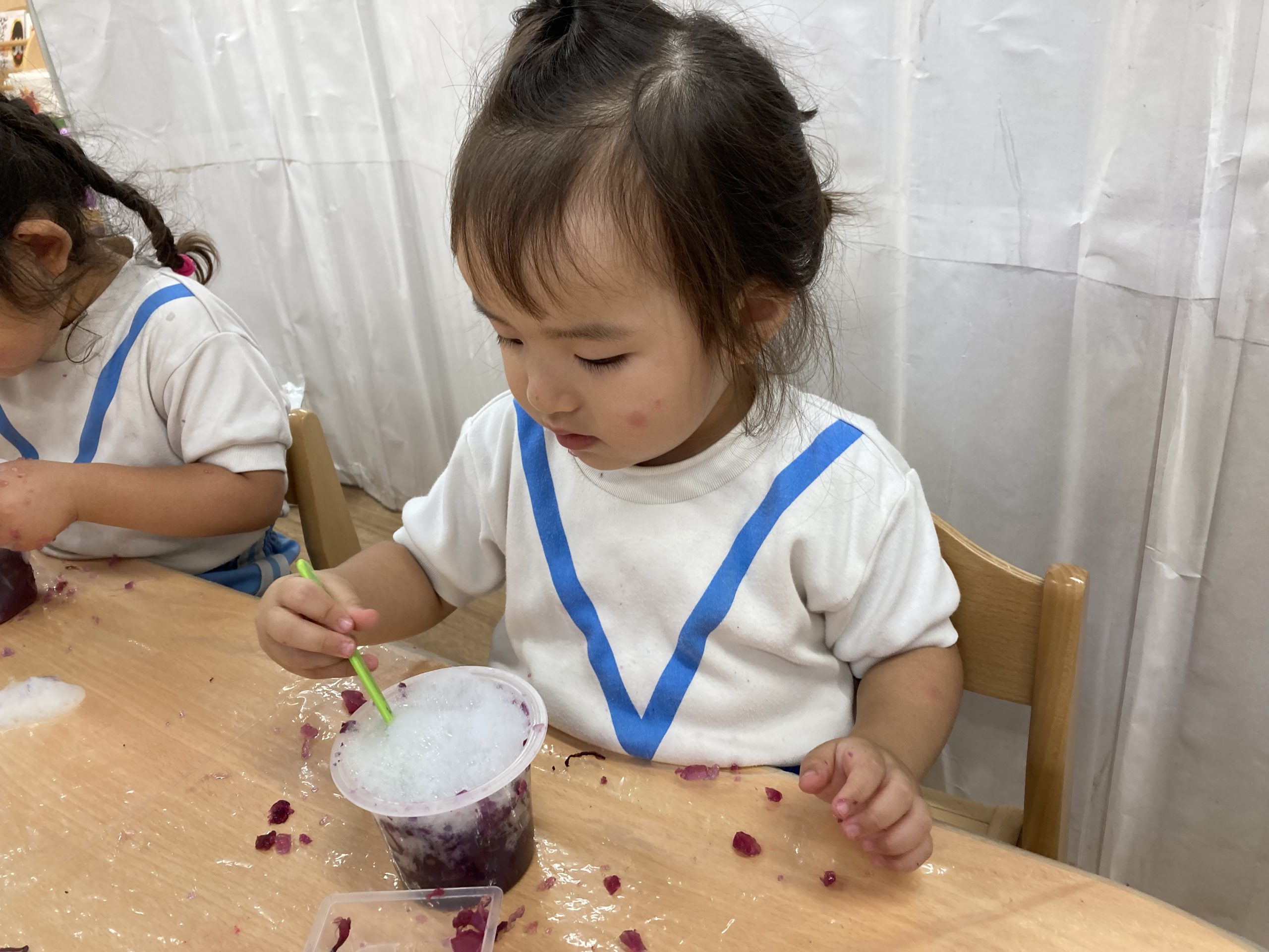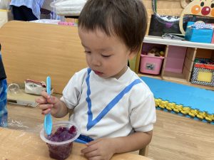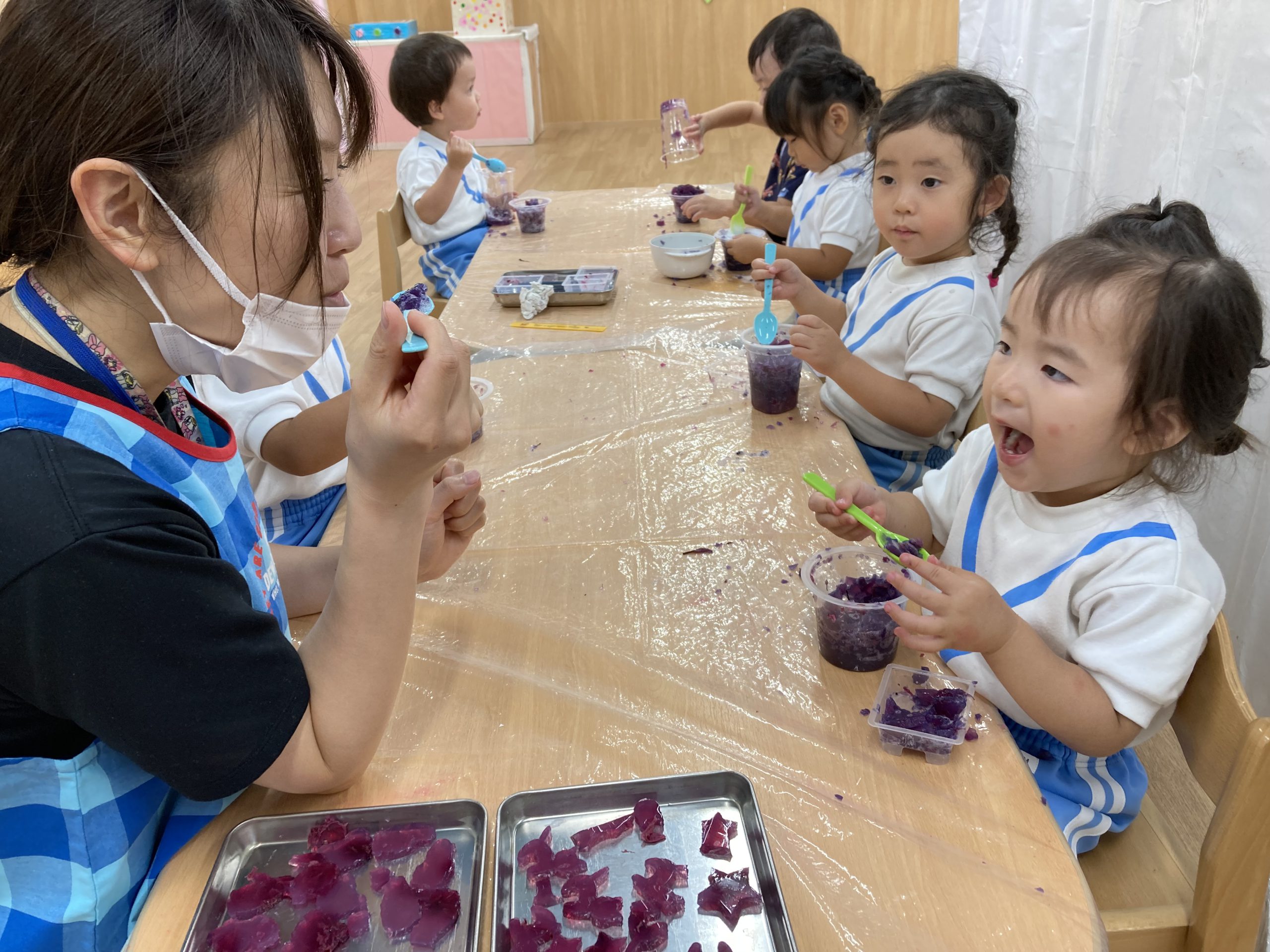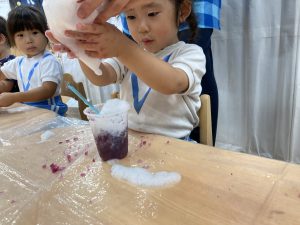 寒天遊び🎶 こぐま組2023年9月28日(木) 今日は、体操教室の後こぐま組は寒天遊びを楽しみました🎶 寒天の色は、あさがおの花で作った色水を使いました。寒天の中には、あさがおの花が入っています🎵 まずは触ってみよう♪ 次は、型抜きをしてみよう♬ 完成❕❕ 残った寒天をカップの中に入れて、何を作ろうかな・・・ 泡をのせて・・・ 最後は、袋の中に入れて寒天の感触を楽しみました🎵 寒天一つで型抜き、ジュース作り方、感触あそび等色々な遊びが楽しめたね♬ 楽しかったね♬ また、遊ぼうね🎵 « 十五夜🎑 9月のお誕生日会🎉 »