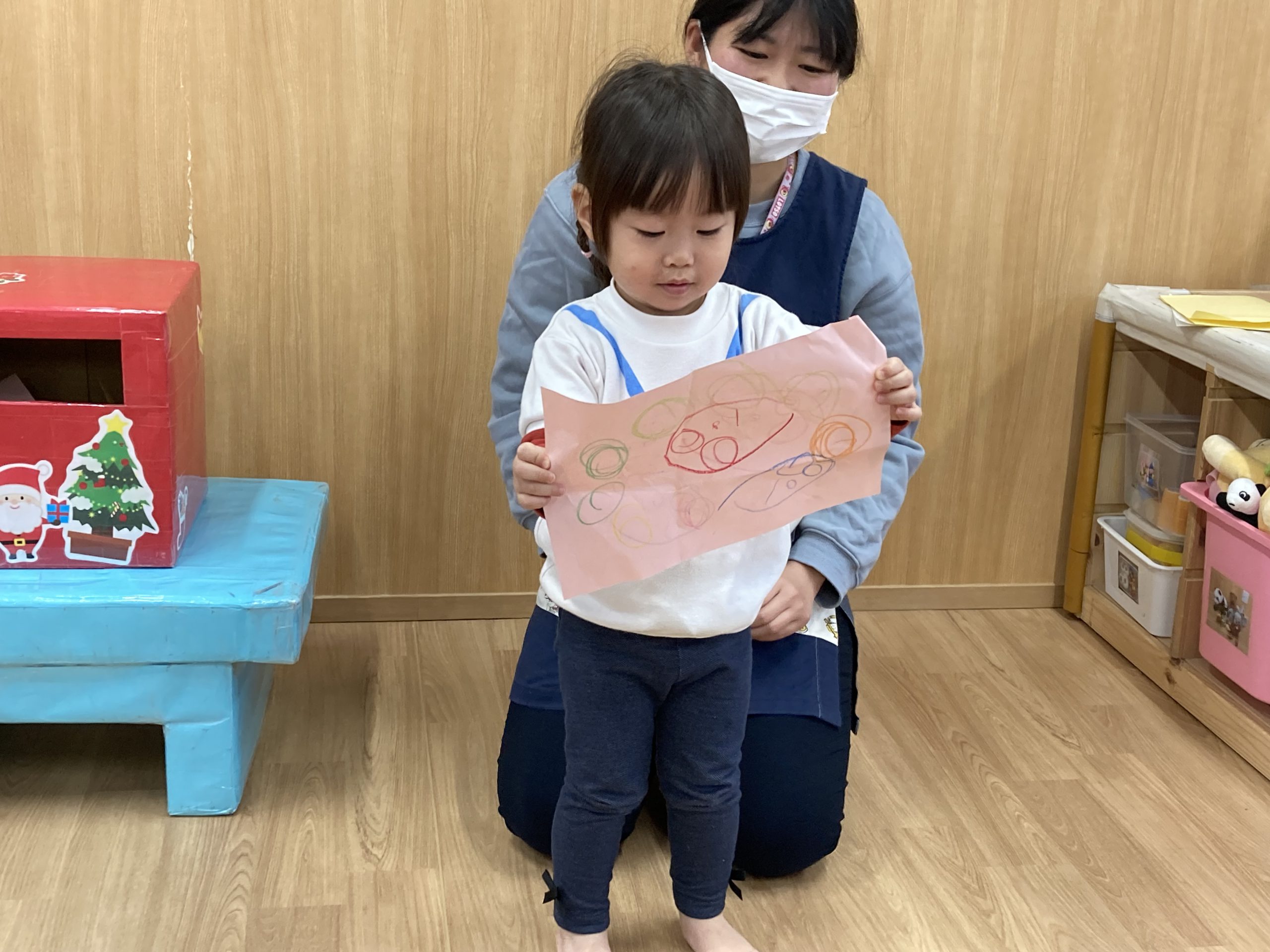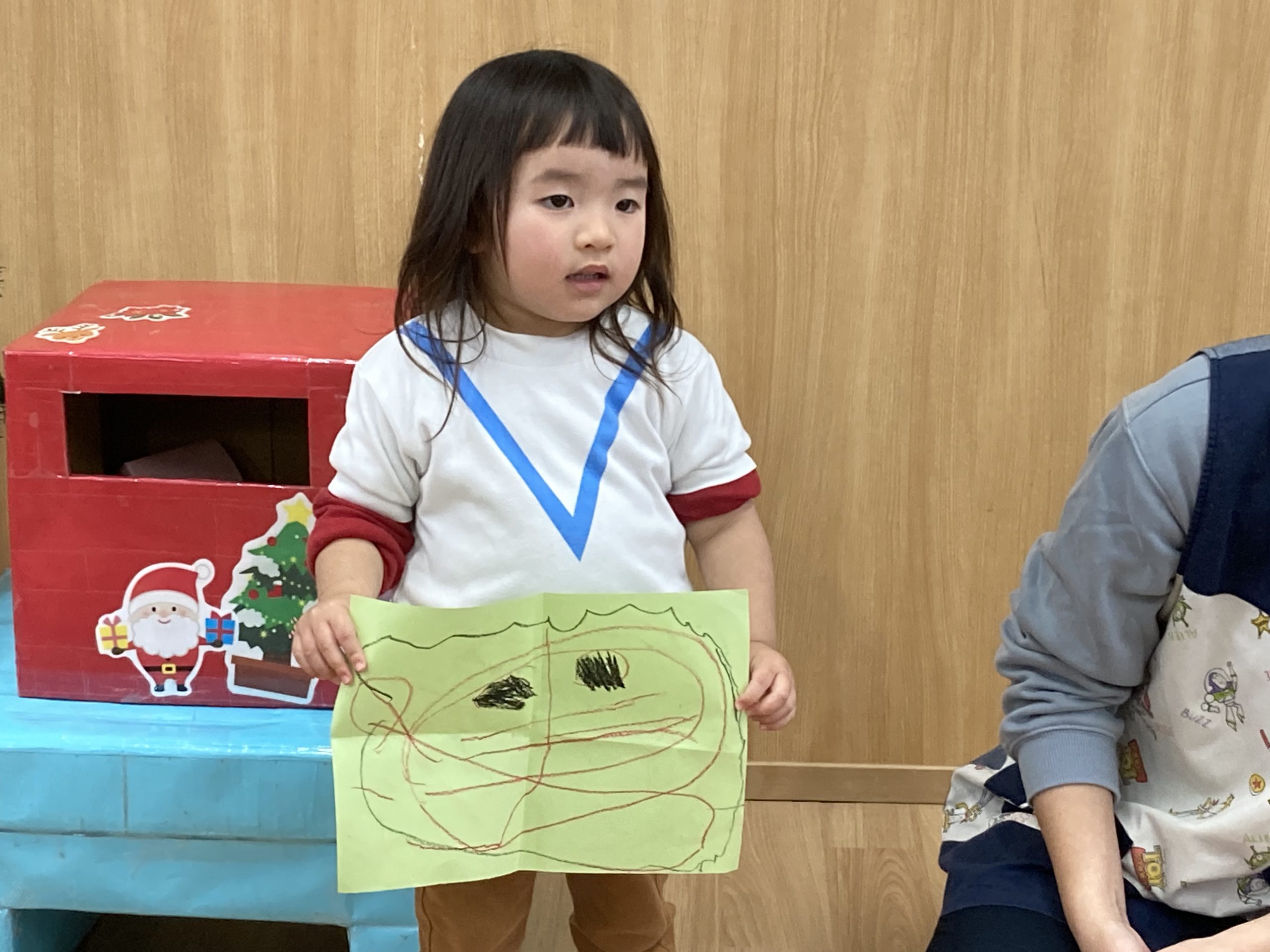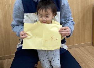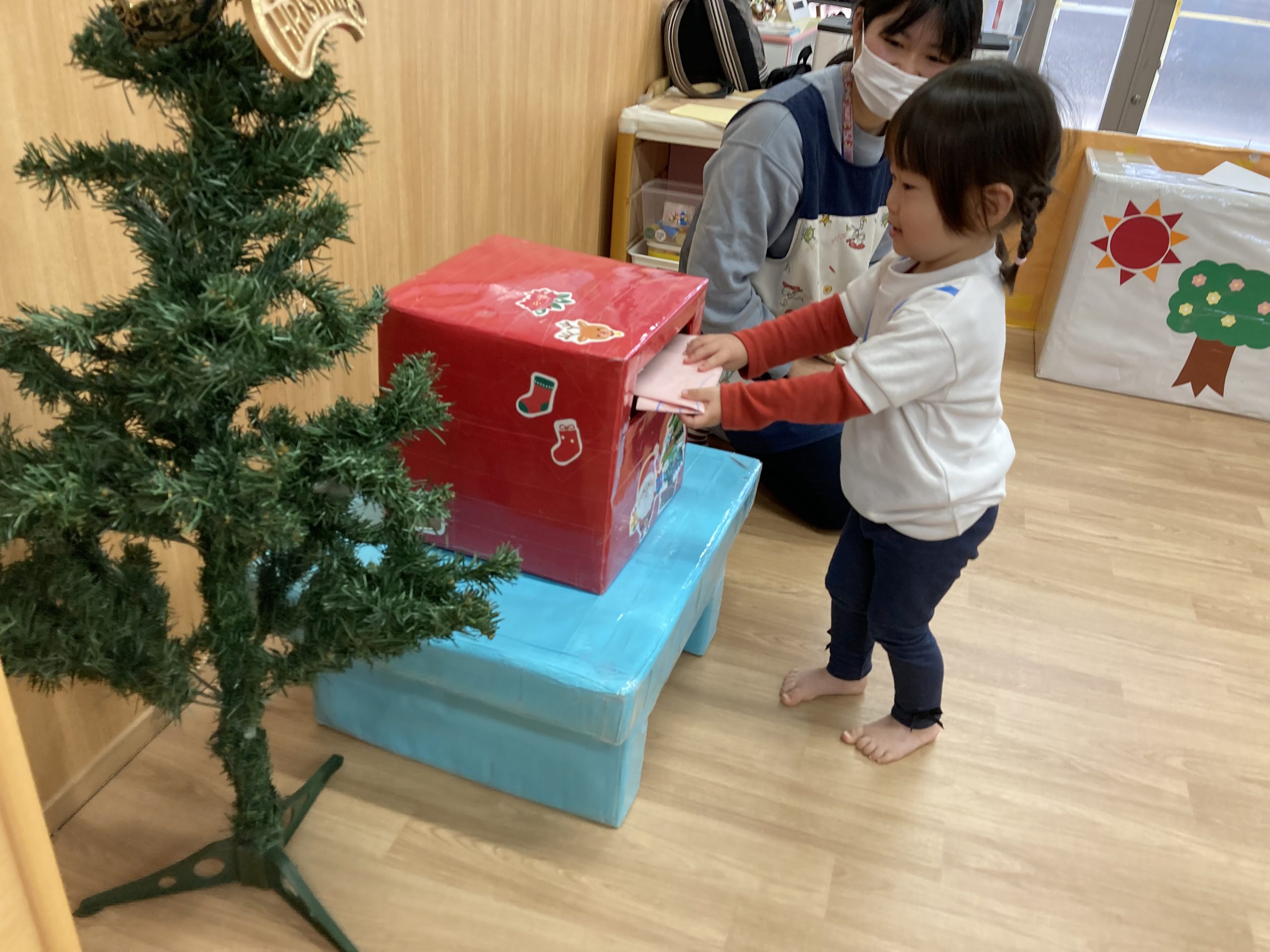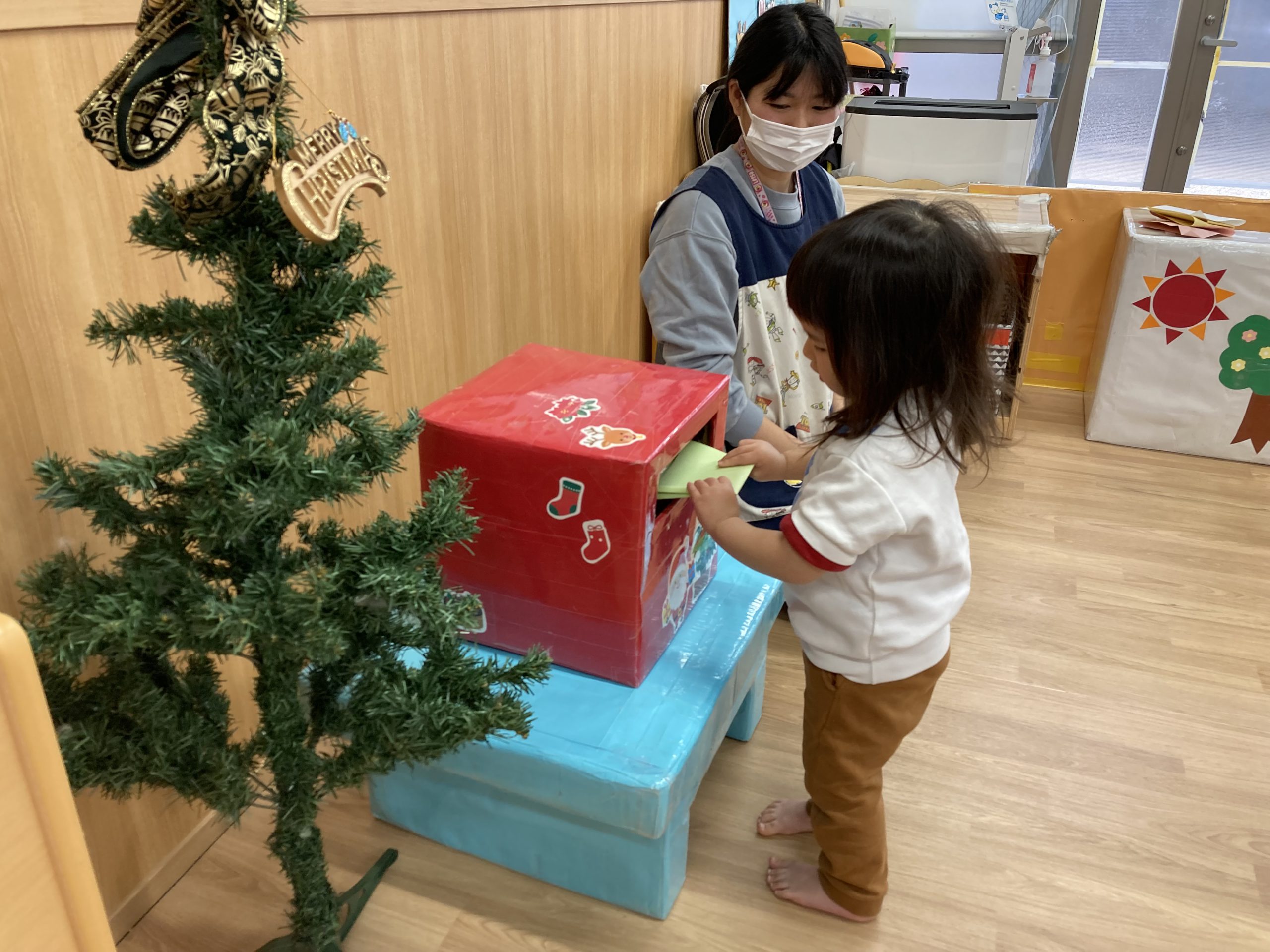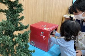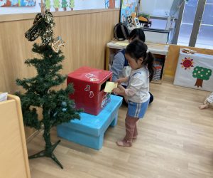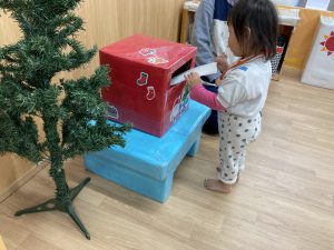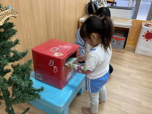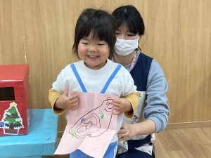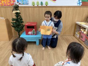 クリスマスに向けて🎶 part12023年12月20日(水) 今日は、クリスマスに向けて準備をしました♬ 「みんなは、どんなプレゼントが欲しいのかな・・?」ってサンタクロースは、困っているかもしれないのでみんなの欲しいプレゼントの絵を描いてポストに入れました♪ ポストに入れよう~♬ そして、散歩から帰ってくるとサンタクロースからお手紙が届いていました🎶 子ども達は、大喜びでした🎶 サンタさん 子ども達のプレゼントをよろしくお願いします。 « クリスマスに向けて♬ part2 お買い物🎵 こぐま組 »