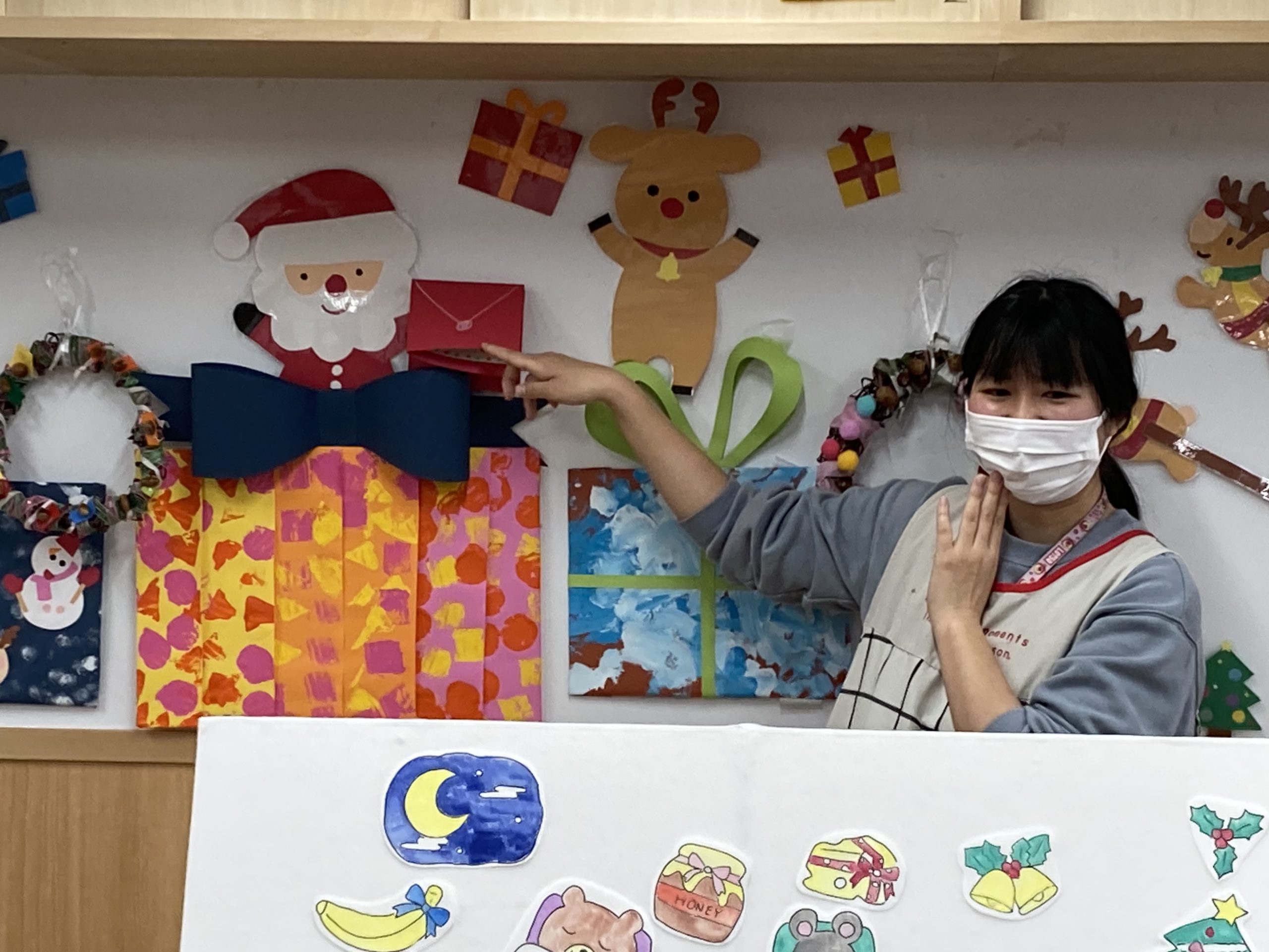 保育者が「くまさんにはどのプレゼントかな・・?」と聞くと「はちみつ」と言って教えてくれました♪