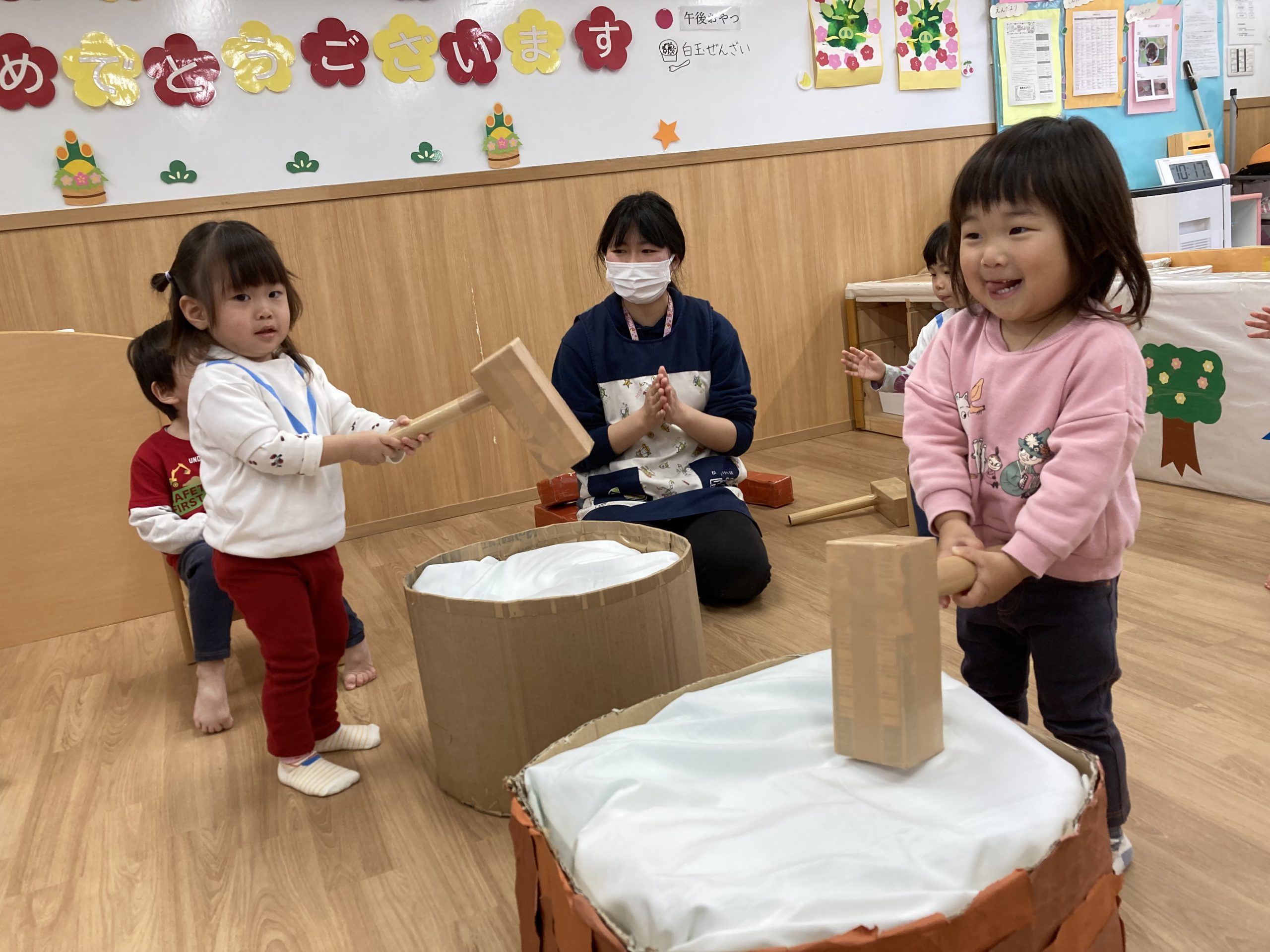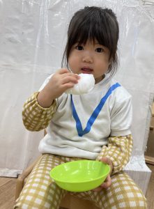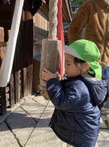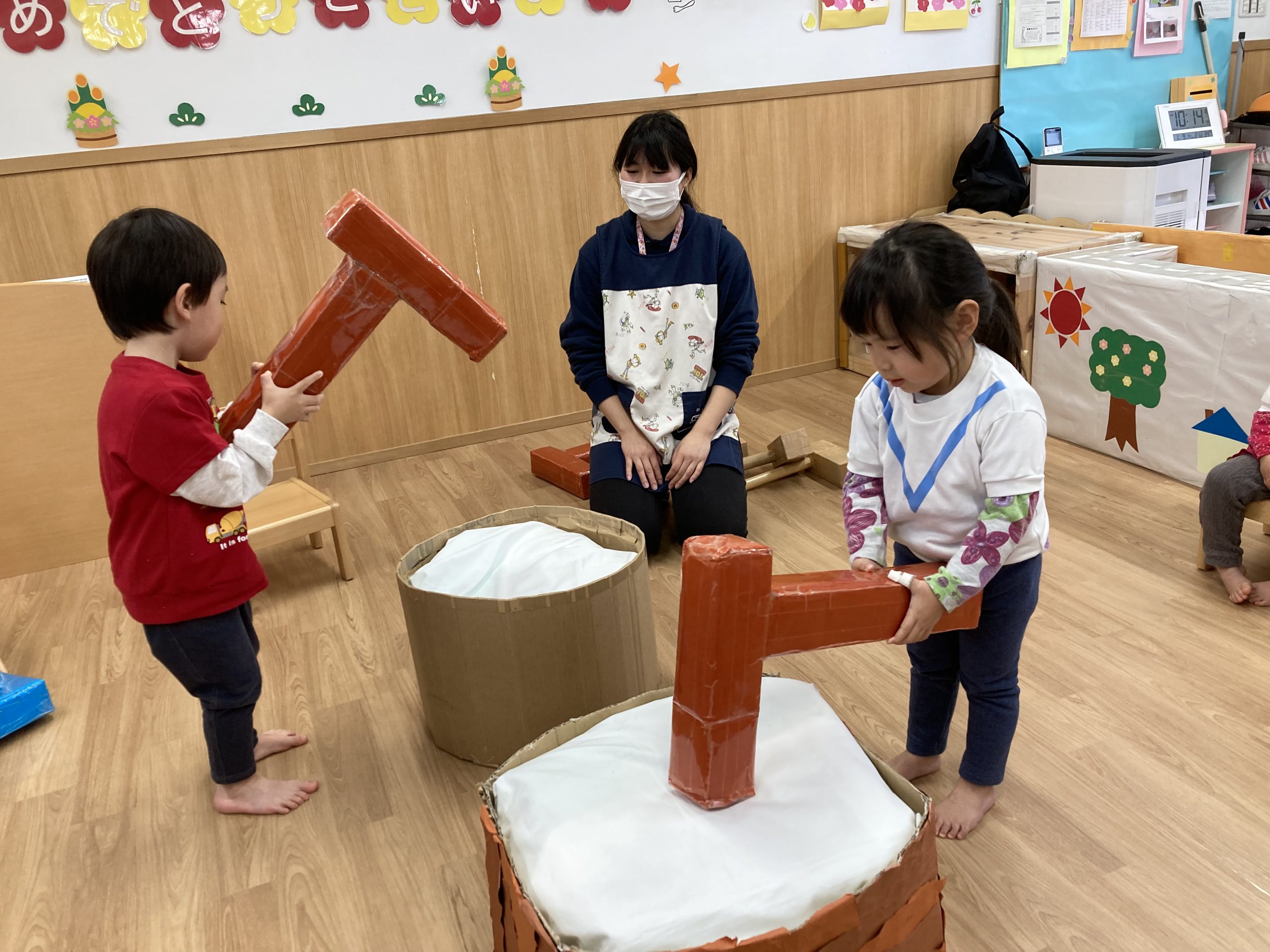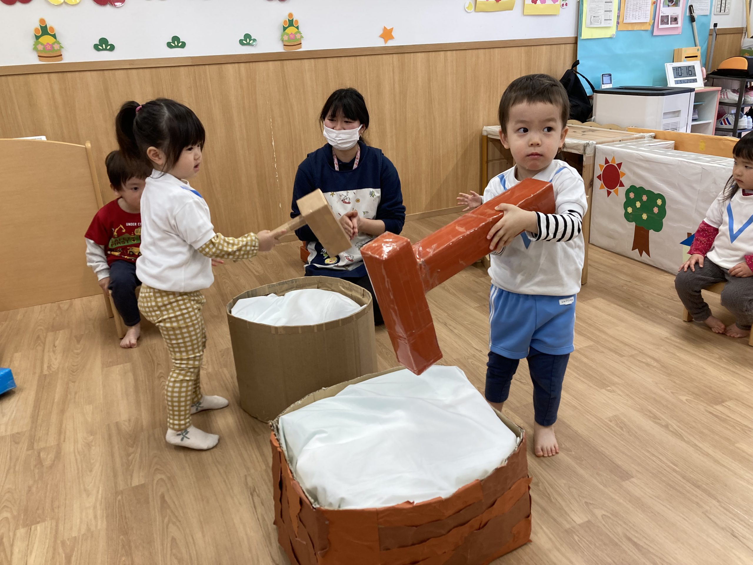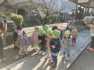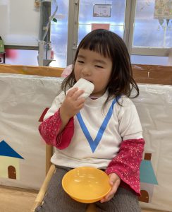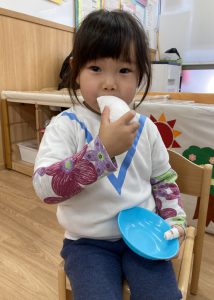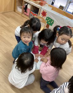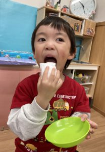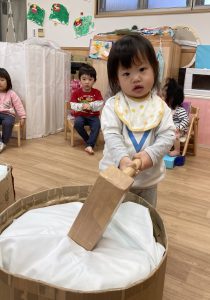 おもちつきごっこ🎶2024年1月9日(火) 新年あけましておめでとうございます。 本年もよろしくお願いいたします。 今日から子ども達も揃い新年がスタートしました🎵 今日は、早速おもちつきごっこを楽しみました🎶 「ぺったんこ それ ぺったんこ~~♪ 」もちつきの歌を歌いながら順番にお餅をついていきました🎵 みんなでついたおもちをこねこね~♬ 美味しいおもちができたかな~ 柔らかいおもちになったかな~ そして、食べてみました🎵 美味しそうに食べる子ども達でした♪ その後、天満宮へ初詣に行きました🎶 今年も健康で笑いの絶えない一年になりますように・・・ « 凧揚げ🎵 Merry Christmas🎅 »