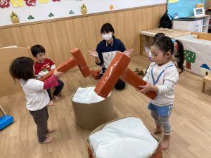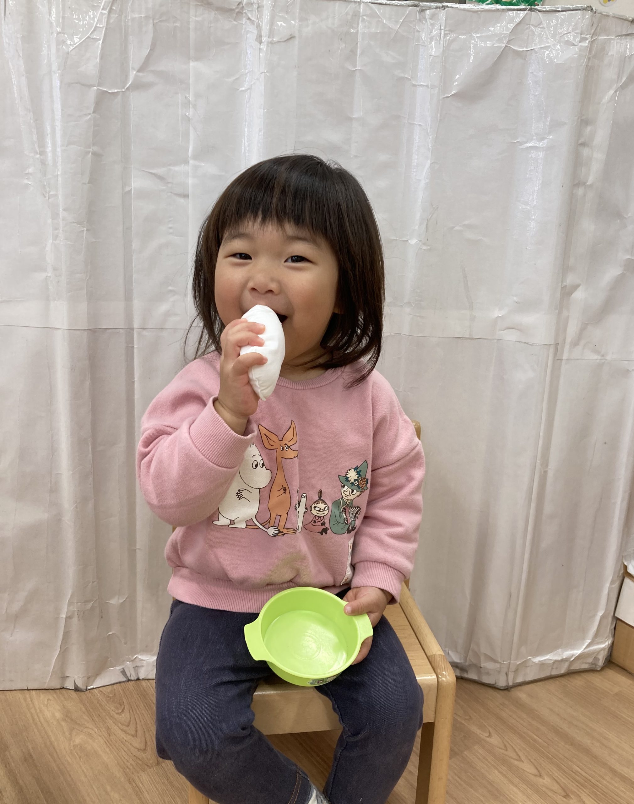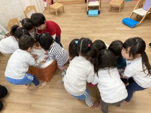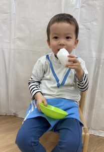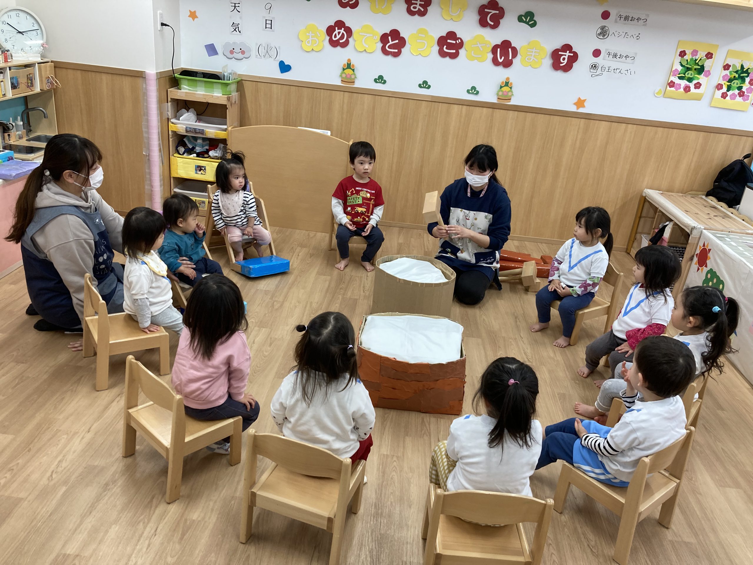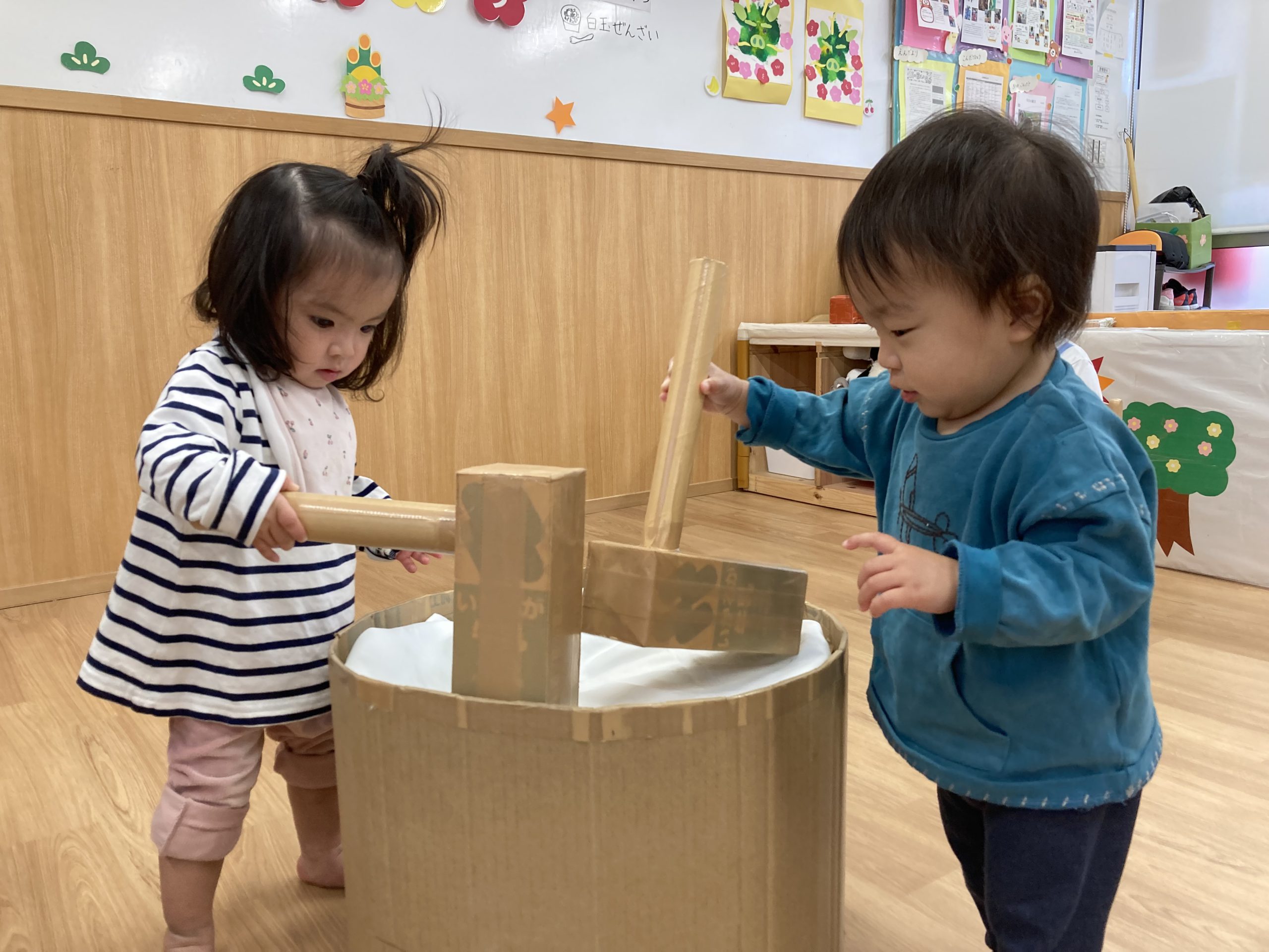 おもちつきごっこ🎶2024年1月9日(火) 新年あけましておめでとうございます。 本年もよろしくお願いいたします。 今日から子ども達も揃い新年がスタートしました🎵 今日は、早速おもちつきごっこを楽しみました🎶 「ぺったんこ それ ぺったんこ~~♪ 」もちつきの歌を歌いながら順番にお餅をついていきました🎵 みんなでついたおもちをこねこね~♬ 美味しいおもちができたかな~ 柔らかいおもちになったかな~ そして、食べてみました🎵 美味しそうに食べる子ども達でした♪ その後、天満宮へ初詣に行きました🎶 今年も健康で笑いの絶えない一年になりますように・・・ « 凧揚げ🎵 Merry Christmas🎅 »