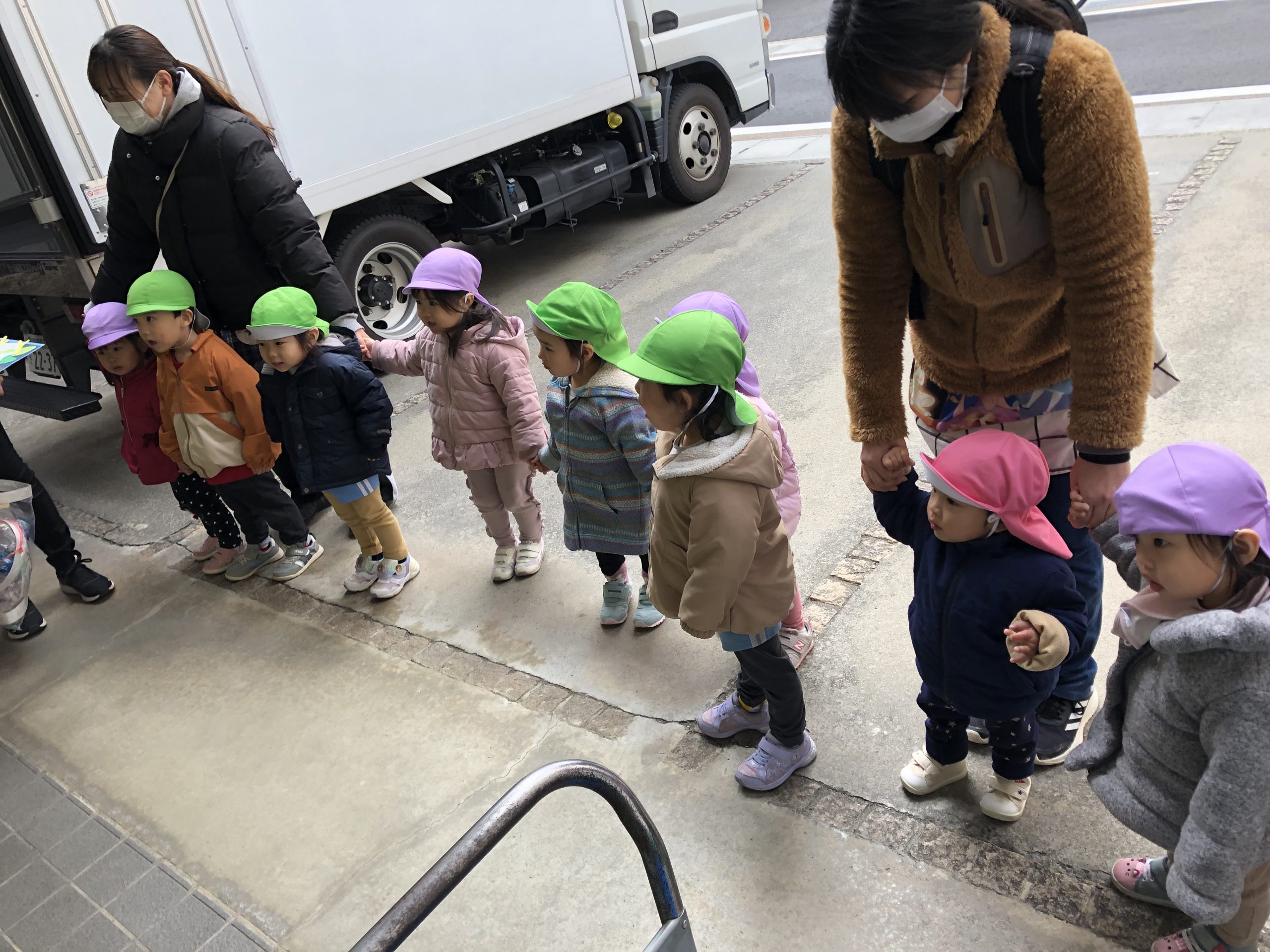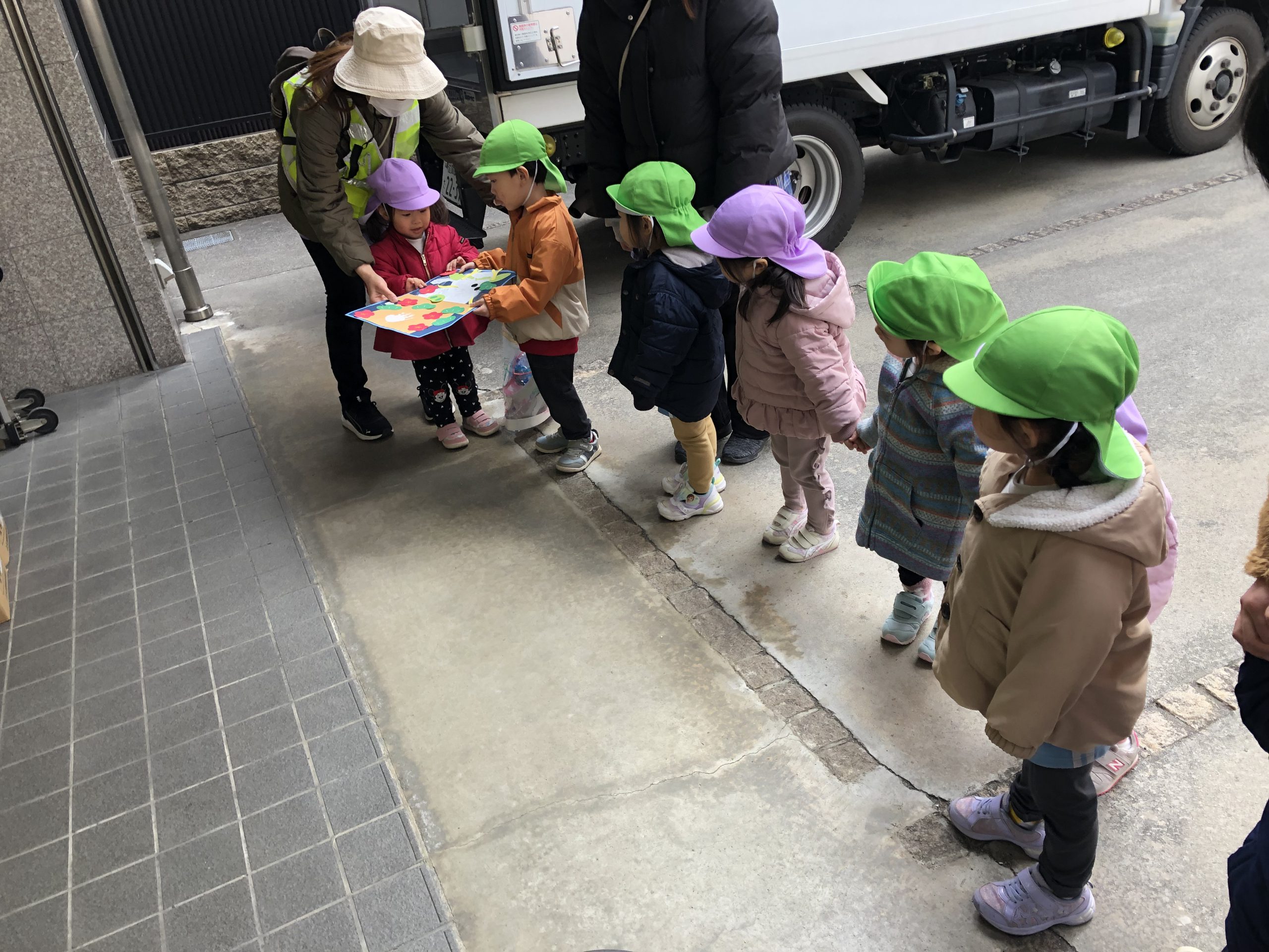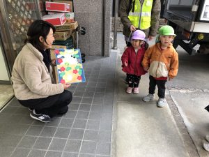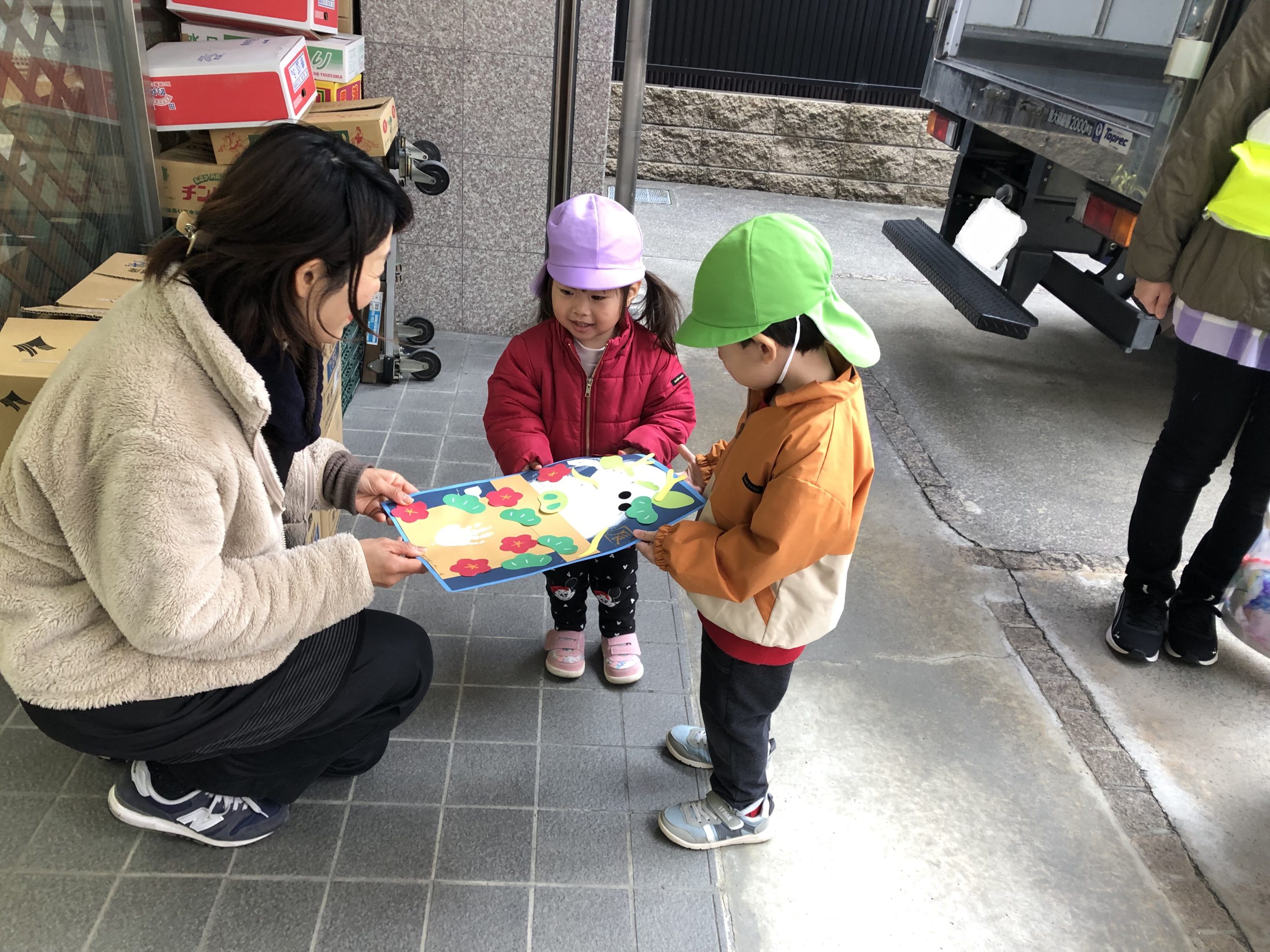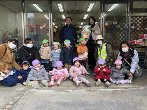 お礼を伝えに・・・2024年1月26日(金) 昨年の年末にえんどう食料品店さんよりみかんをいただきました🎶 美味しいみかんをいただいたお礼を渡しに行きました🎵 「えんどうさん所に行くよ~」の保育者の声掛けに子ども達は「えんどうさんえんどうさん」と言って大喜びでお外に行く準備を始めました♬ さぁ~えんどうさんに渡すよ♪ みんなで渡せないので、代表して2名の友達に渡してもらいました。 えんどうさんは、とても喜んでくださいました🎶 子ども達は大喜びです🎵 今年もよろしくお願いいたします。 みんなで“はいチーズ” その後、ひよこ組・こぐま組は、うの家に行って木の玩具で遊ばせていただきました🎵 子ども達は、夢中で遊んでいました🎶 ありがとうございました。 « 作品展♪ 凧揚げ🎵 »