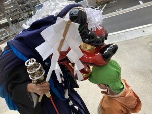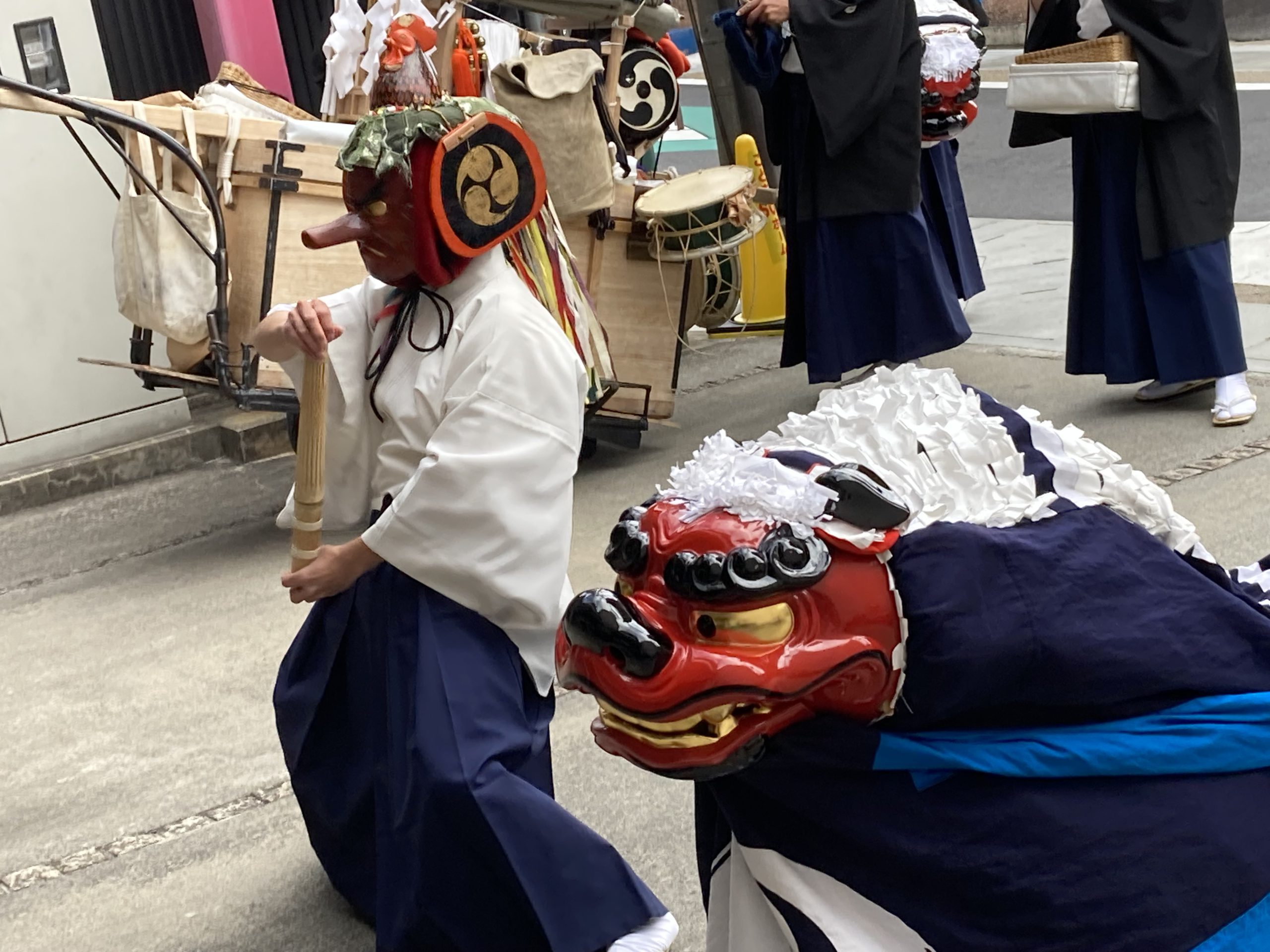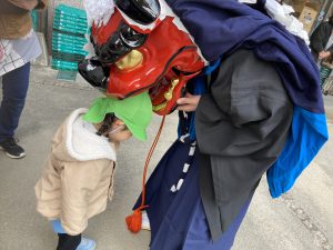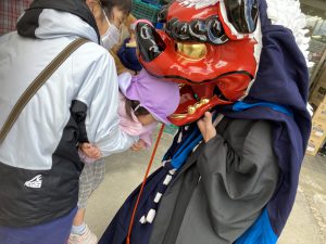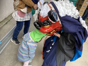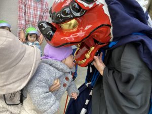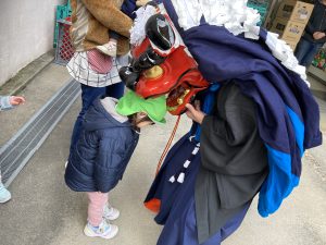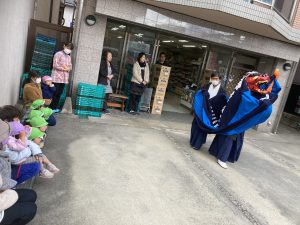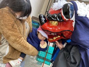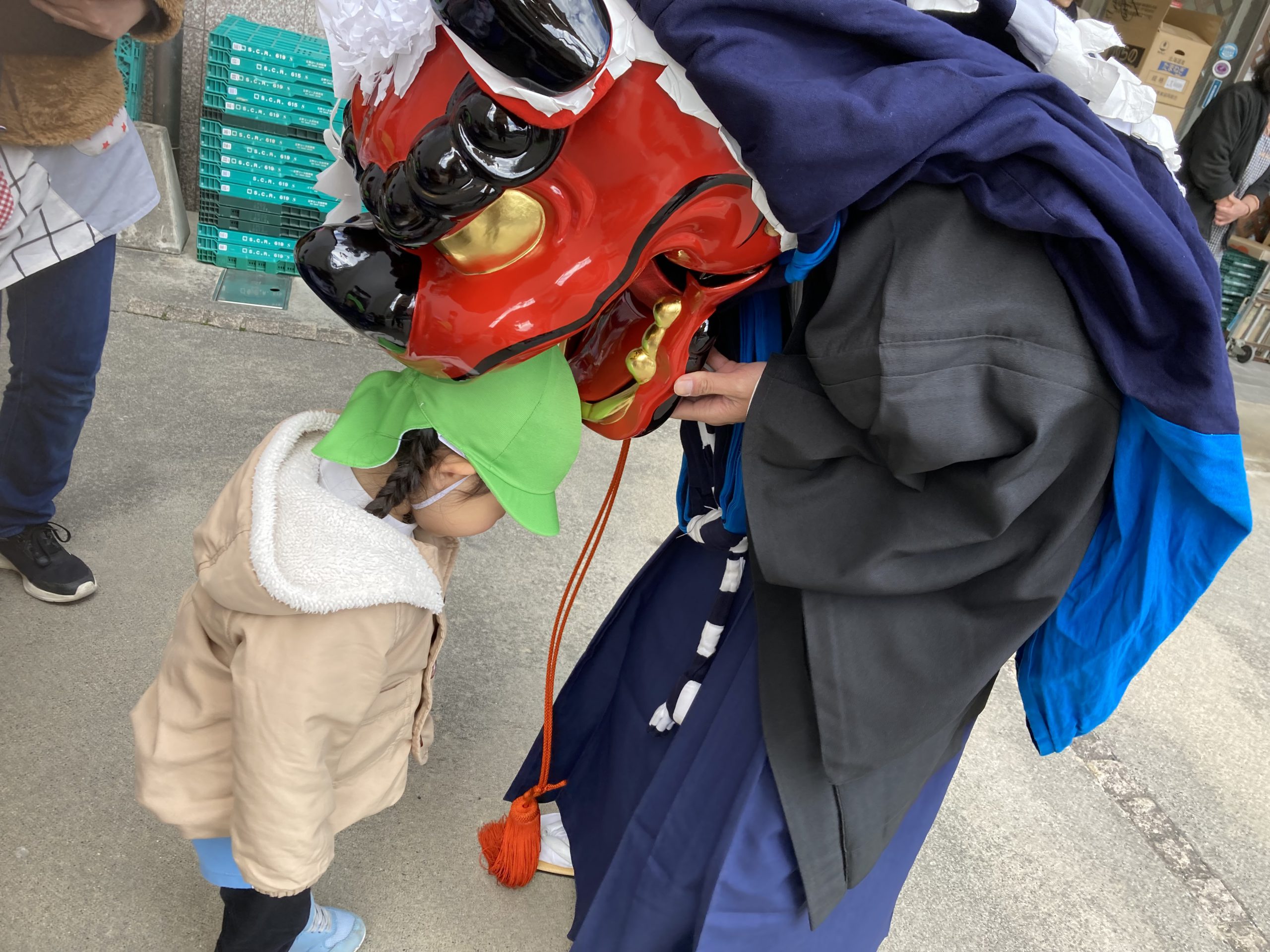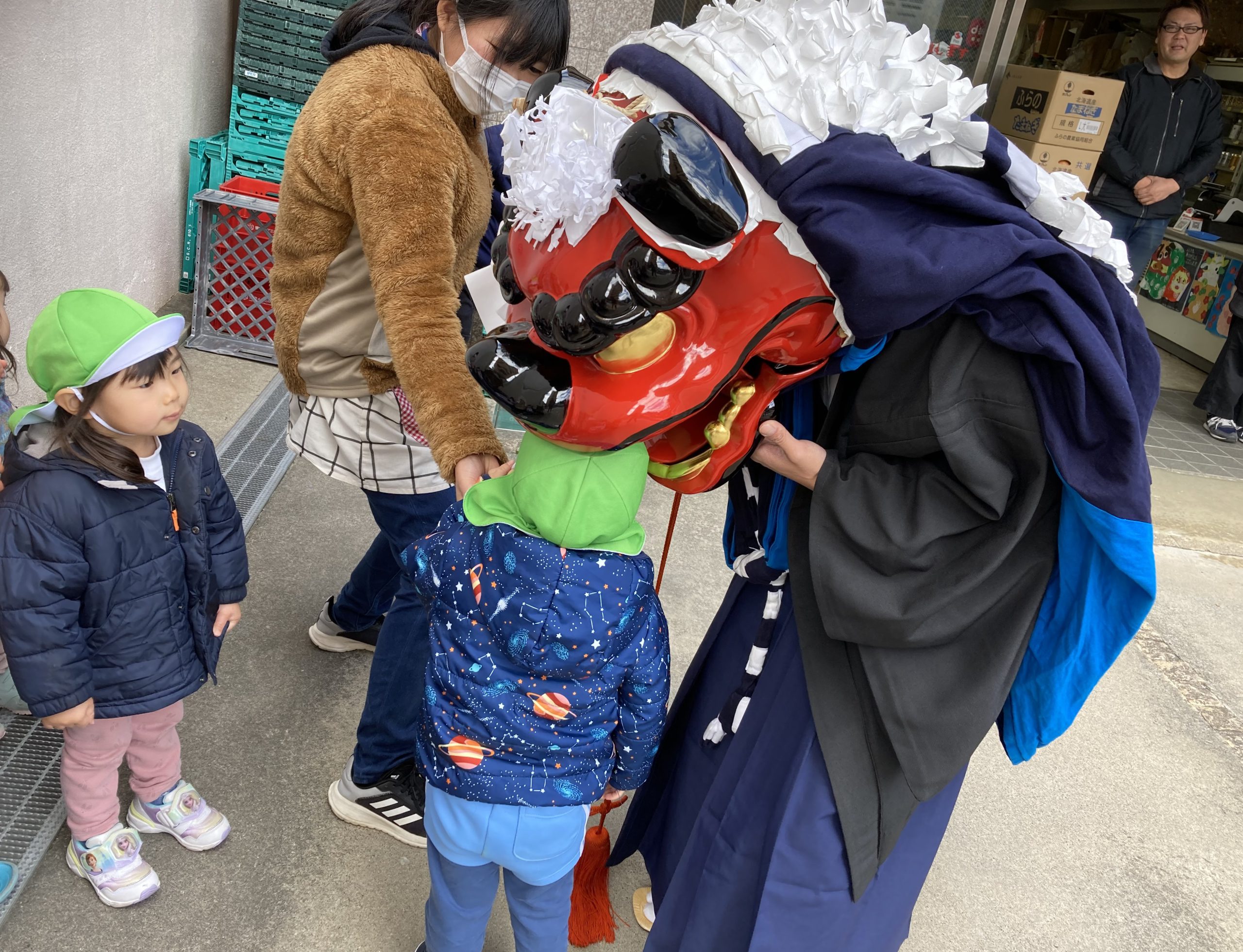 獅子舞🎵2024年2月7日(水) 今日は、えんどう食料品店さんに獅子舞がきました🎵 みんなで獅子舞を見せてもらいました🎶 獅子舞の迫力に驚いていましたが少しずつ慣れ 最後は、頭を嚙んでもらいました🎵 獅子舞に頭を噛んでもらうと、その人についた邪気を食べてくれるそうです。子どもの場合は、厄除け効果もあり、学力向上や無病息災などのご利益があると言われています。 えんどう食料品店さん、貴重な経験をさせていただきありがとうございました。 « 2月の誕生会🎂 豆まき👹 »