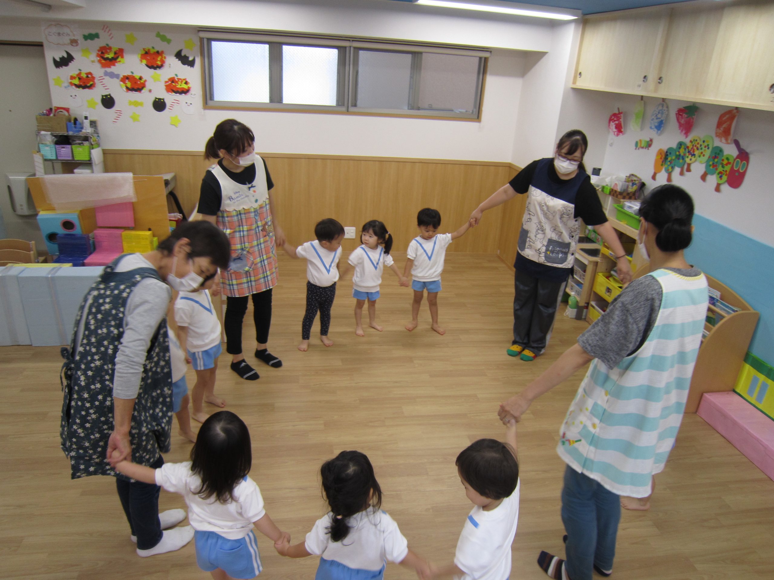 そして、最後に「みんなで手を~♪~」が流れてくると子ども達は手をつなぎます