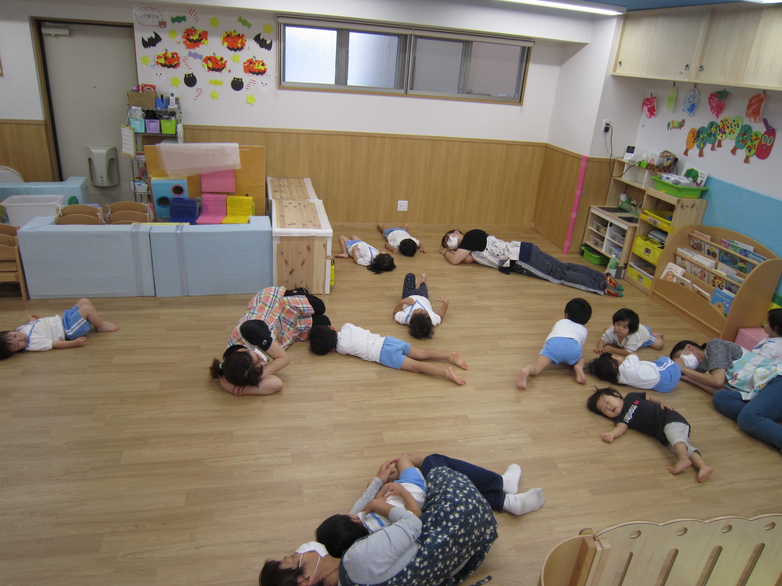 アンパンマン体操が終わると少し休憩・・・「ね~むれ~♪ ね~むれ~♪」の曲がかかり一斉に寝ています・・・