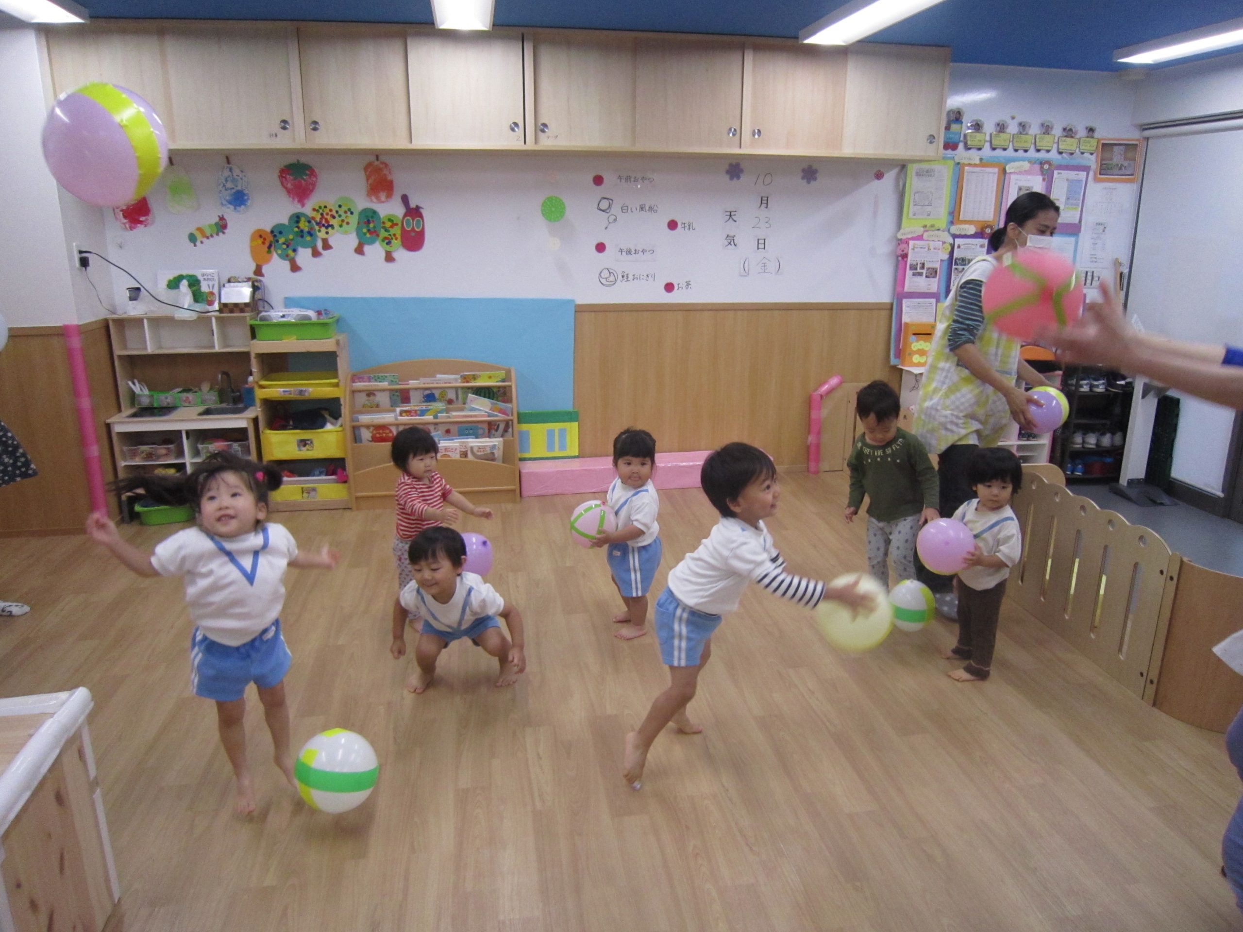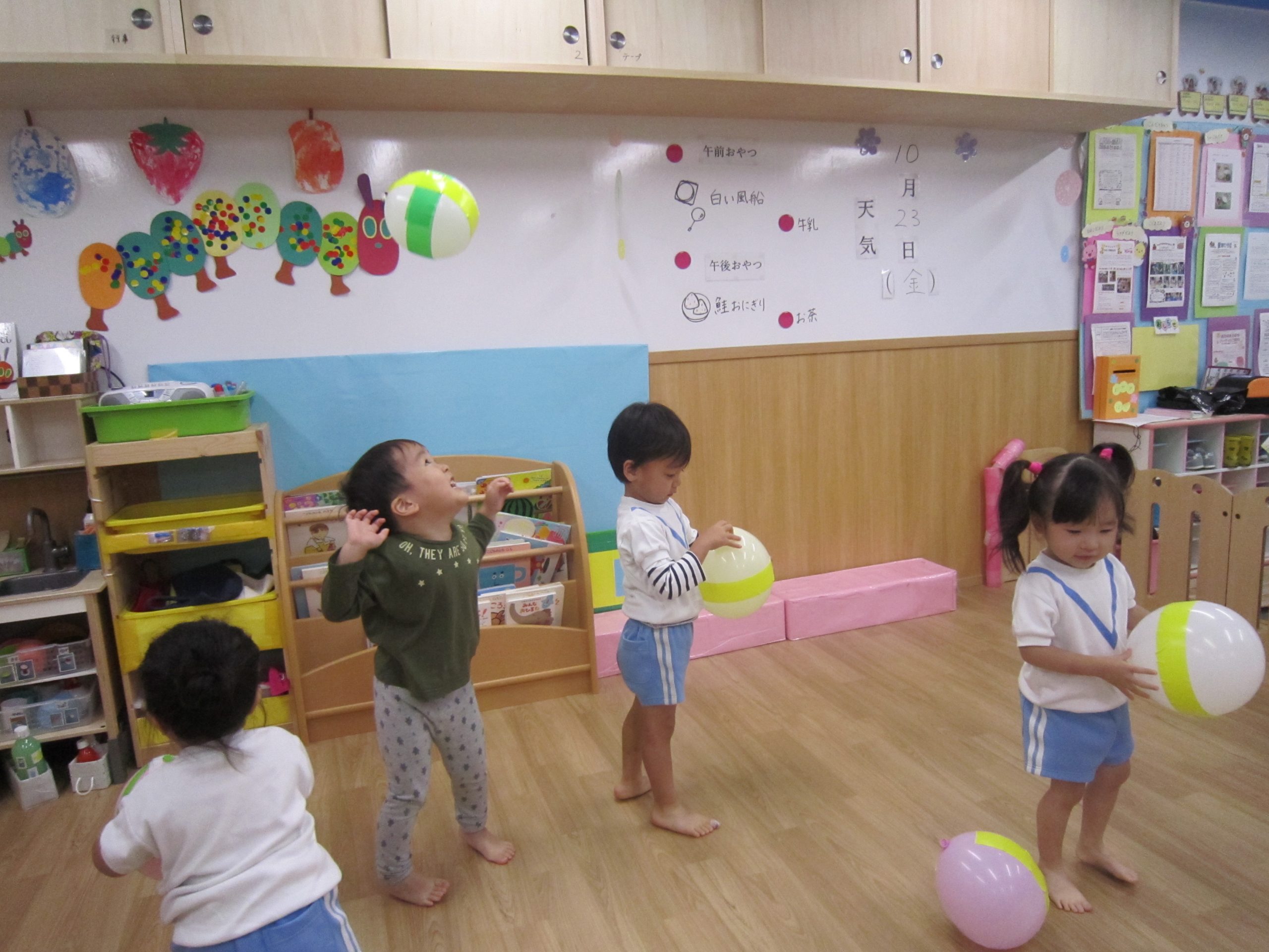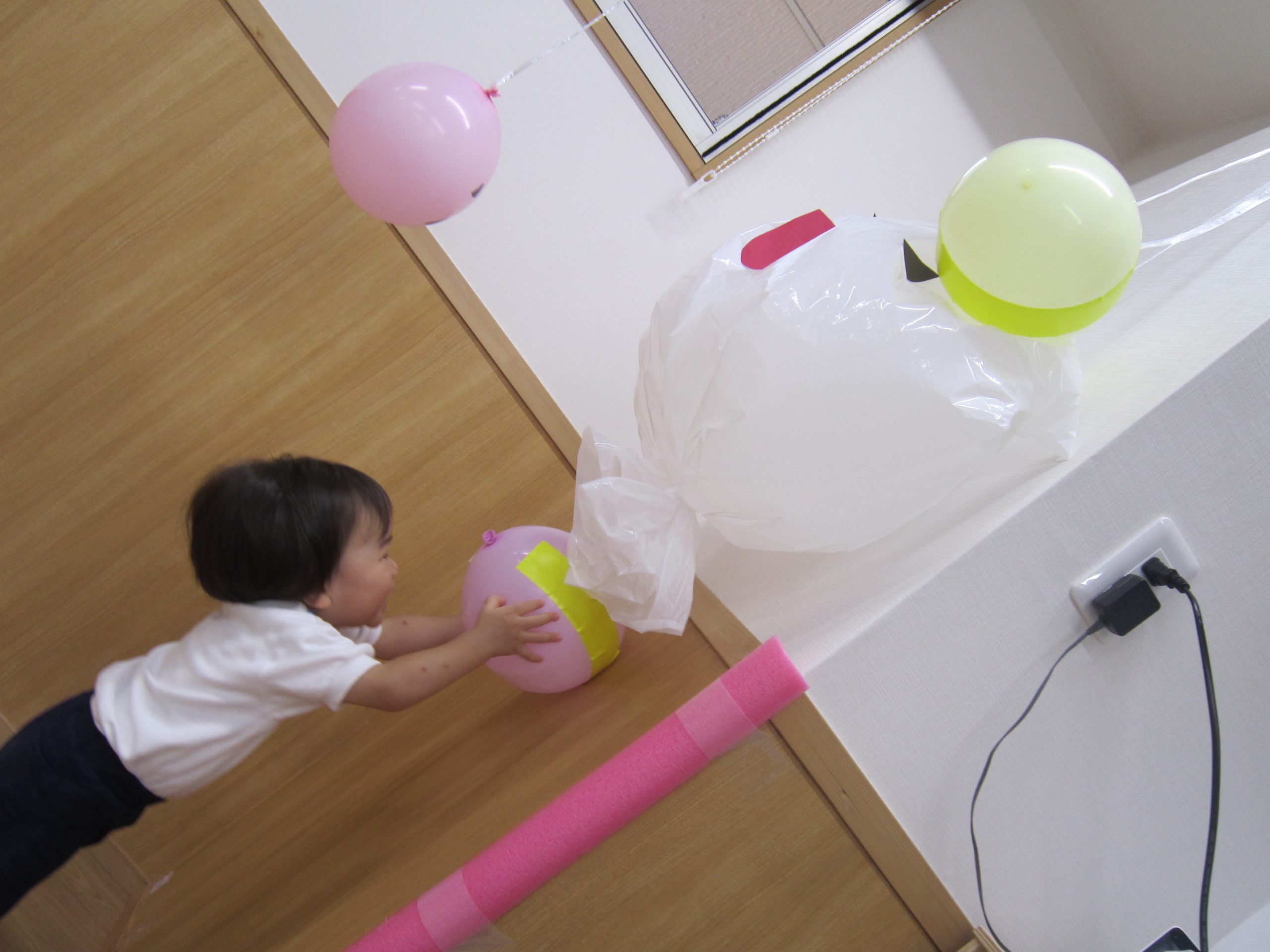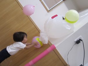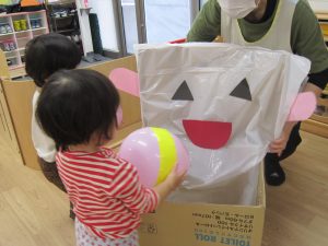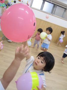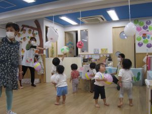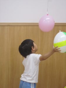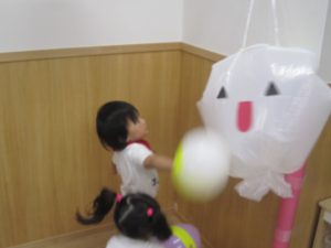 風船で遊ぼう!2020年10月23日(金) 今日はみんなで風船遊びをしました。 たかーく!たかーく!投げられるかな・・・ たくさん遊んだ後は・・・ おばけの登場!! 子ども達は風船を持っておばけ退治をしています。 「せーの」「えい」と言いながらおばけに向かって風船を投げています。 楽しかったね! おばけさんまた来てね! « ハロウィン♪ おおきくなったかな? »