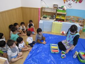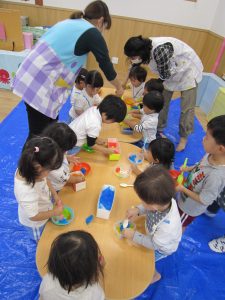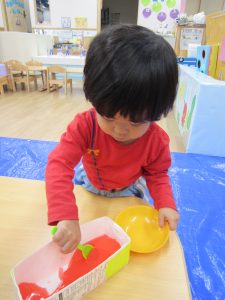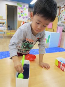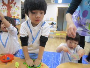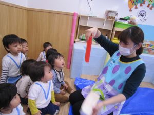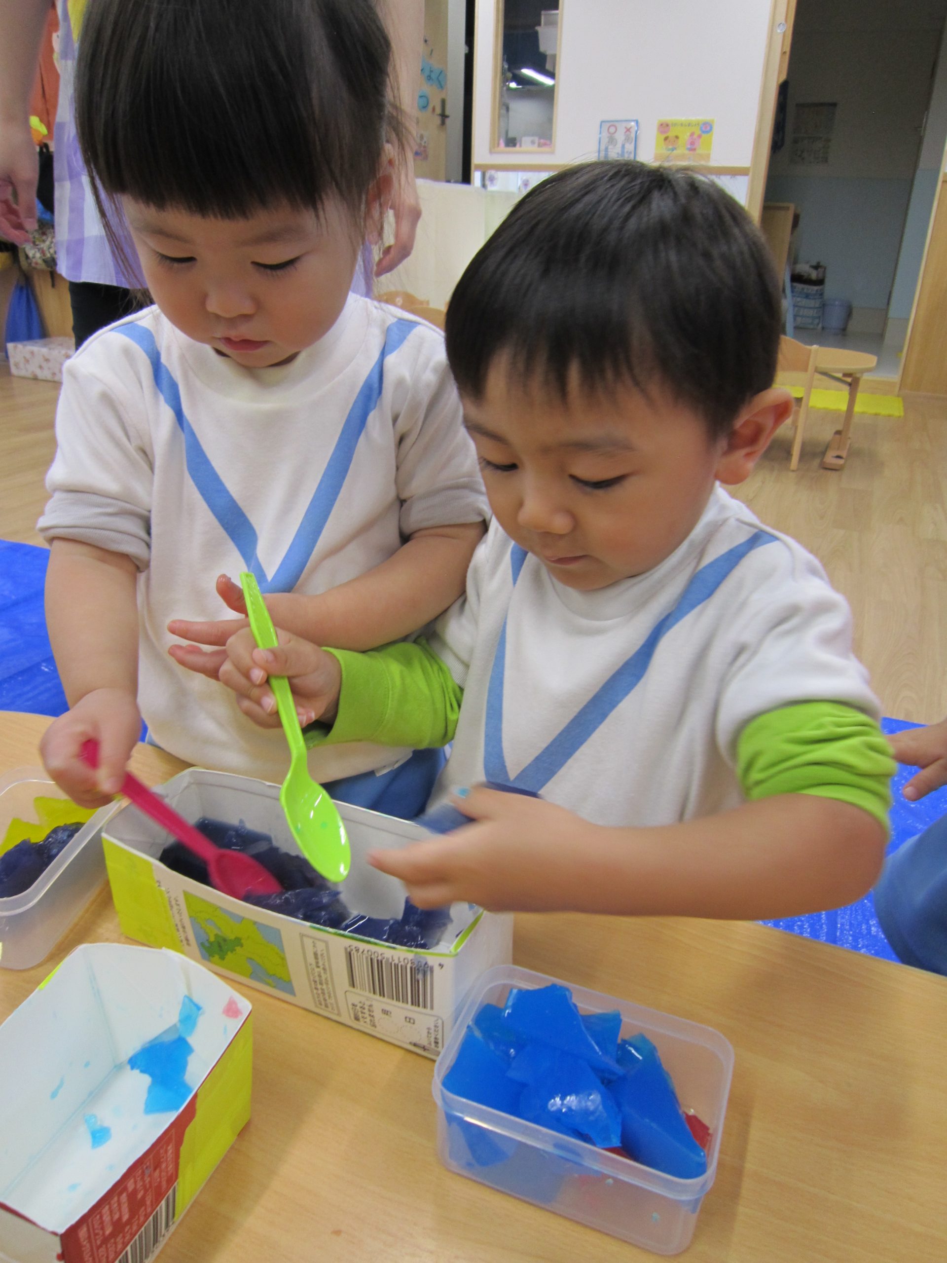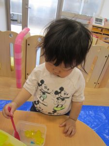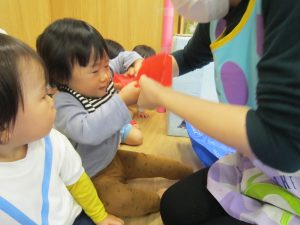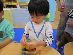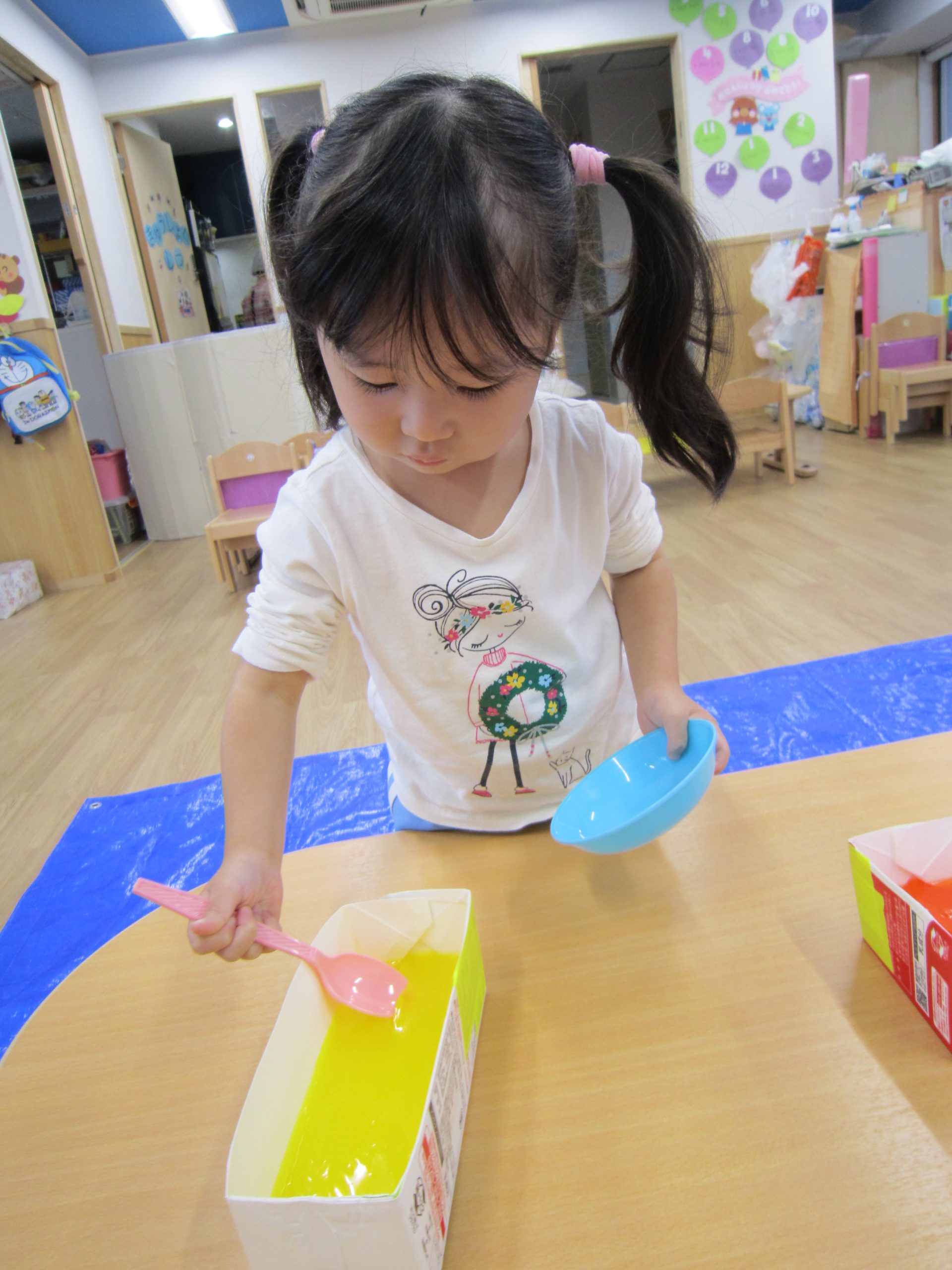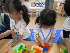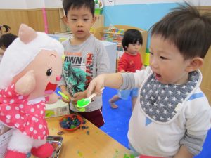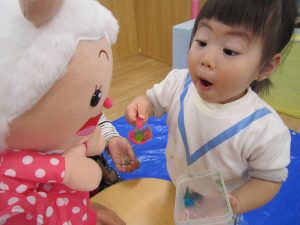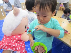 寒天遊び2020年11月17日(火) 今日はみんなで寒天遊びをしました。 まずは、スプーンですくってお皿やタッパーにいれて・・・ 次は寒天の感触を味わいました。 最後に人形のめいちゃんに、どんぐりや葉っぱで飾り付けした寒天を 「はい、どうぞ!」 めいちゃんも嬉しそう! 次は、どんなご馳走を作ろうかな・・・ « 避難訓練(地震) 下井田公園 »