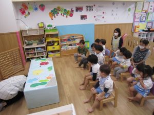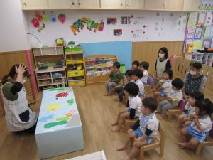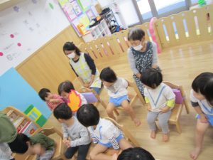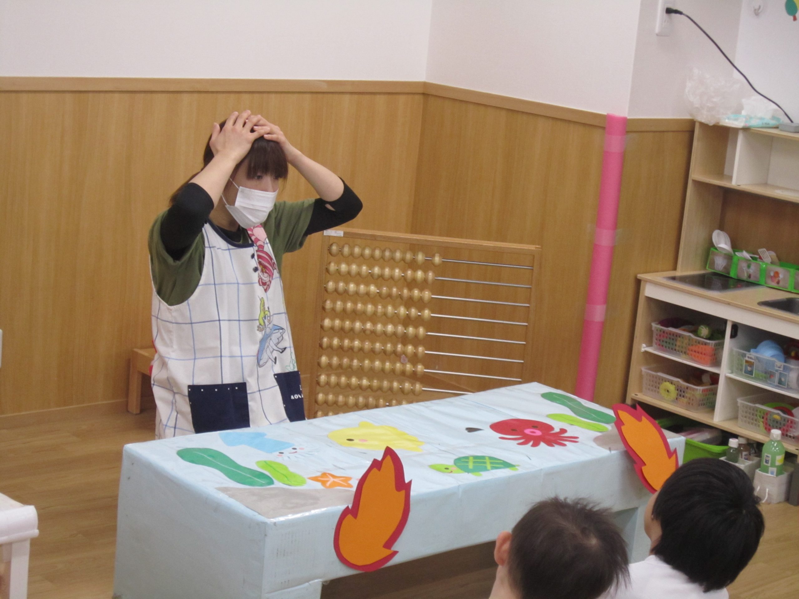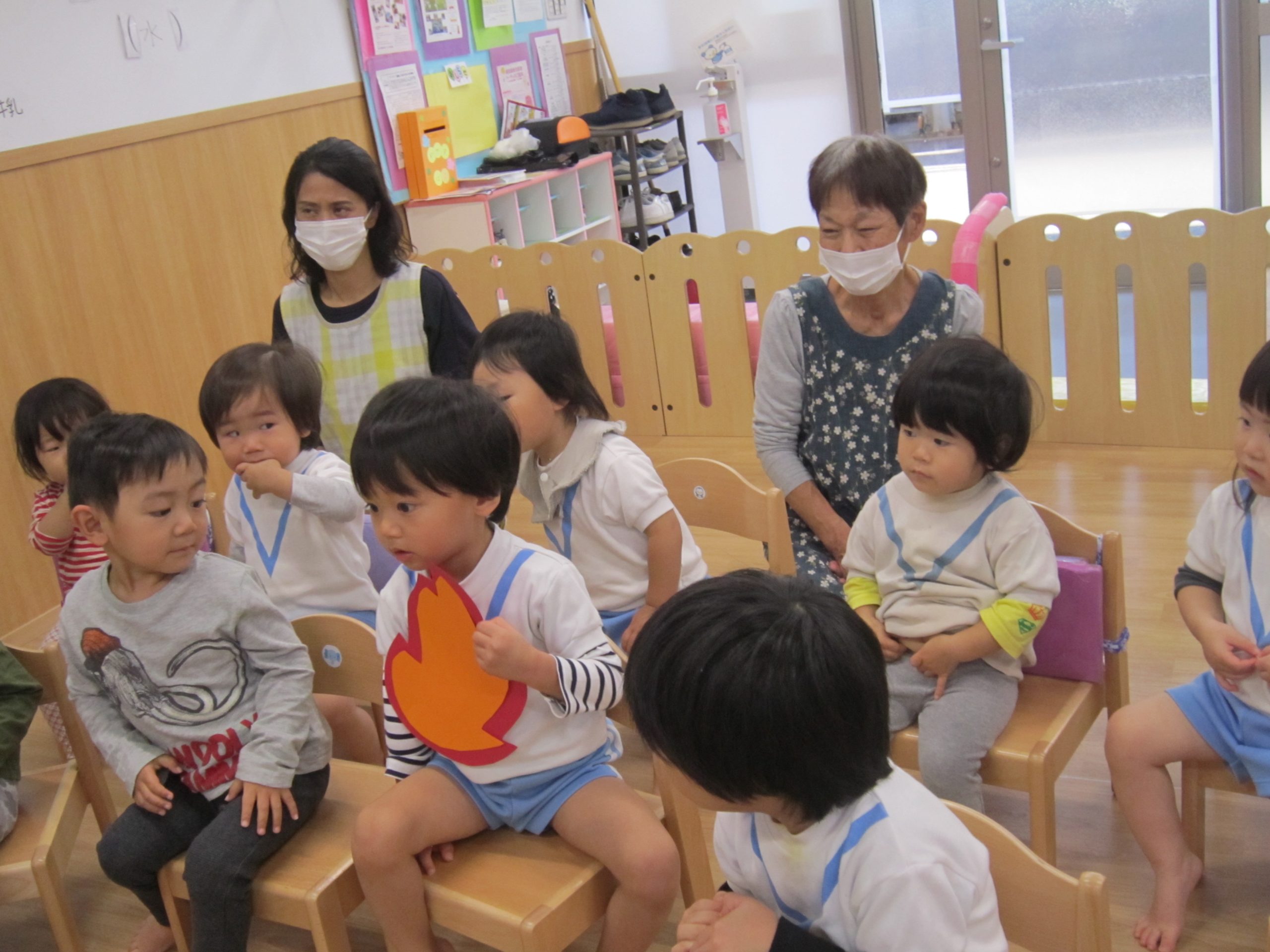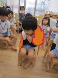 避難訓練(地震)2020年11月18日(水) 今日は地震の避難訓練がありました。 棚がガタガタと揺れて・・・保育者の「地震」「机の中に入って」 の声かけにより机の下に隠れました。 しかし・・時々子ども達が机の下からこっそりとでてきてました・・・・。 訓練後は保育者の話を聞いて 「頭」を隠すことや 机の下に隠れる そして地震の後、火事が起こることも教えてもらいました! 「熱いよ・・・」 地震や火災に備えて、避難訓練をしっかりとしていこうね! « さんぽ 寒天遊び »