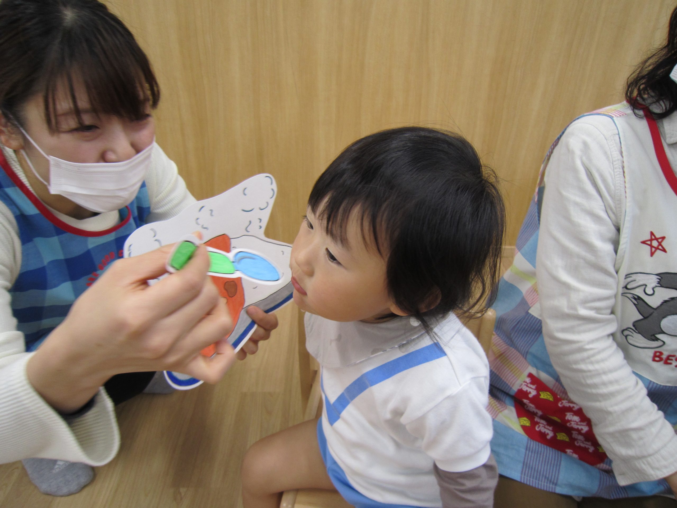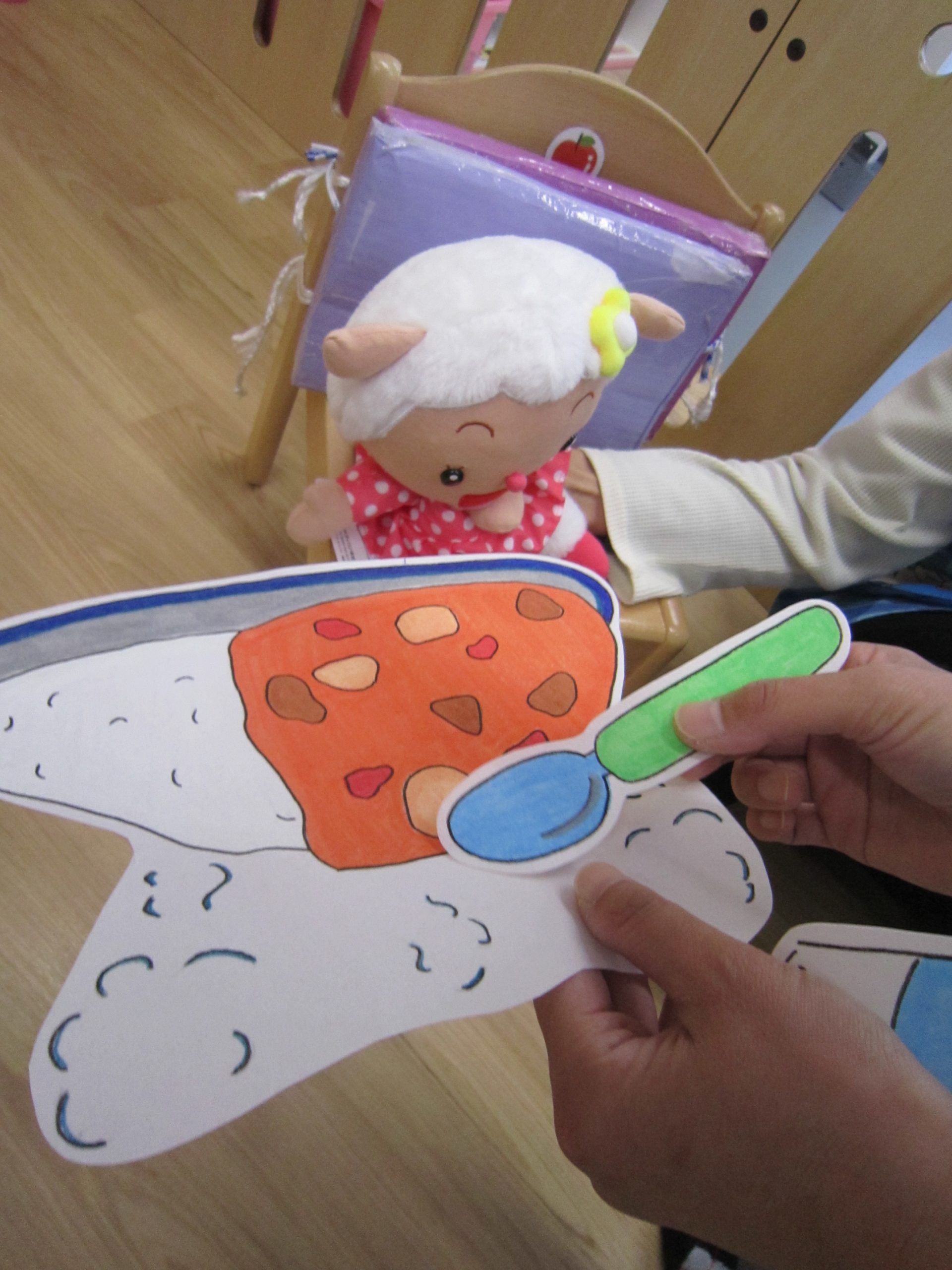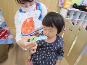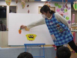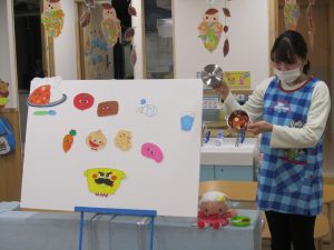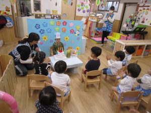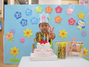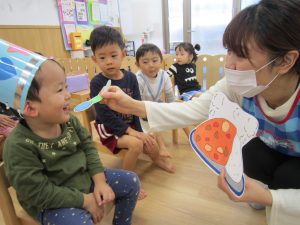 誕生会2020年11月27日(金) 今日は11月の誕生会がありました。 誕生児は1人です。 「好きな食べ物は?」「好きな遊びは?」など質問に答えていました。 友達から“ハッピーバースデー♬”の歌と「おめでとう」と拍手のプレゼントをもらいました! 保育者からの出し物は“カレーライス”のパネルシアターのでした。 「カレーライスをどうぞ!」 めいちゃんにも「ハイどうぞ」 お誕生日おめでとう! « おおきくなったよ! クリスマスツリー »
