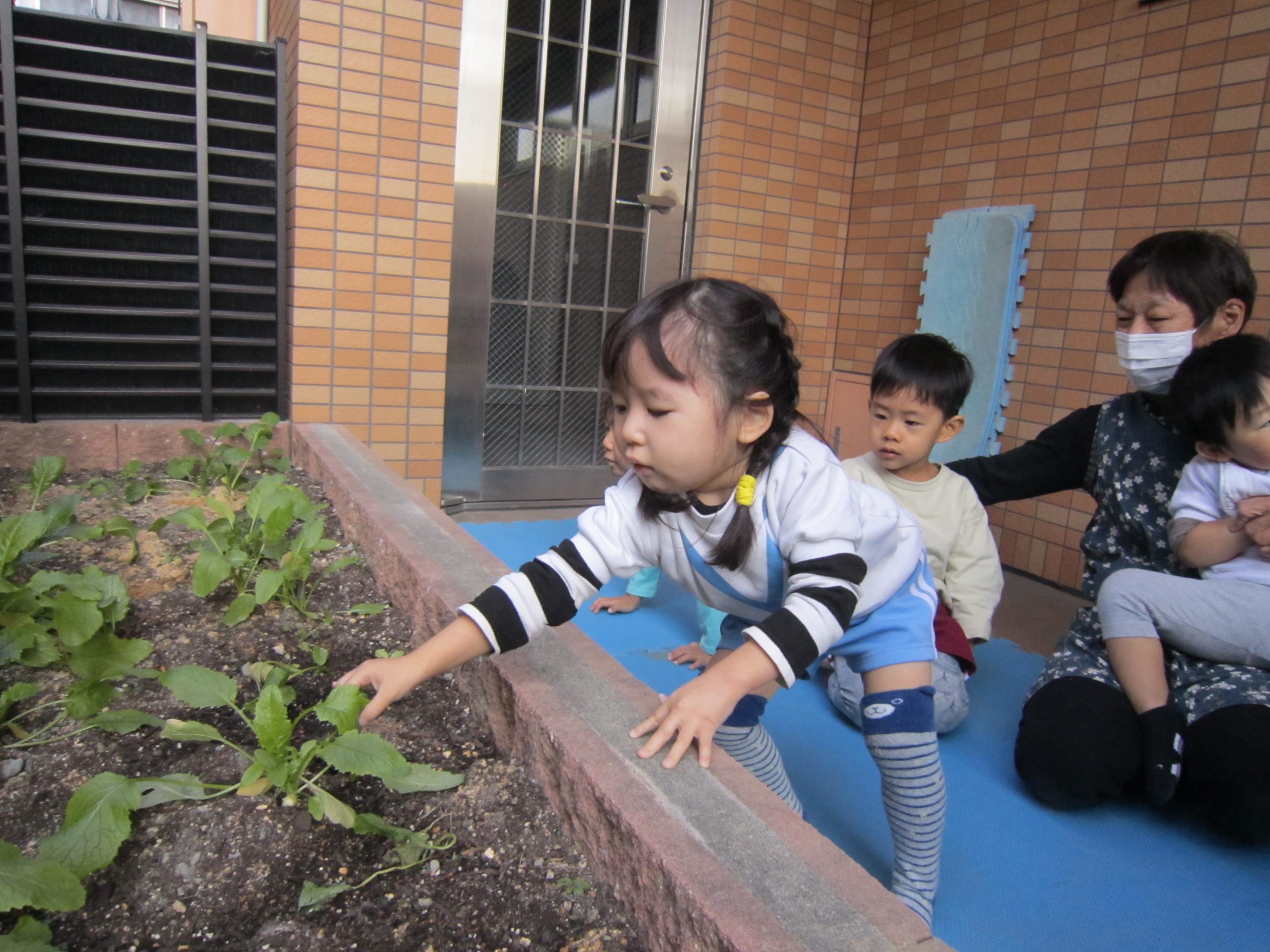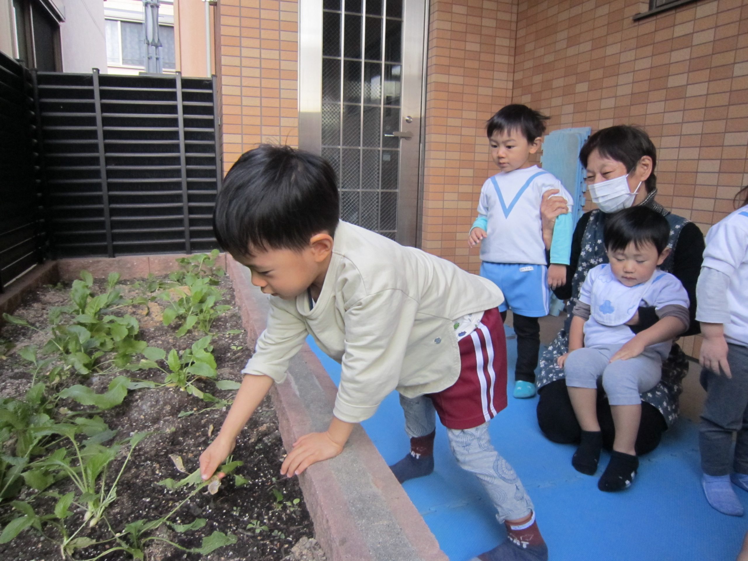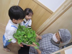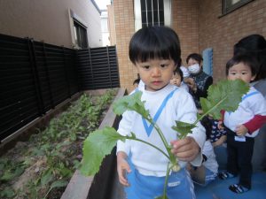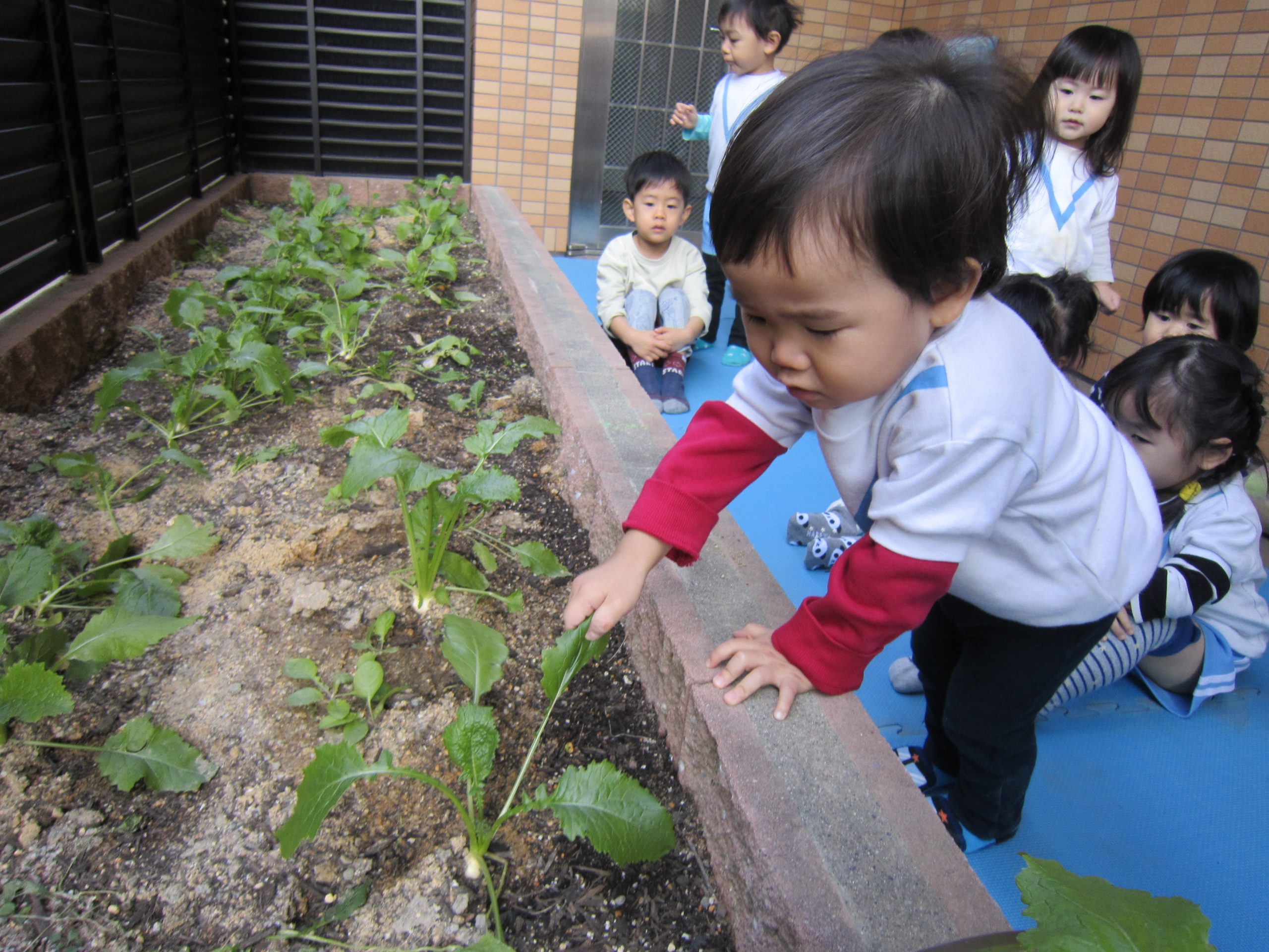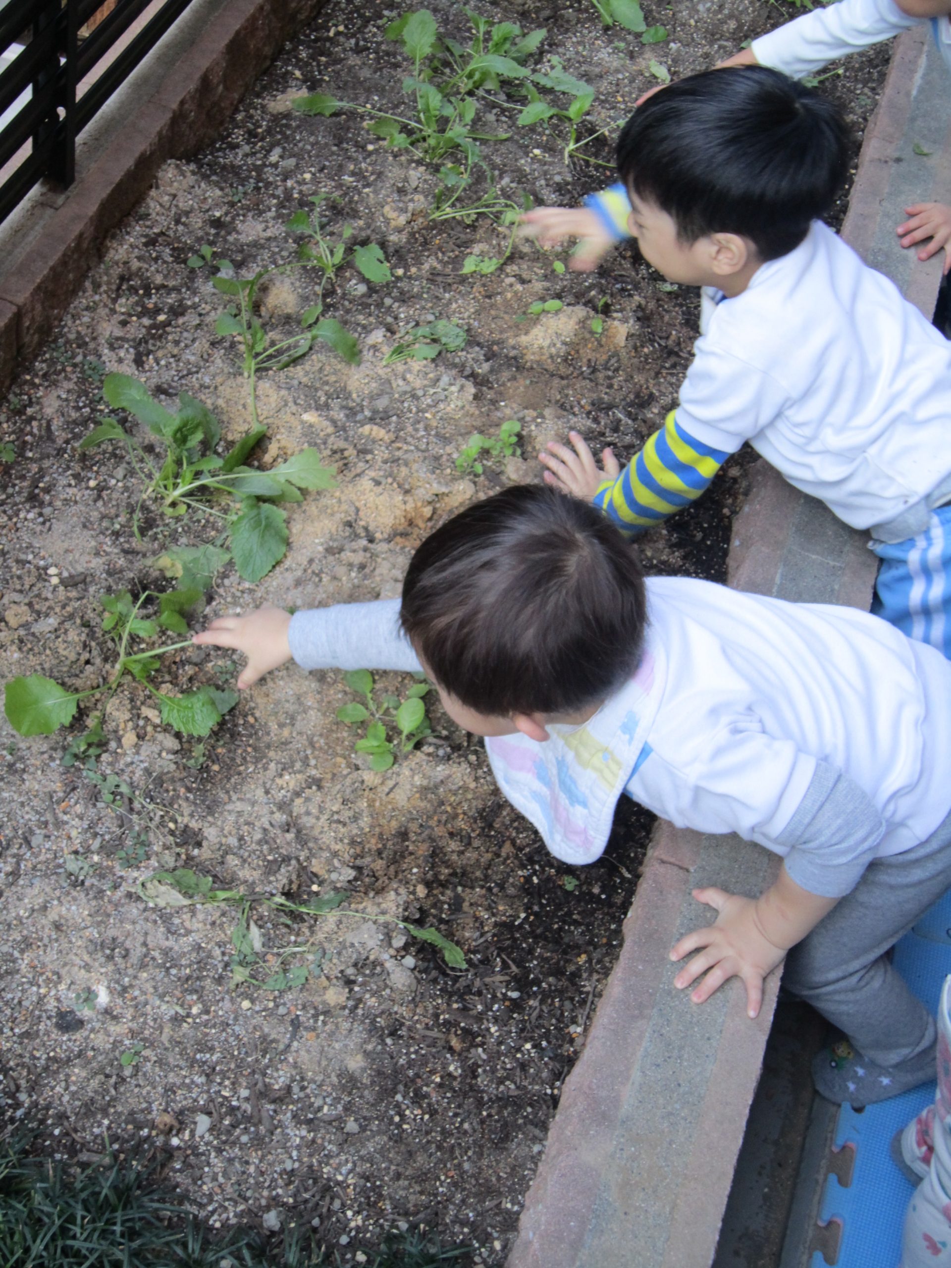収穫2020年12月22日(火) 今日は、みんなで大切に育ててきた小カブを全部抜きました! 「うんとこしょ どっこいしょ」 こんなに大きくなりました! お当番さんが給食の先生に「おねがいします」と言って渡しにいきます。 最後にみんなでカブの歌♪を歌い、カブのスープが出来上がるのを心待ちにしています。 今日のスープの中には、なんと!カブが入ってます♪ 美味しくいただきました♪ « 避難訓練 誕生会 »