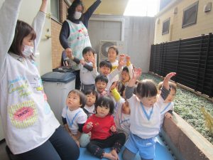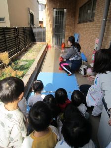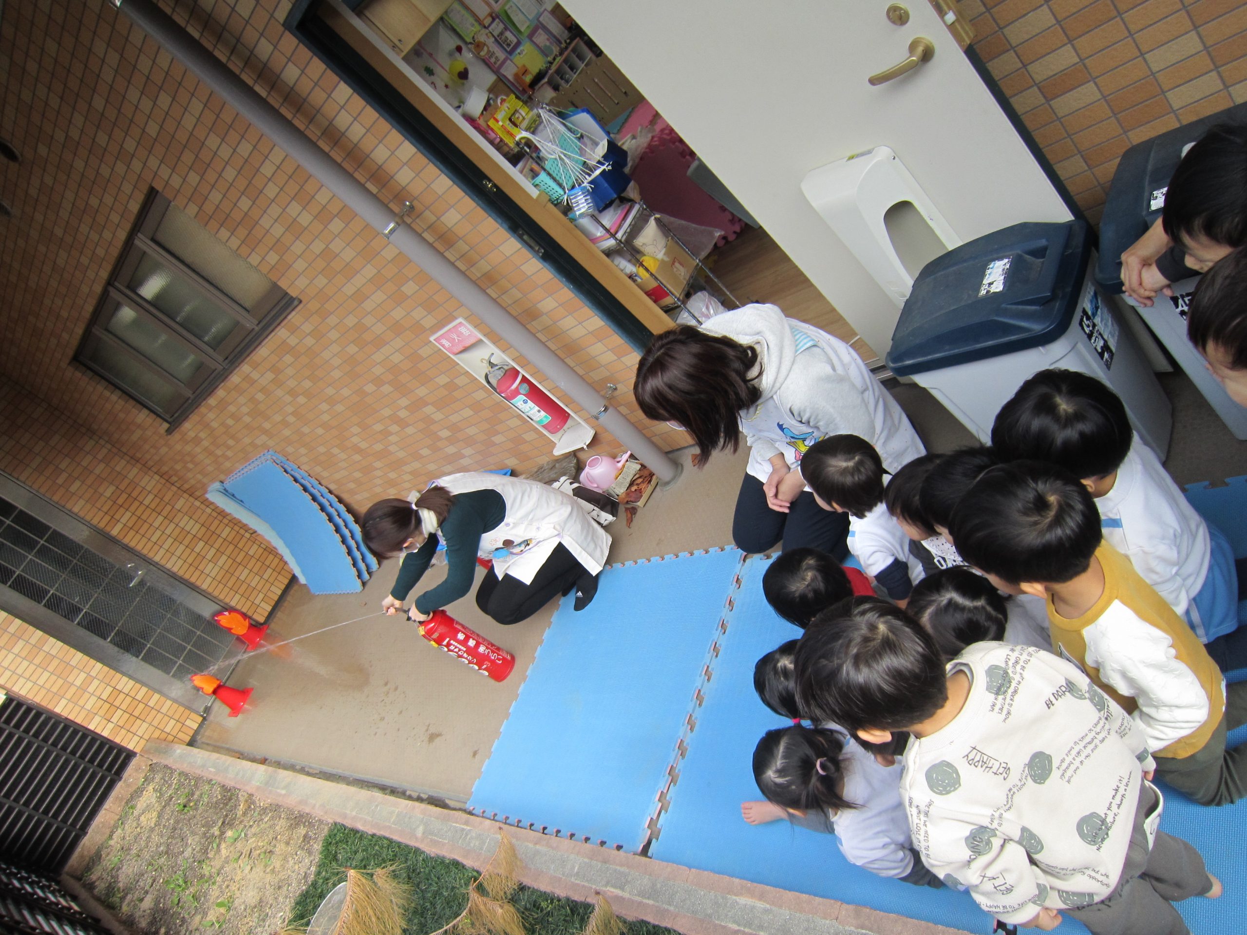 避難訓練2020年12月23日(水) 今日は避難訓練がありました! 「もえもえマン」の紙芝居を見ていると・・・ 突然!!保育者の「火事だ!」の声に大慌て・・・ 今日は第二避難場所の吉身小学校まで歩いて避難しました。 園に帰って来ると・・・・エントランスにもえもえマンが!! 職員が水消火器を使って消火しました。 もえもえマンの火を消したよ! 「やったー!」 火が消えてよかったね! いつ災害が起こるかわからないので、これかもしっかりと避難訓練をしていきたと思います。 « クリスマス会 収穫 »